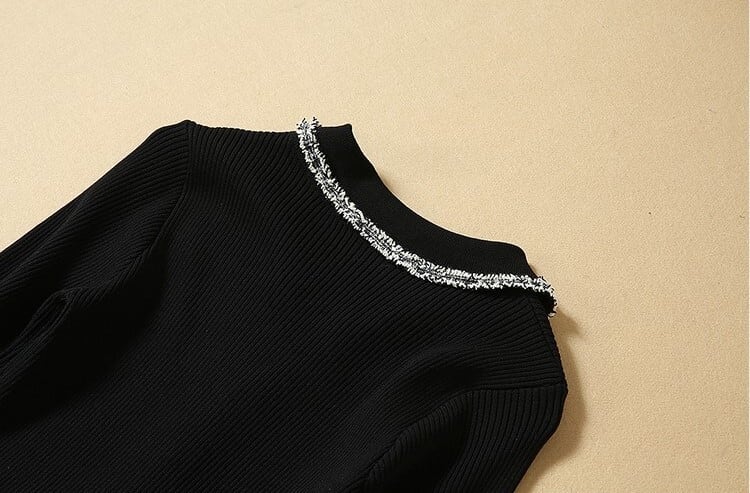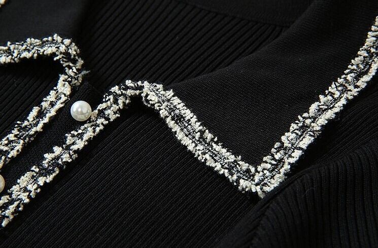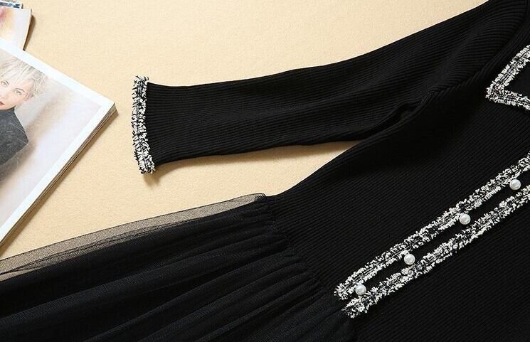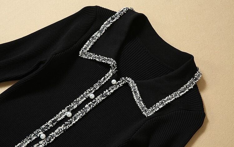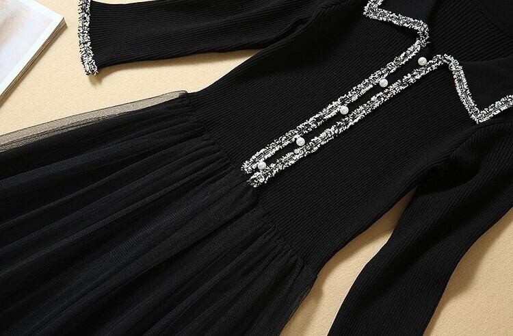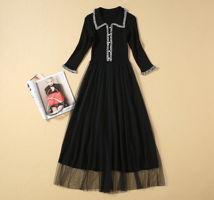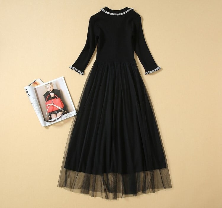 エレガントワンピース ニットドレス ブラックチュール 七分袖 開襟 フロントボタン Aライン 上品 華やか お呼ばれ お出かけ 韓国 オルチャン 秋 冬