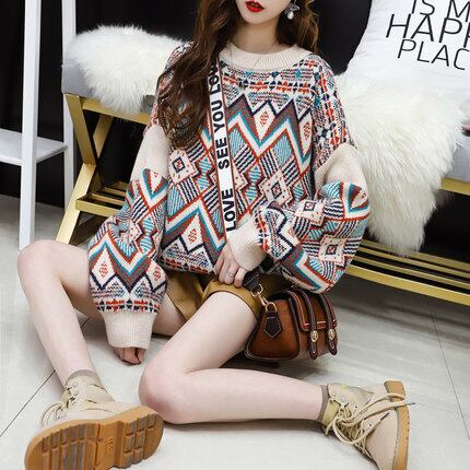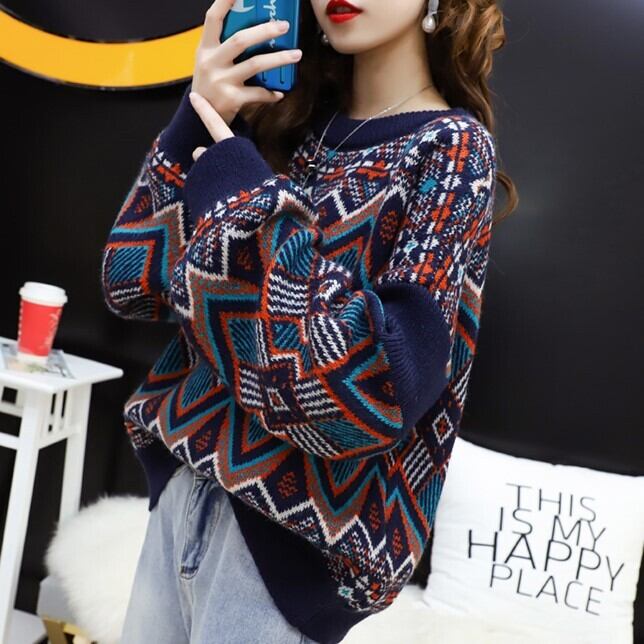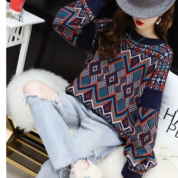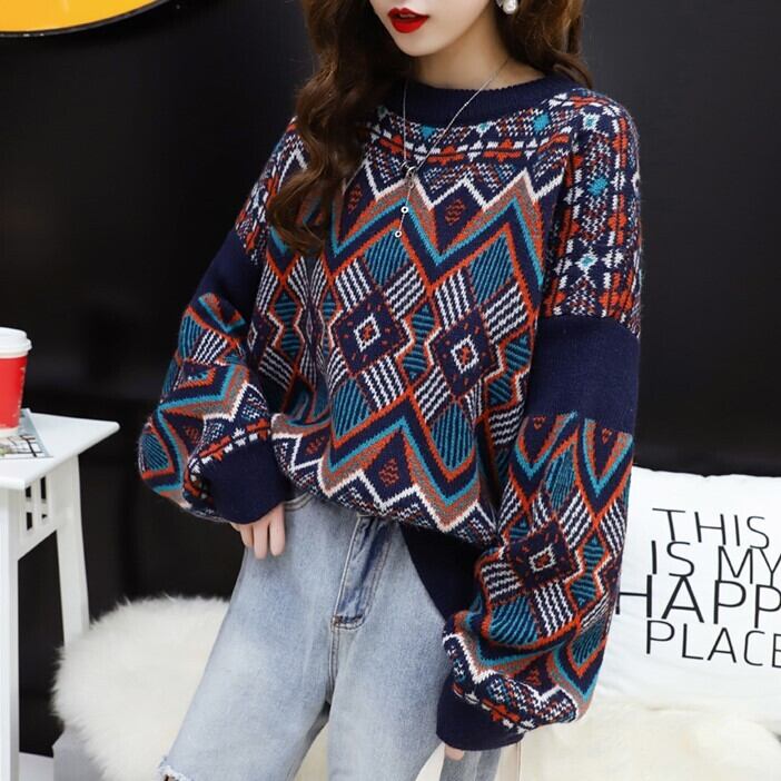 全2色 ランタンスリーブ セーター ニット トップス 幾何学模様 ラウンドネック 厚手 あったか カジュアル お出かけ デート こなれ感 個性的 秋冬