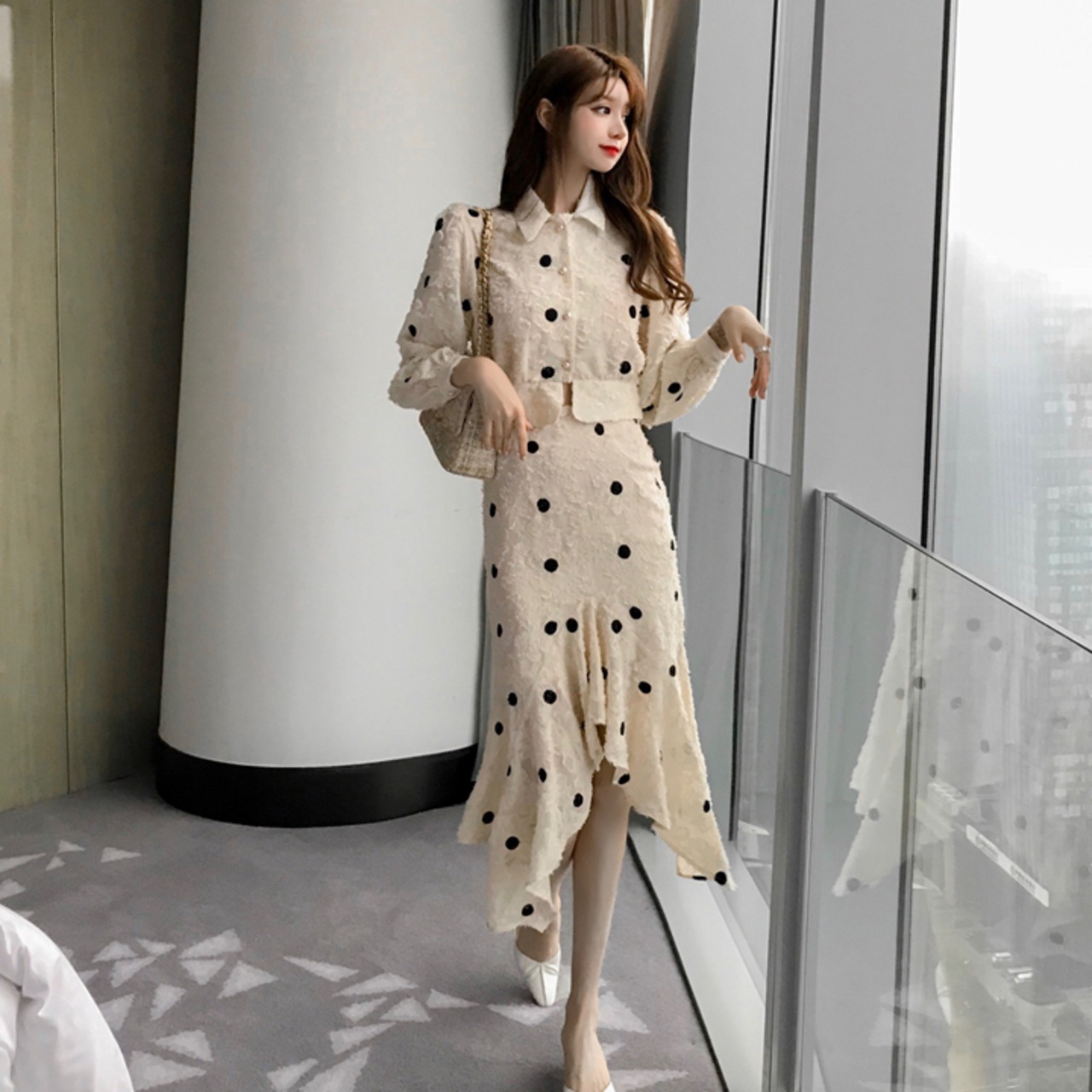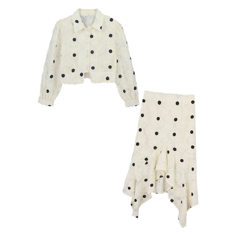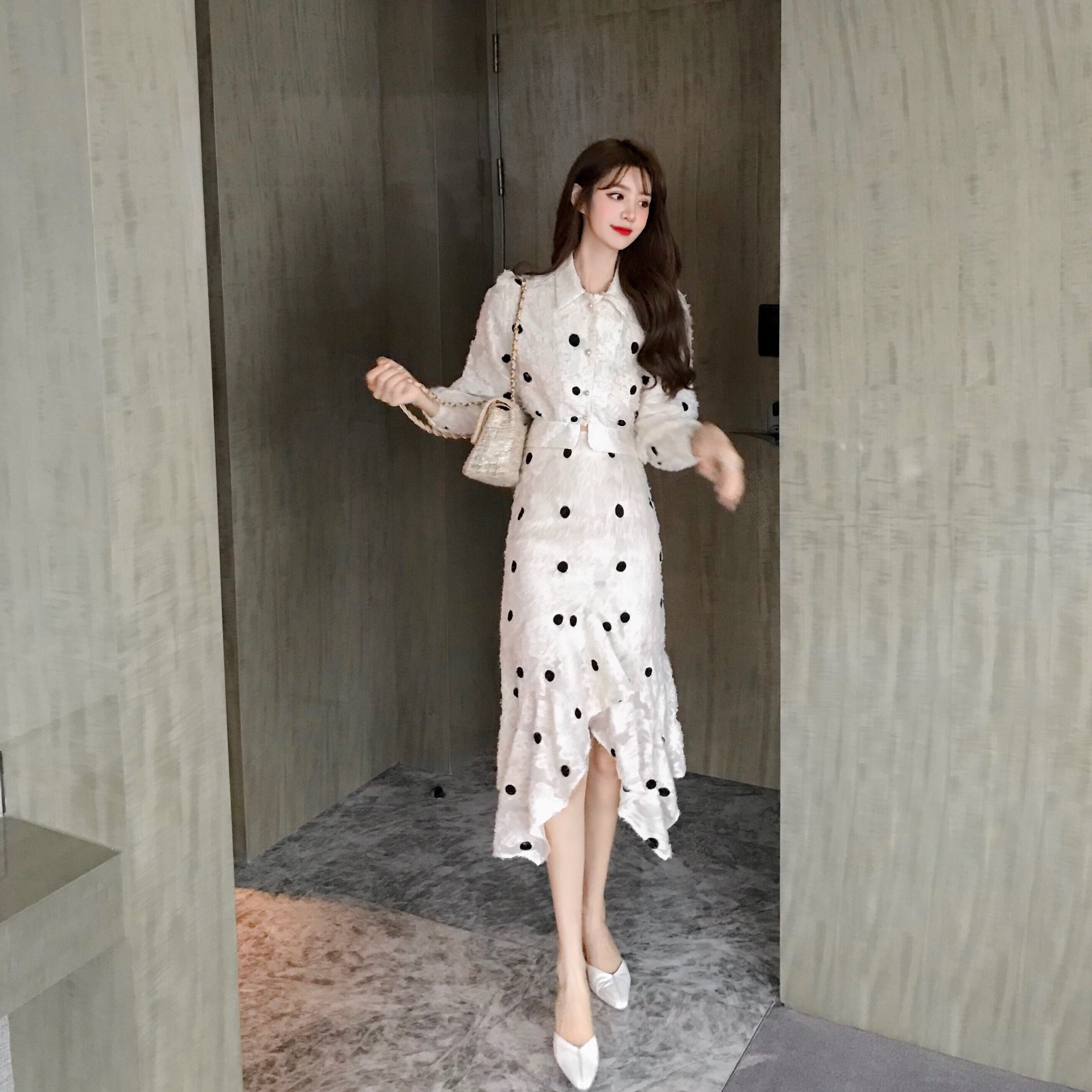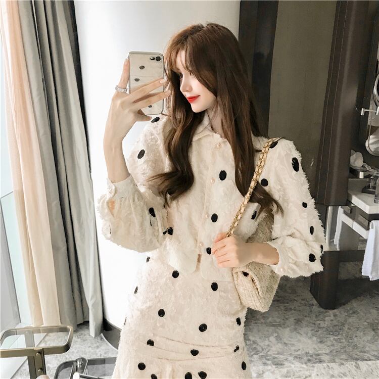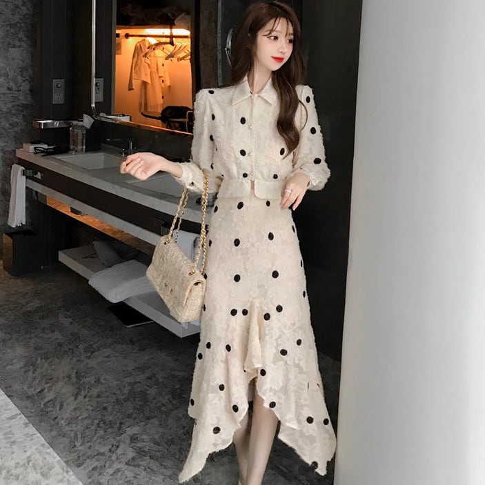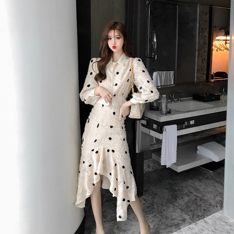セットアップ ツーピース ワンピース シャツ ハイウエスト スカート ドット柄 カジュアル 秋 冬 大人可愛い 韓国