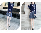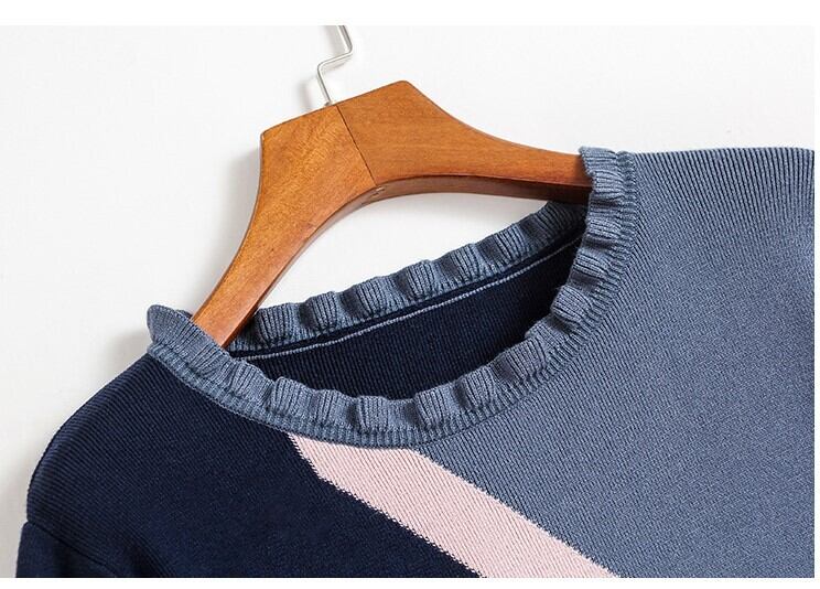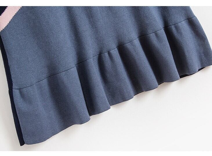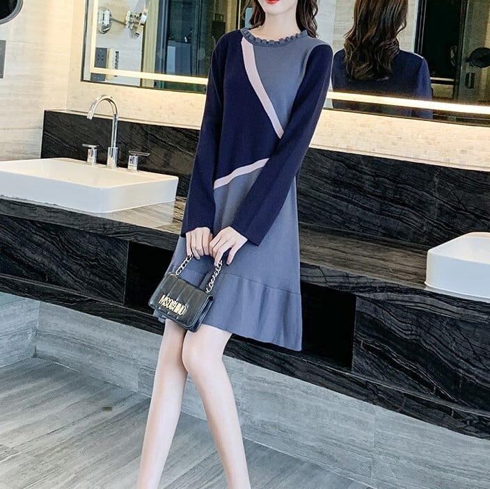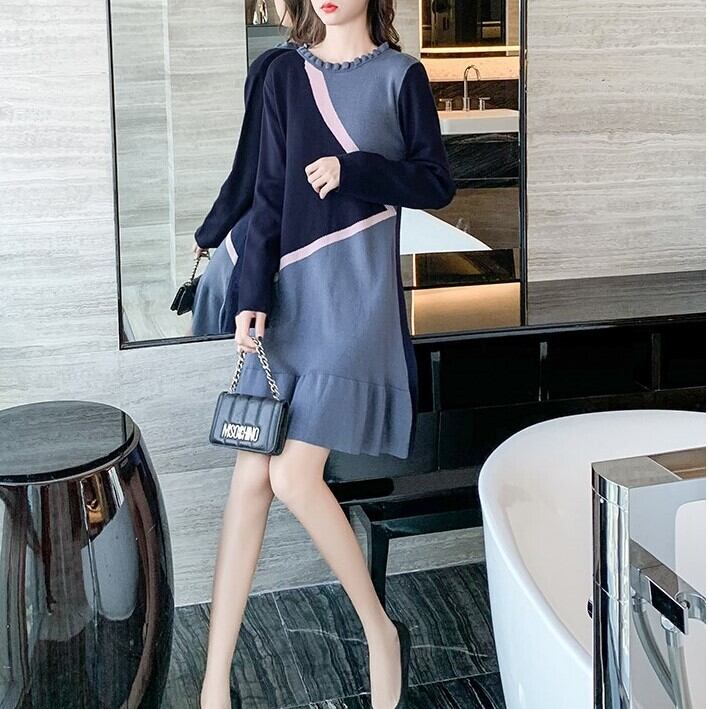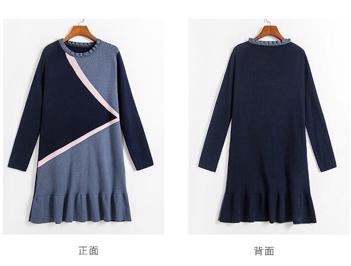 ワンピース ニットワンピース レトロ 長袖 ミニスカート ラウンドネック フリル フェミニン きれいめ カジュアル お出かけ デート オフィス 秋冬 ブルー