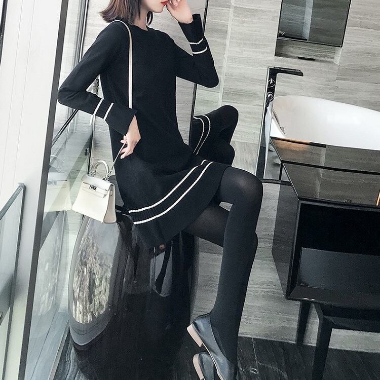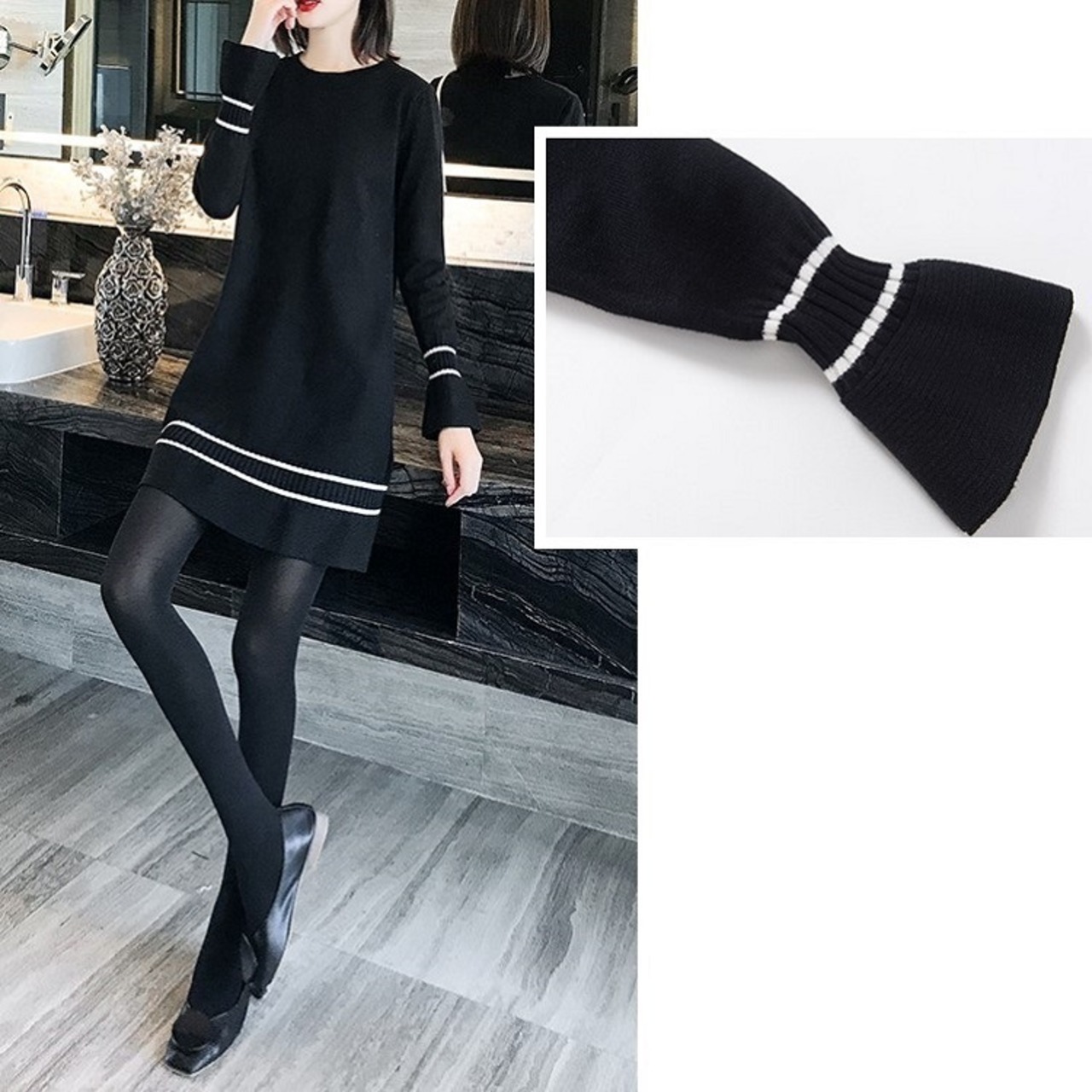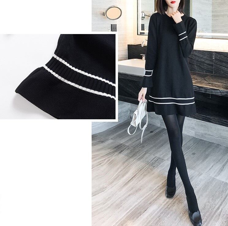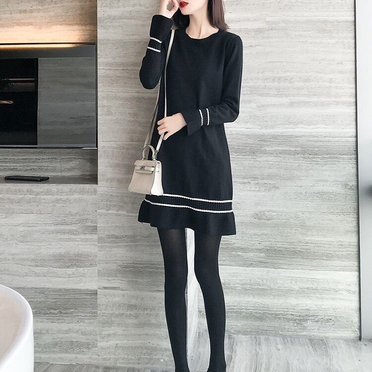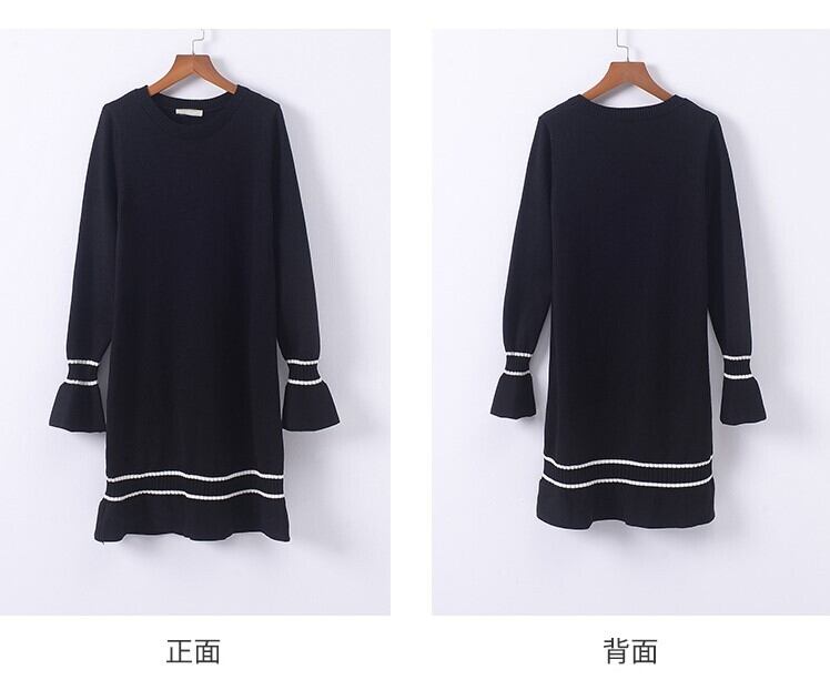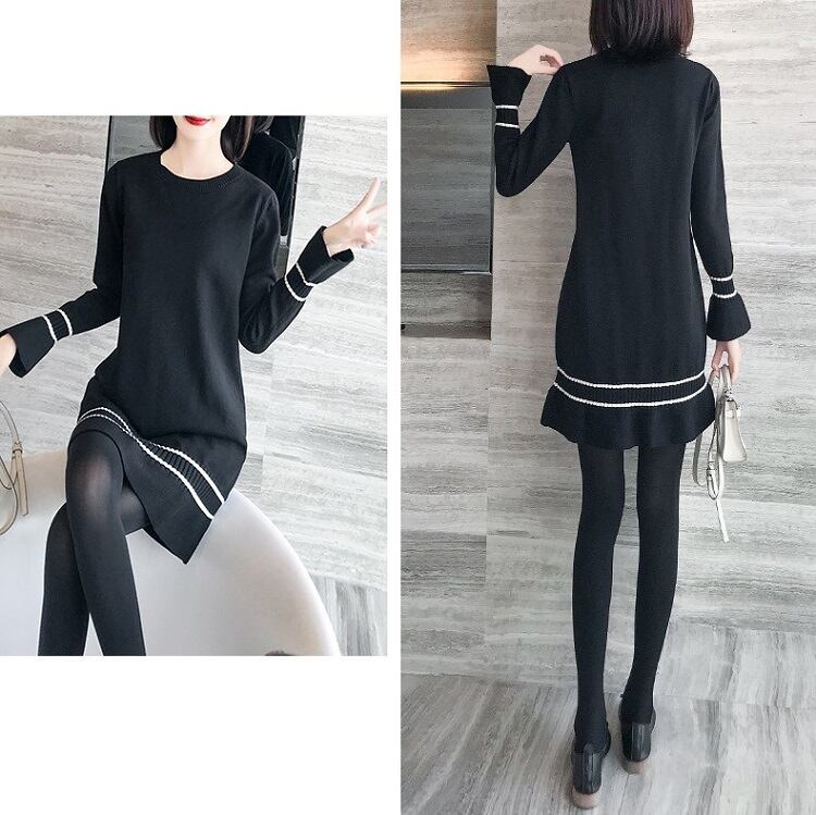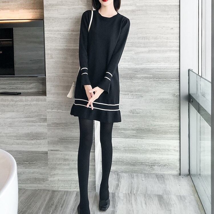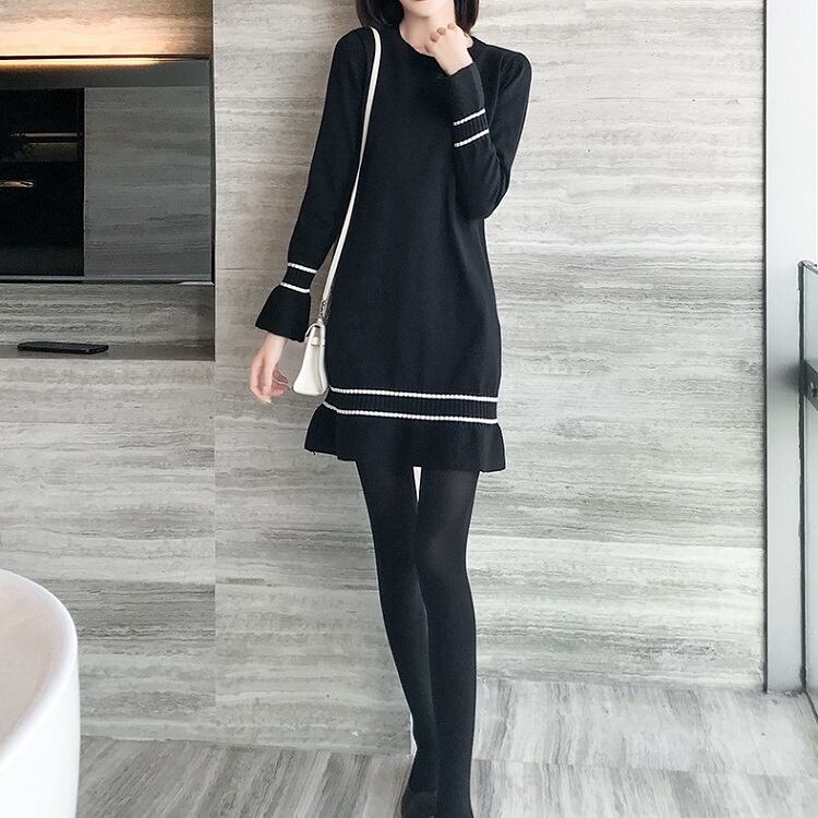 ワンピース ニットワンピース レトロ 長袖 ベルスリーブ ミニスカート ラウンドネック フリル フェミニン きれいめ カジュアル お出かけ デート オフィス 秋冬 ブラック