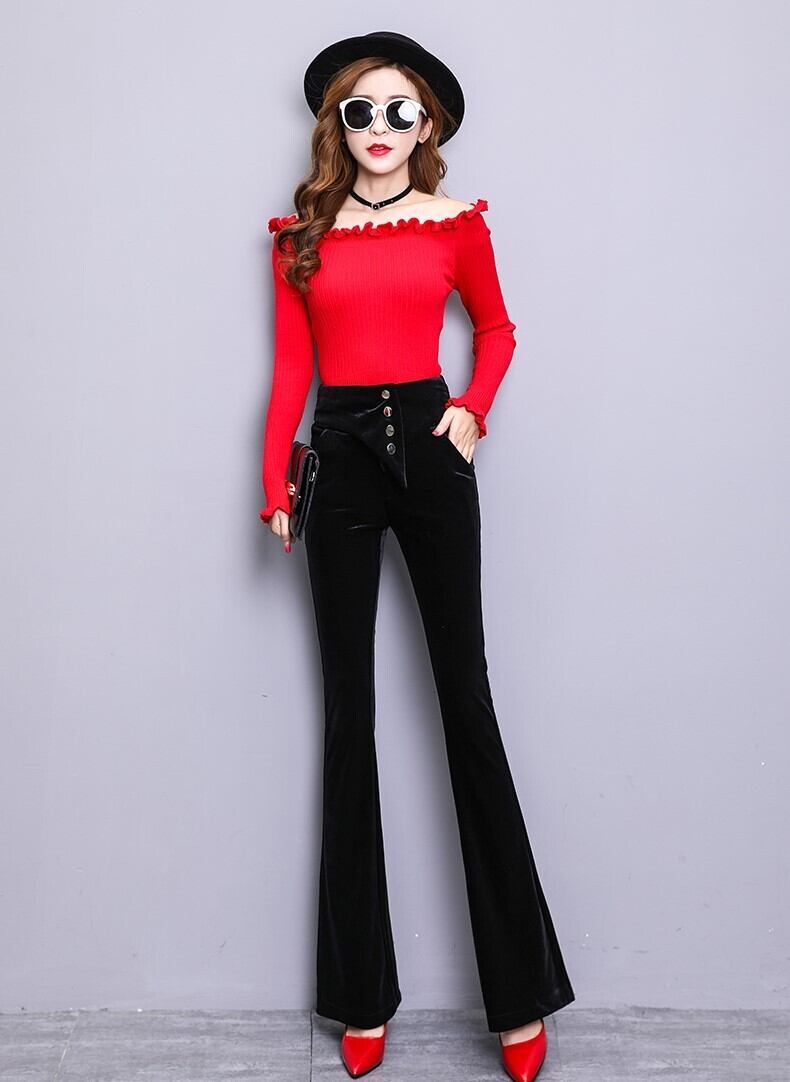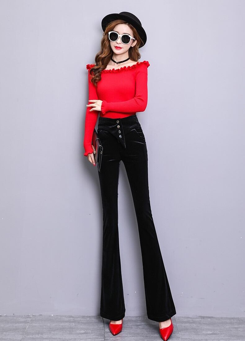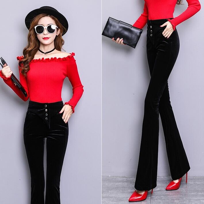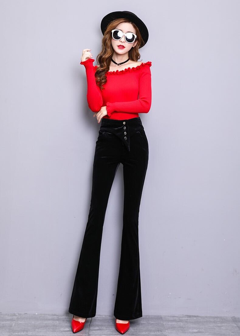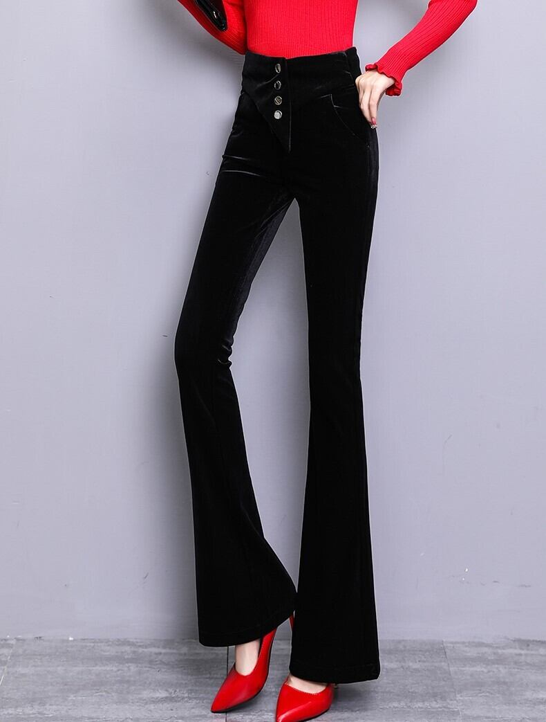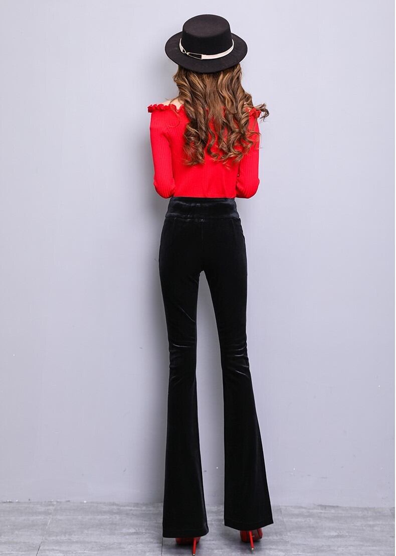 ベロアパンツ ワイドパンツ スリム ベルボトム ストレート ブラック 上品 エレガント ハイウエスト 秋 冬 大人カジュアル 韓国 オルチャン