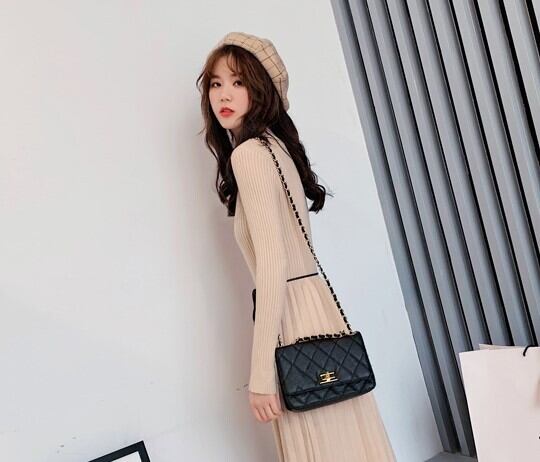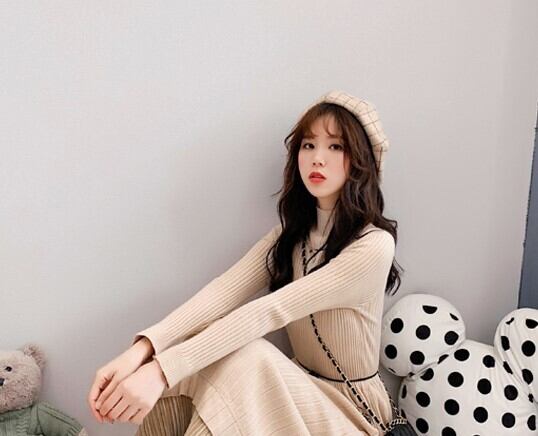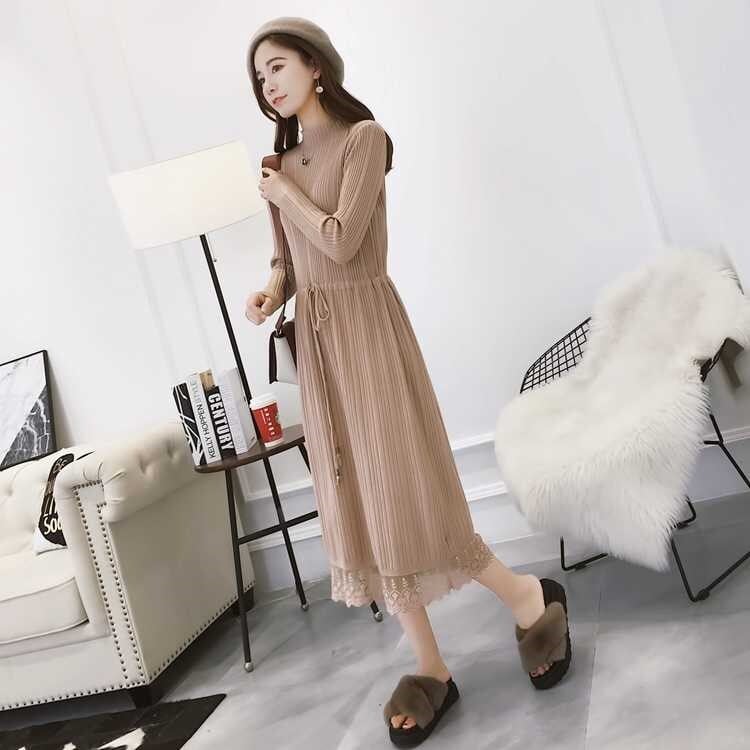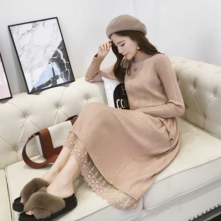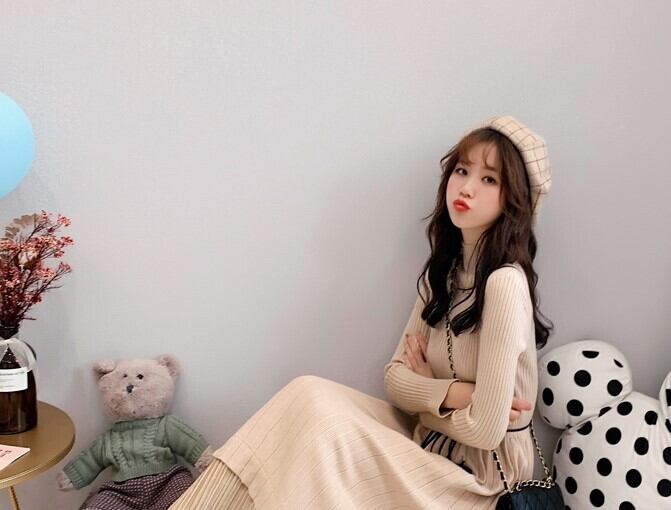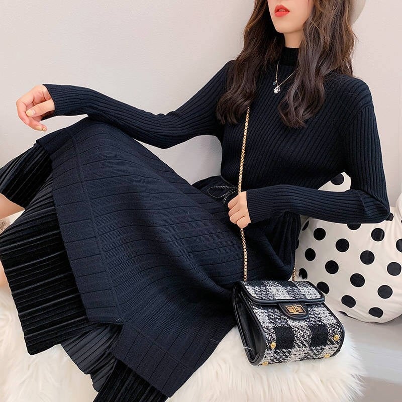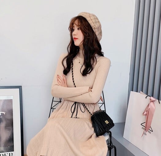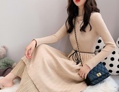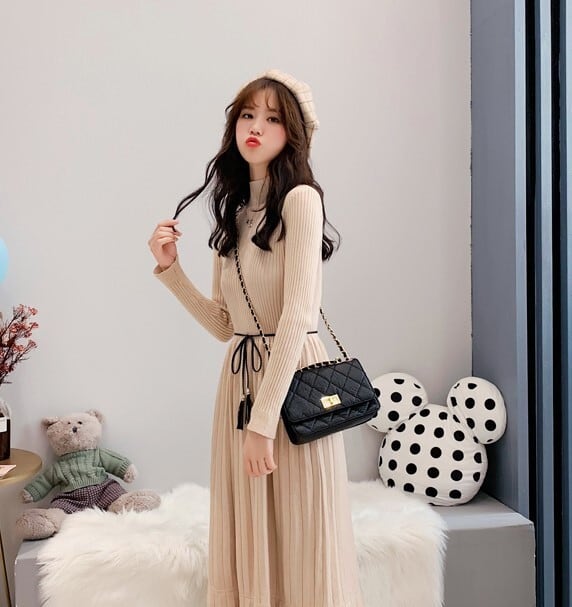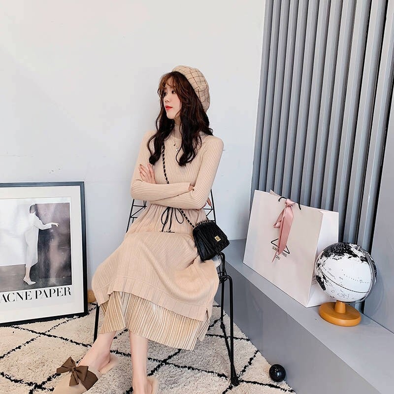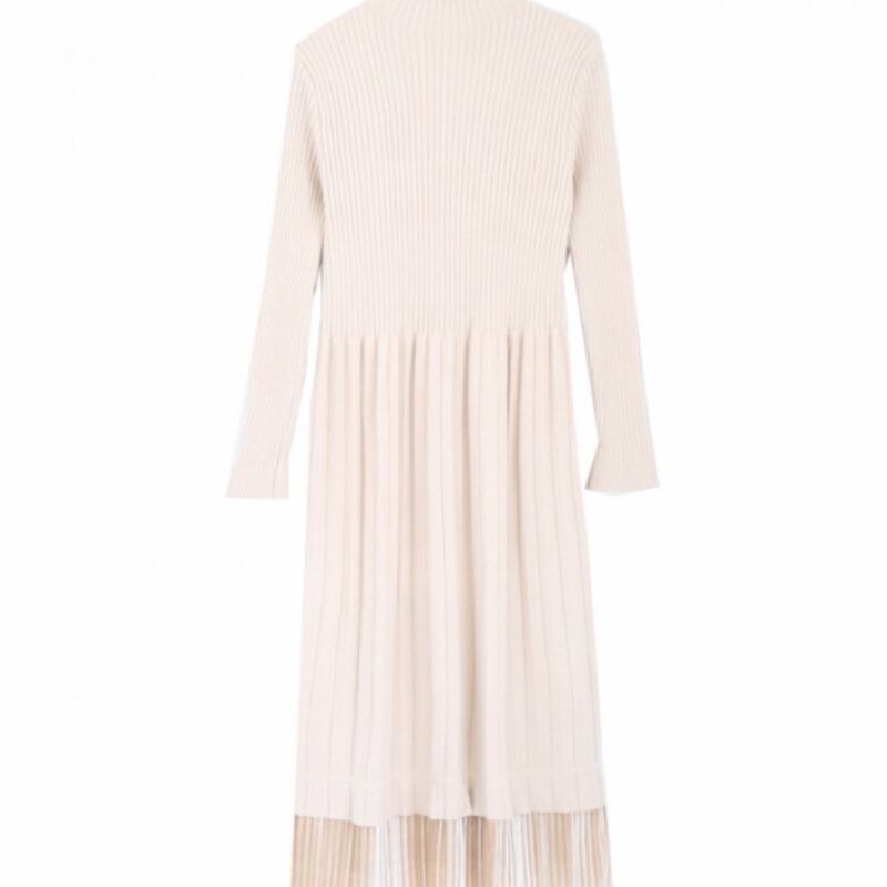 全2色 ニットワンピース ニットドレス ハイネック 長袖 ベロアプリーツ ロング丈 ベージュ ブラック 大人カジュアル 大人かわいい 秋 冬 韓国 オルチャン
