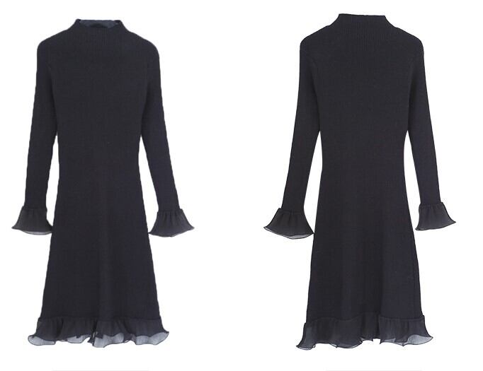 全3色 ニットワンピース ニットドレス ハイネック 長袖 リブニットドレス ブラック ホワイト ブルー 大人かわいい スリム ロング丈 韓国 オルチャン フリル シフォン