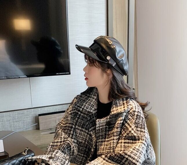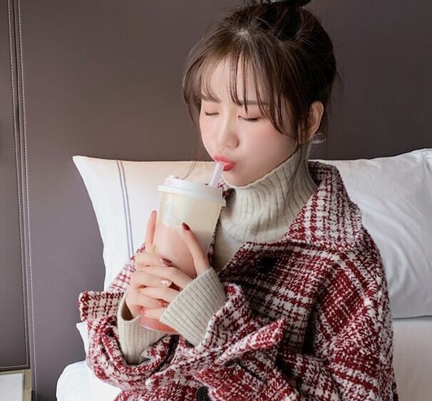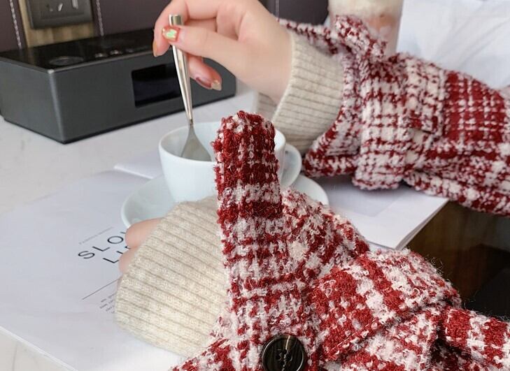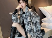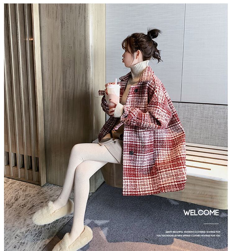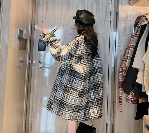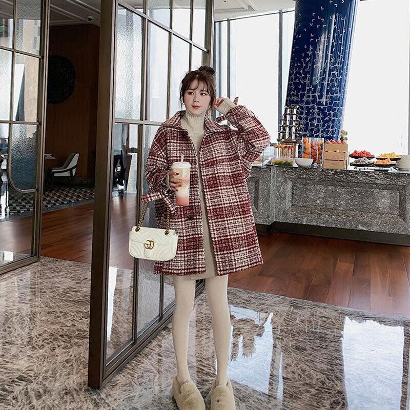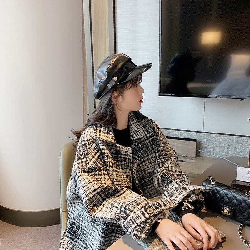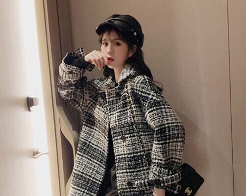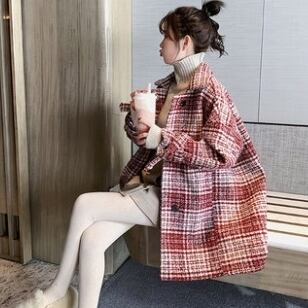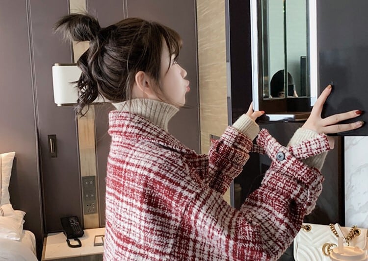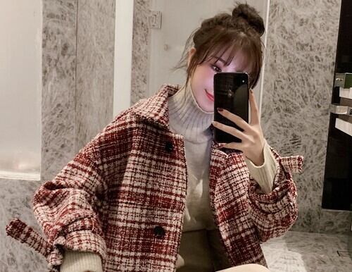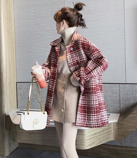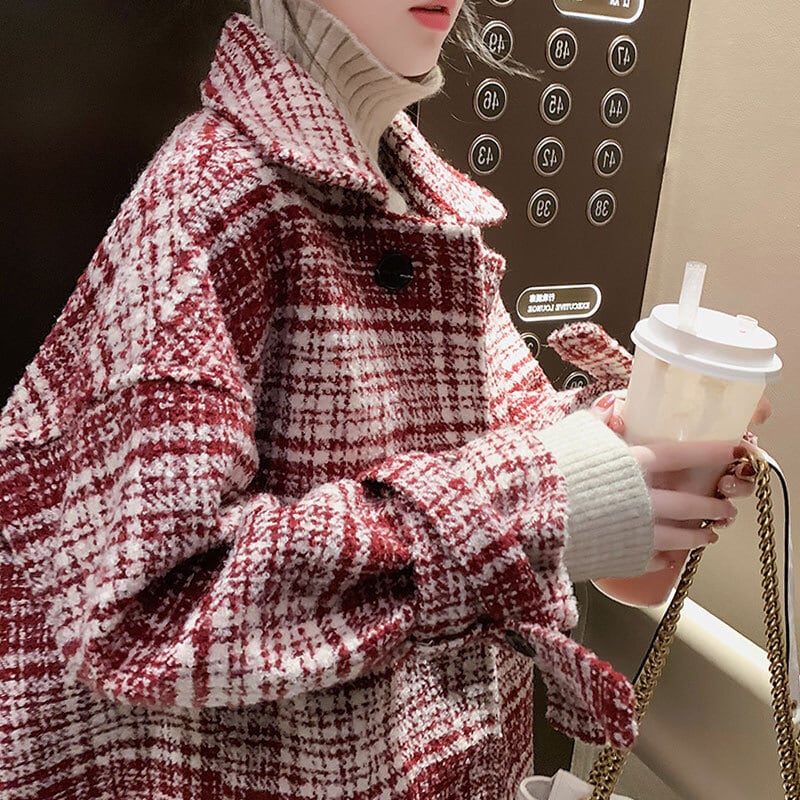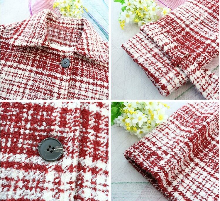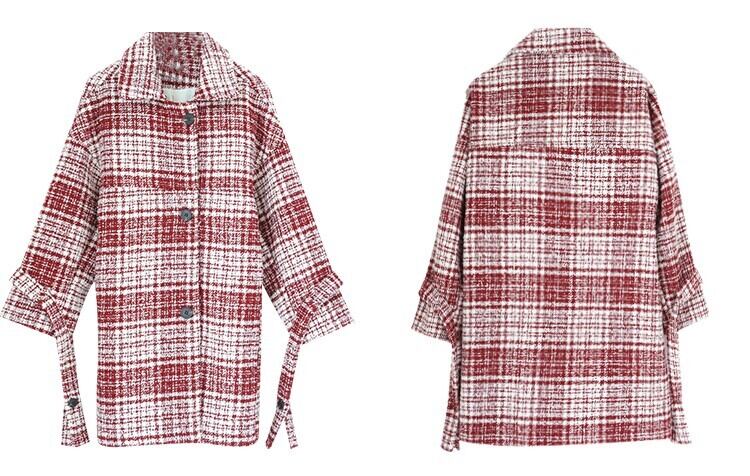 全2色 ツイードジャケット ハーフコート レッド ブラック アウター 羽織 チェック 長袖 ドロップショルダー 秋 冬 学生 通学 韓国 オルチャン レトロ