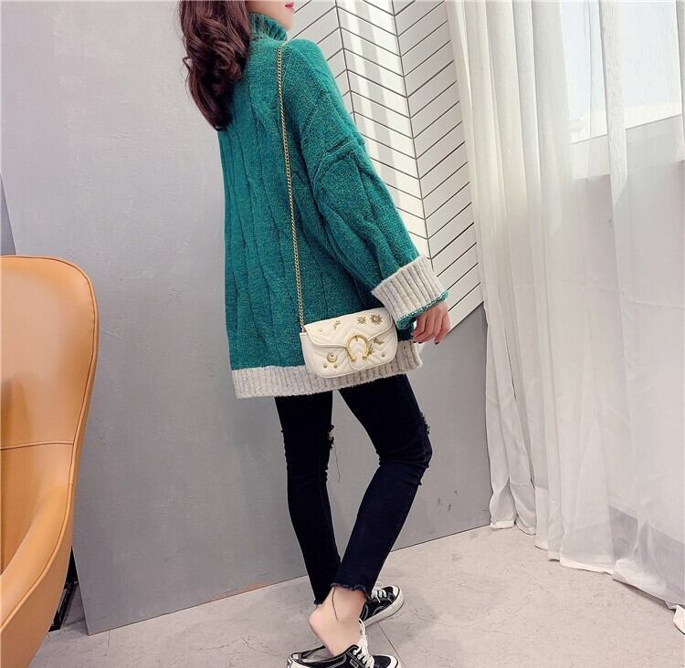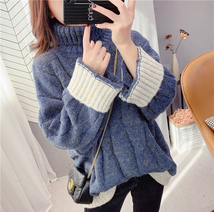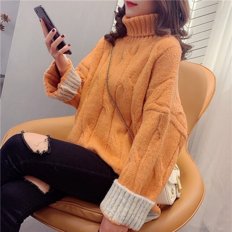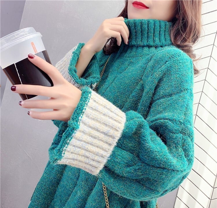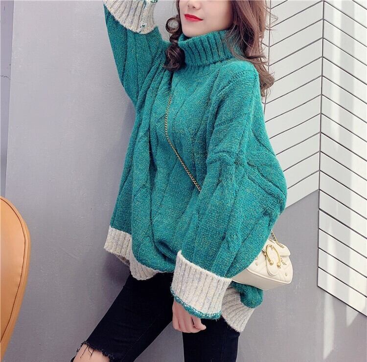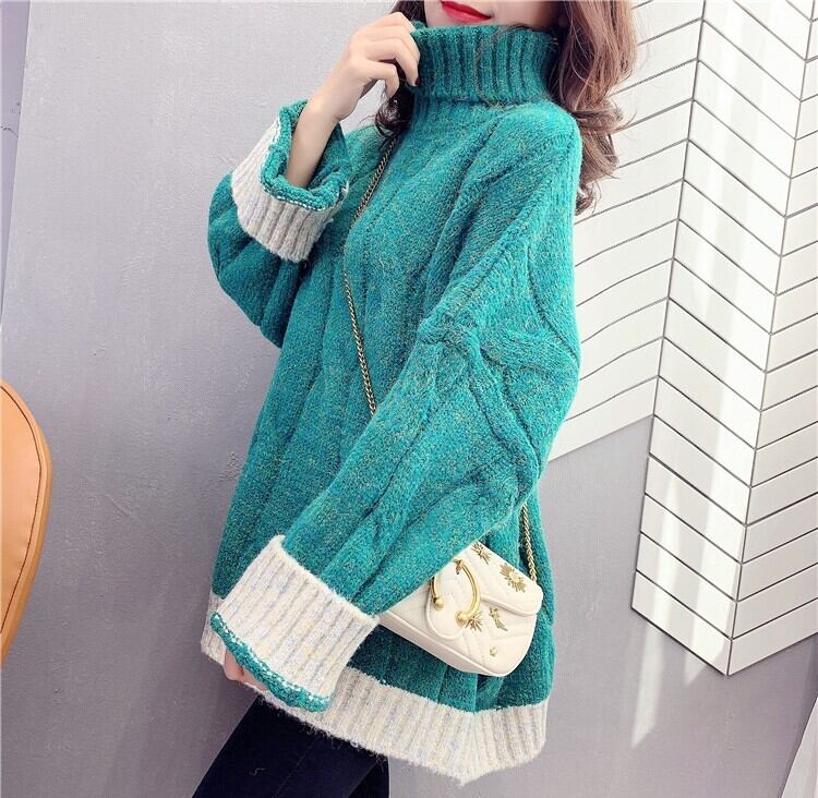 全4色 くすみカラー セーター ニット タートルネック 長袖 ドロップショルダー グレー グリーン ブルー オレンジ ミドル丈 秋 冬 大人カジュアル 韓国 オルチャン