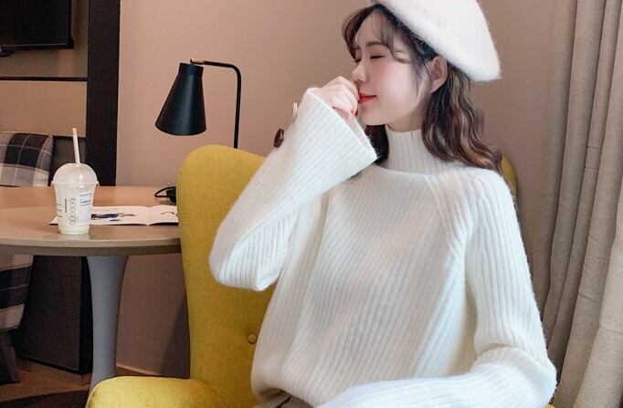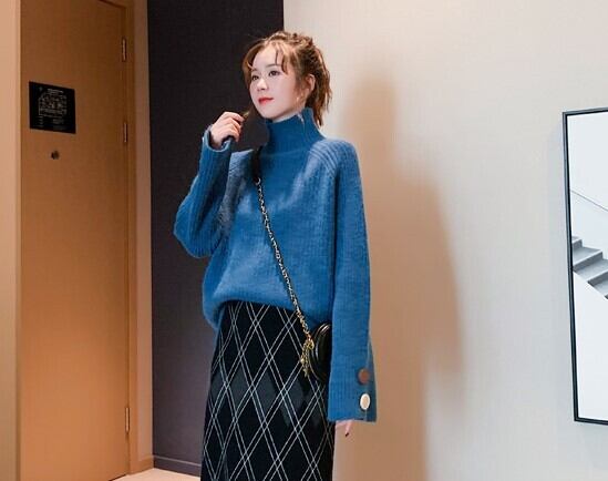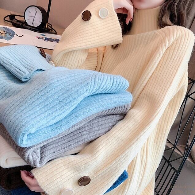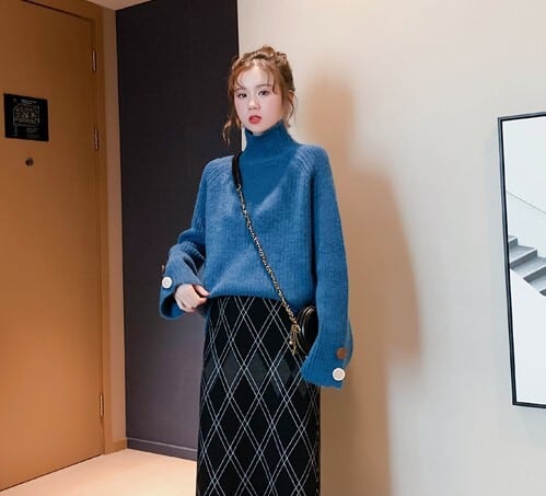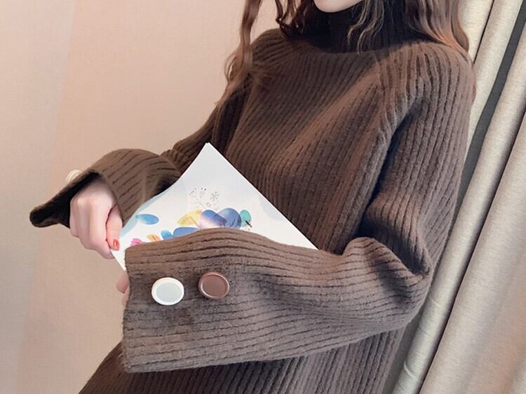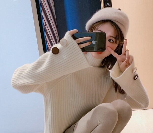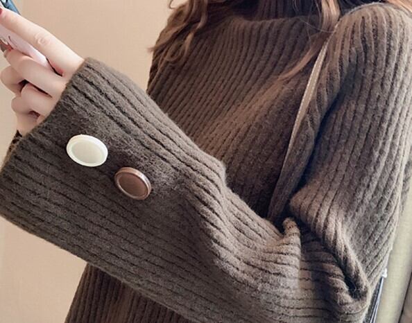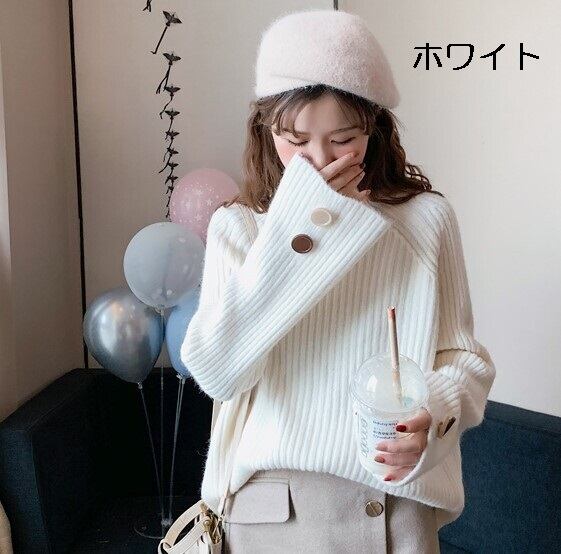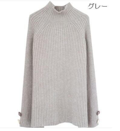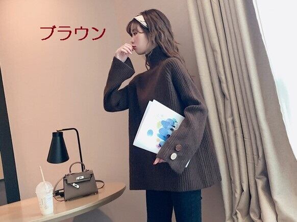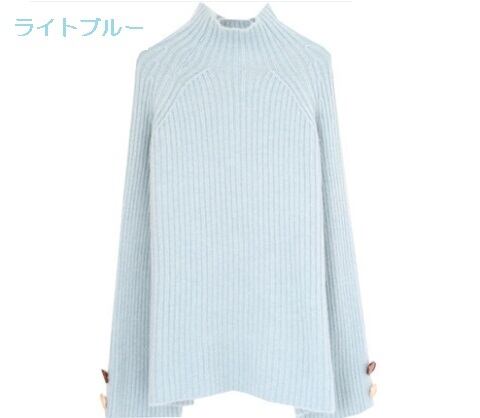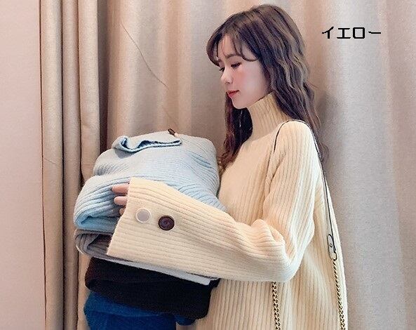 全6色 ざっくりセーター サイドボタン タートルネック 長袖 フレアスリーブ イエロー ライトブルー グレー ホワイト ブラウン ブルー 大人カジュアル ナチュラル ベーシック かわいい 韓国 オルチャン 秋 冬