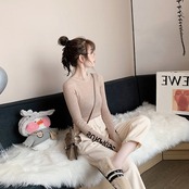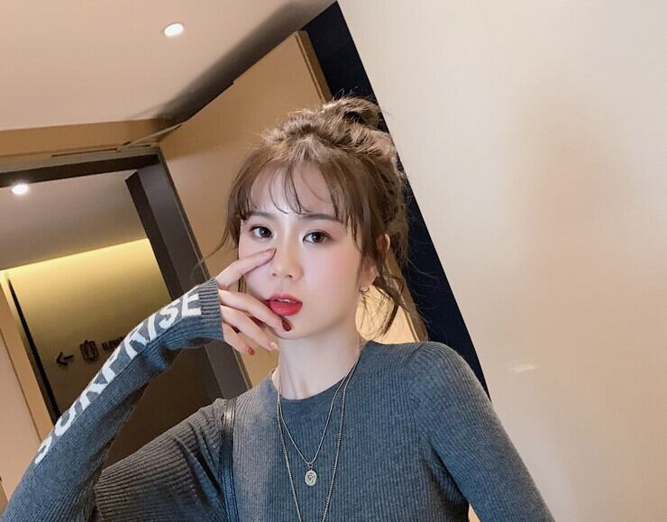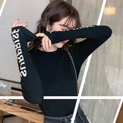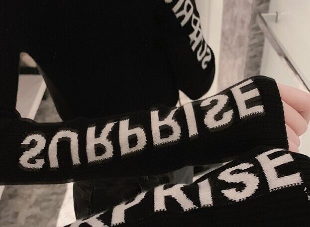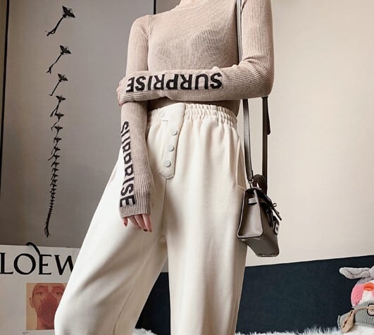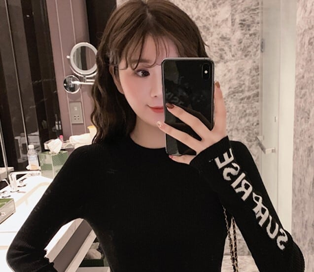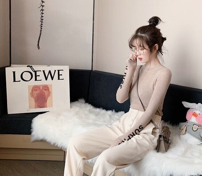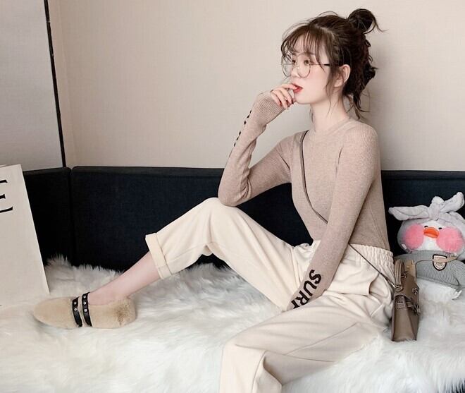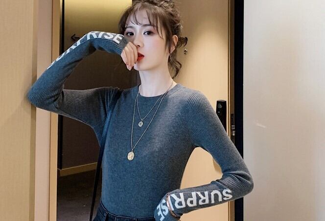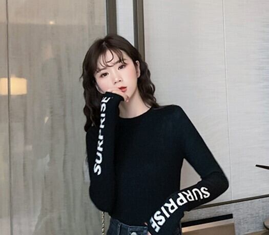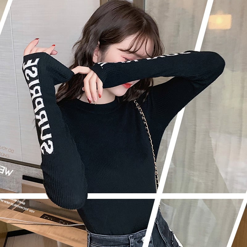 全3色 リブニットセーター ロゴ ラウンドネック 長袖 ブラック グレー ベージュ ナチュラル スリム フィット カジュアル 韓国 オルチャン 秋 冬