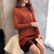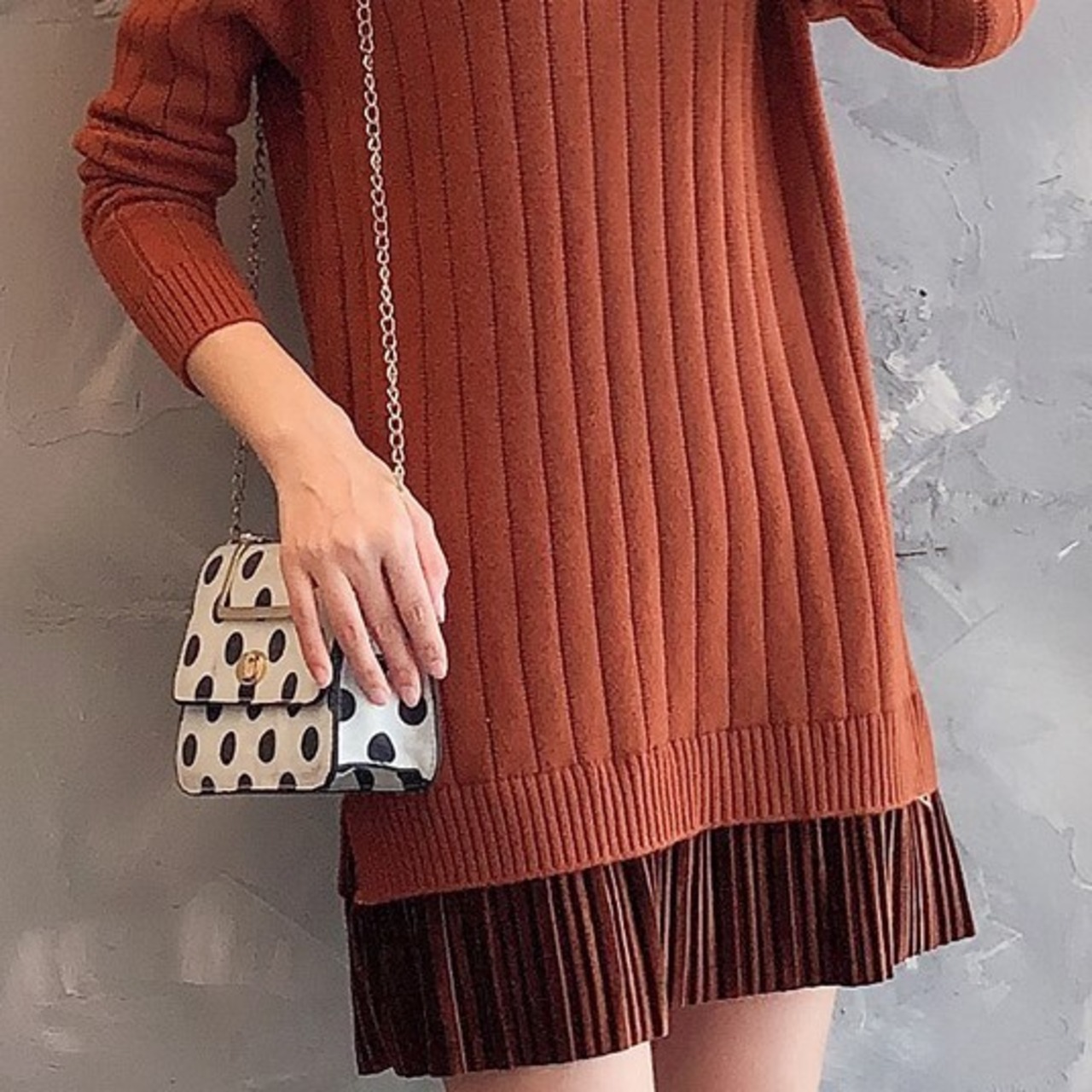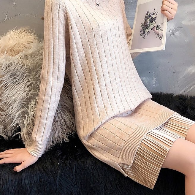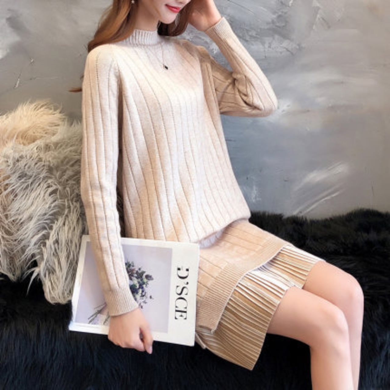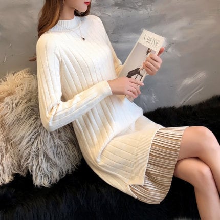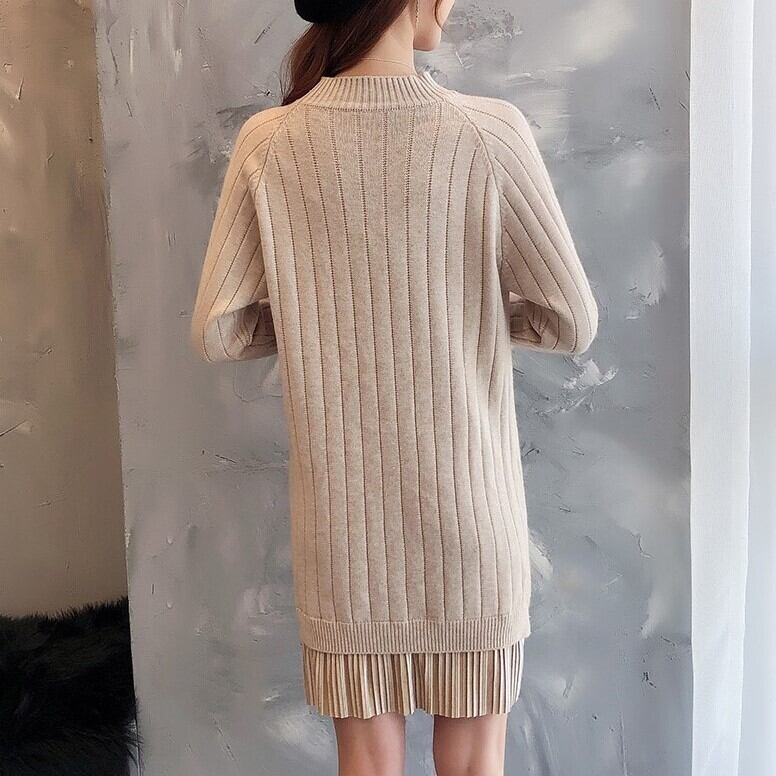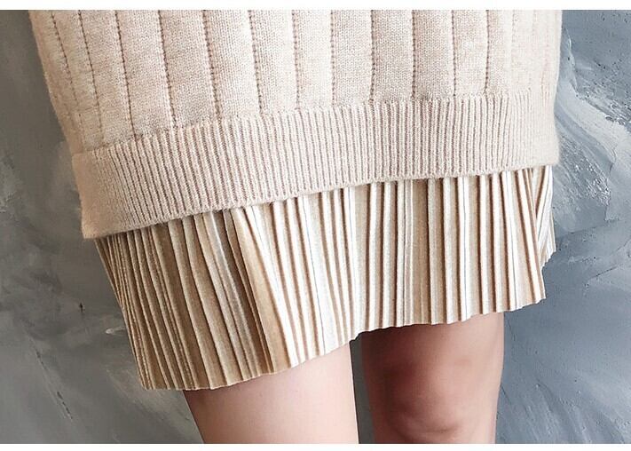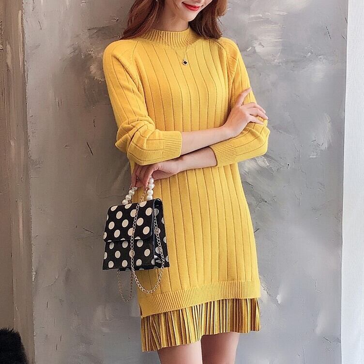 全6色 ベルベットプリーツデザインのニットワンピース