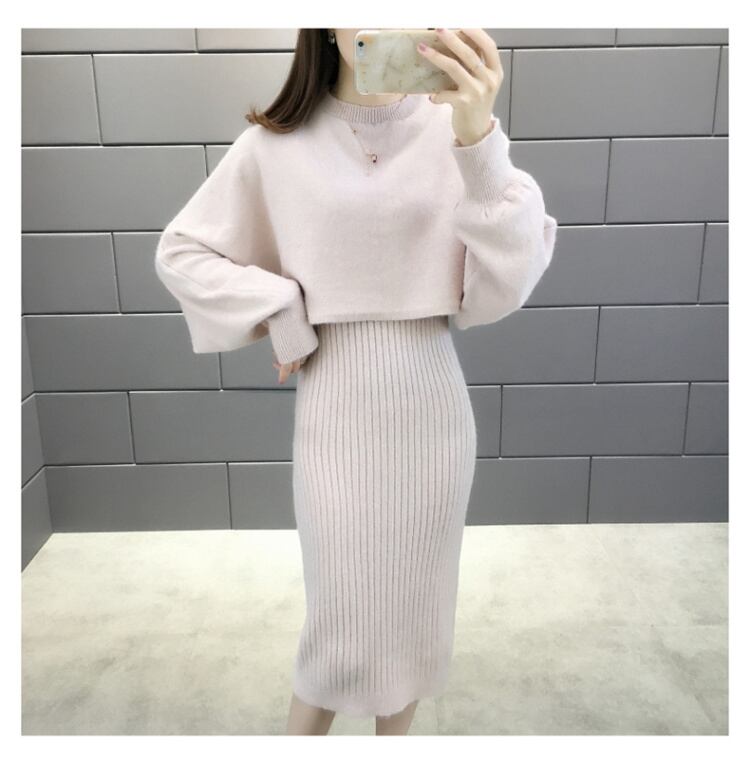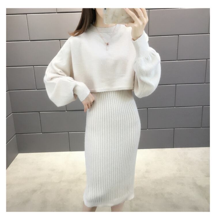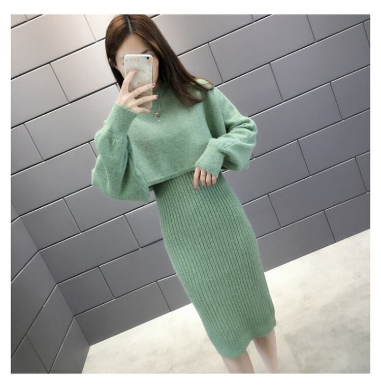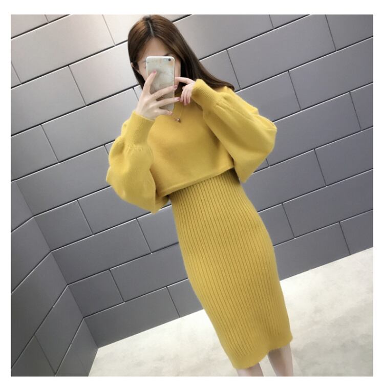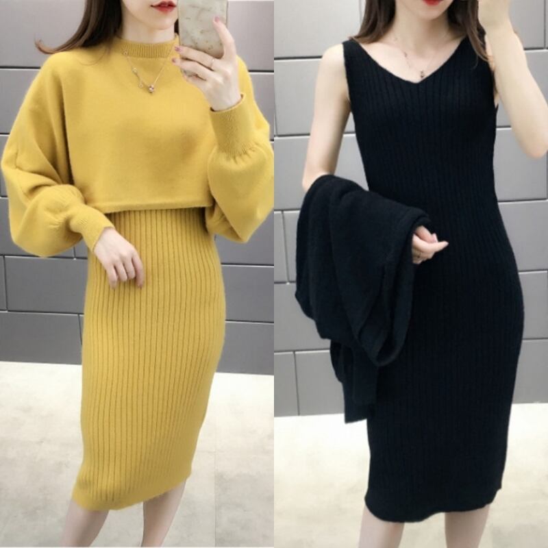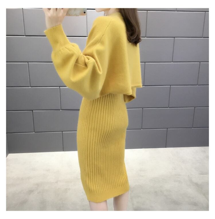 全5色 セットアップ ニット ワンピース セーター リブニット 無地 クルーネック パフスリーブ 長袖 ショート丈 Vネック ひざ丈 タイト 秋冬 お出かけ 女子会 デート カジュアル こなれ感 セクシー 上品 ガーリー きれいめ 大人可愛い