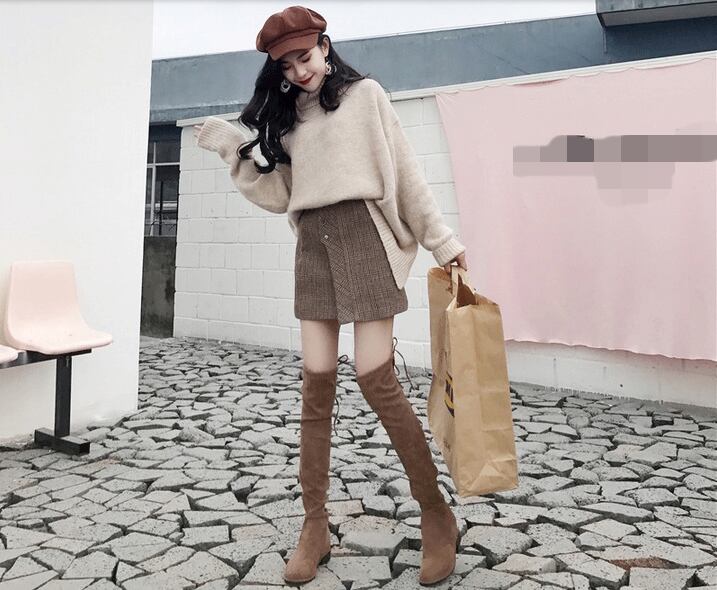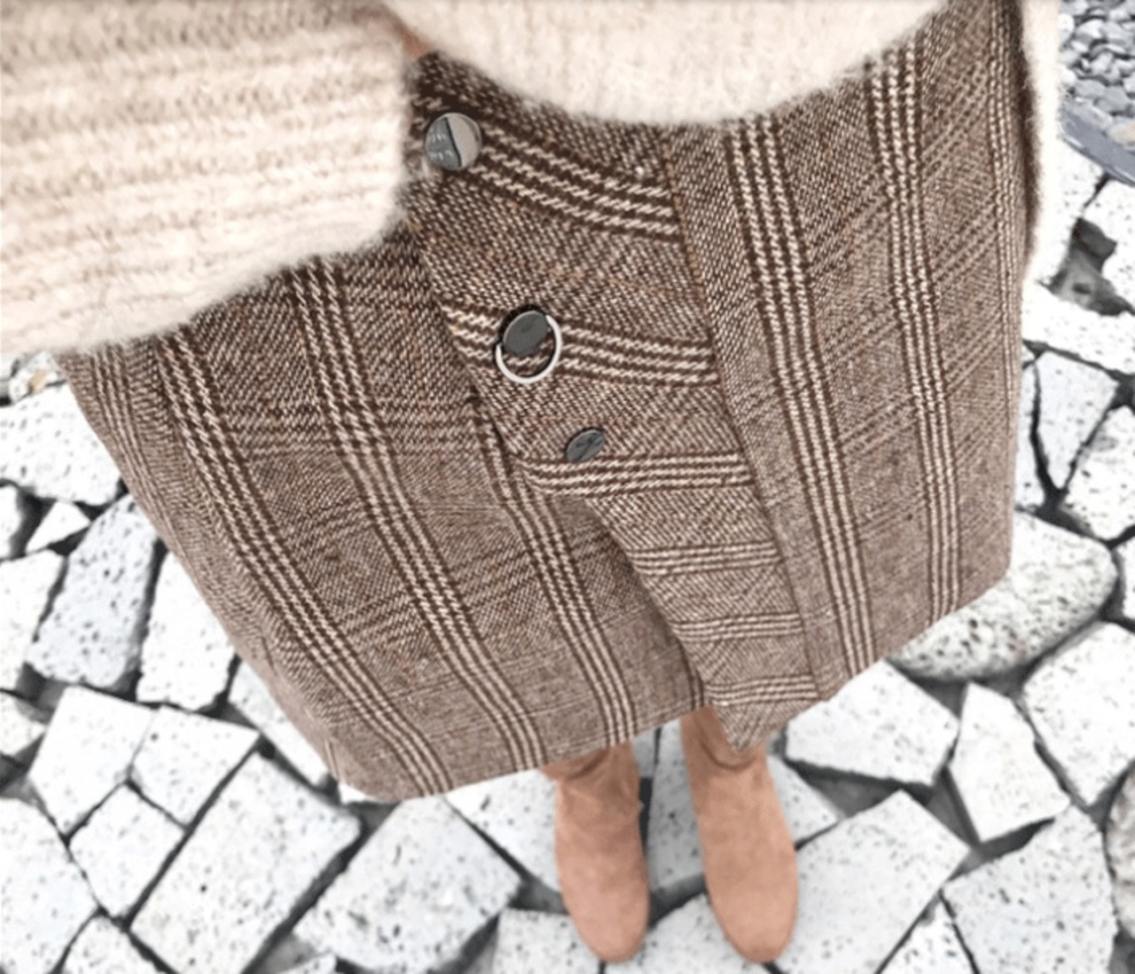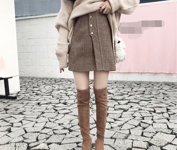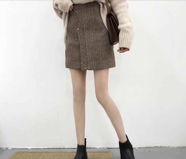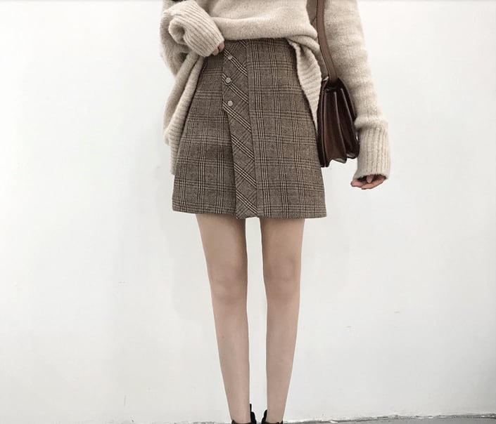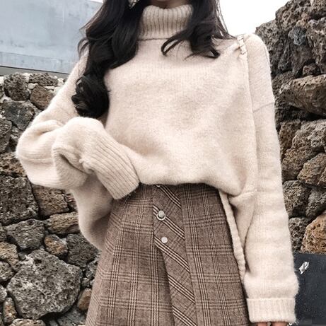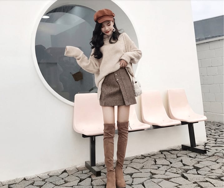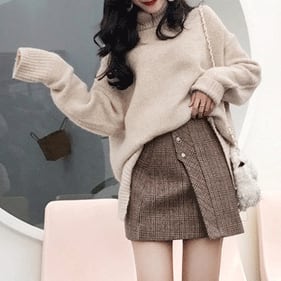 ふわふわのタートルネックセーターとチェック柄ミニスカートのコーデセットです。