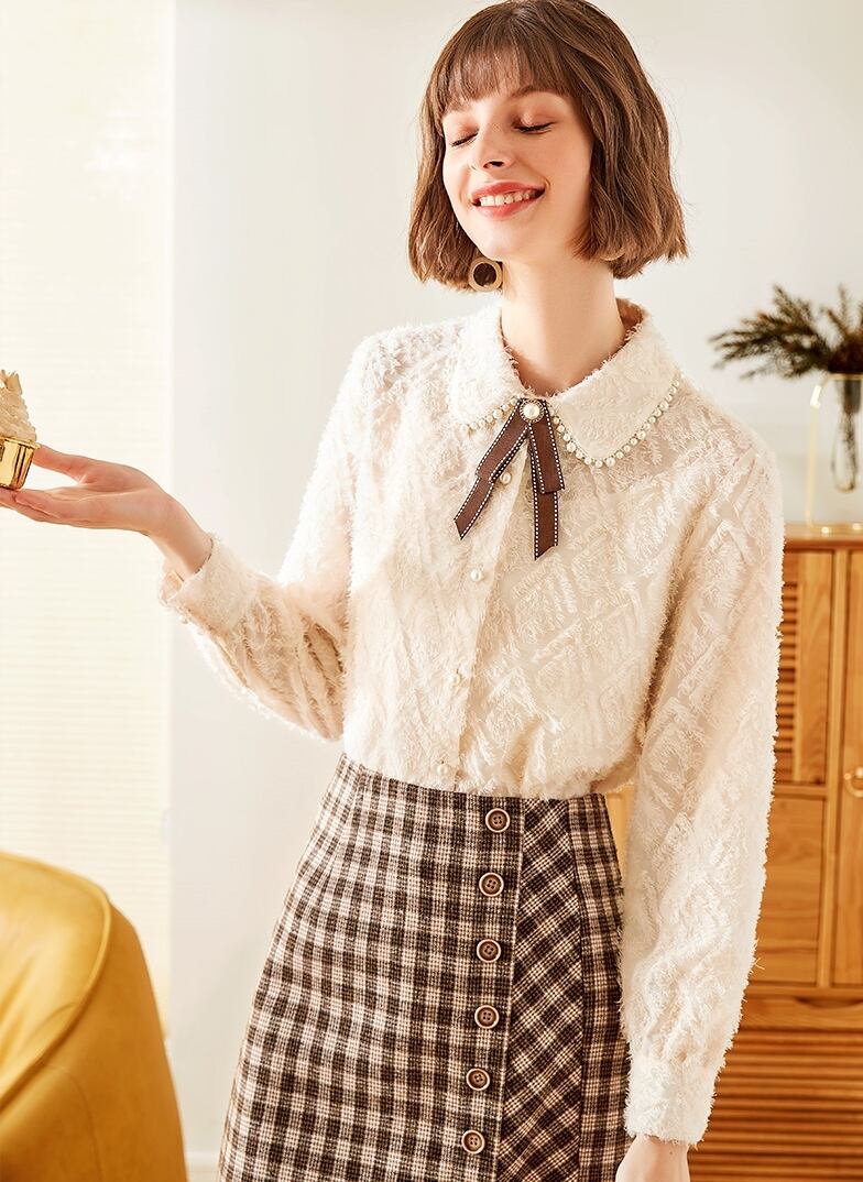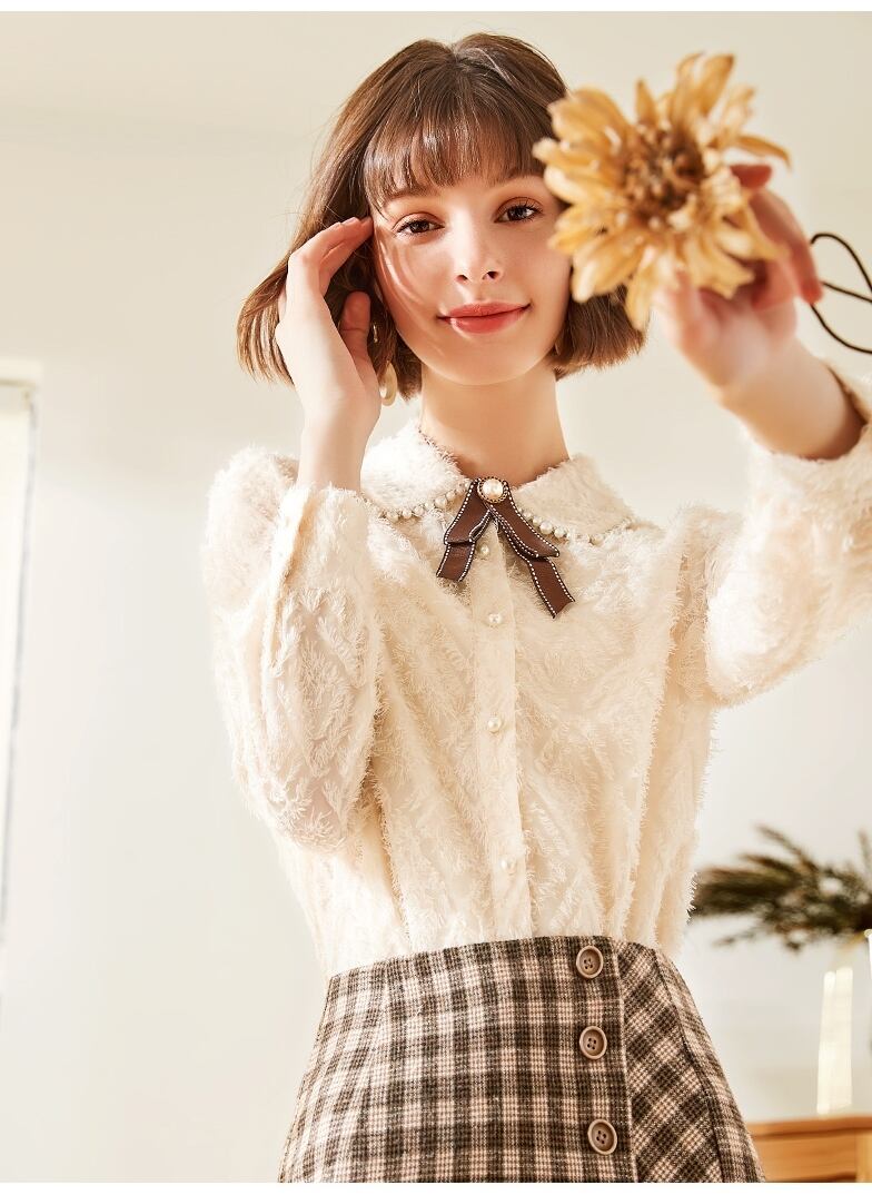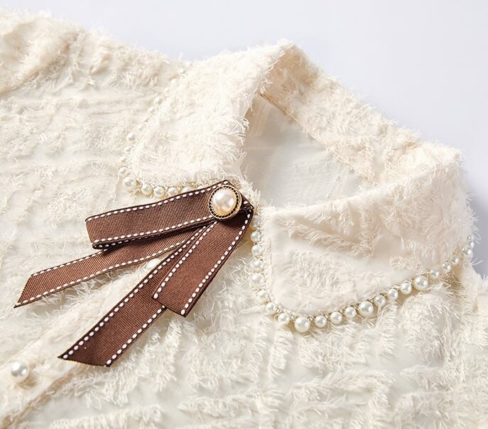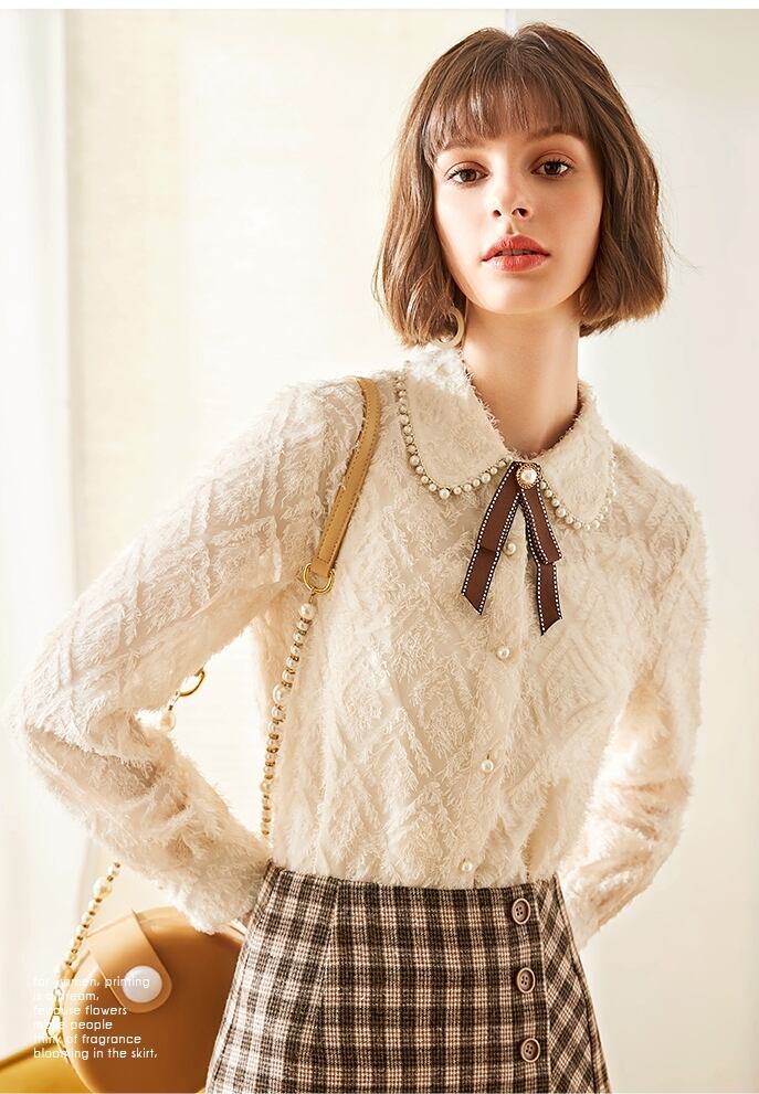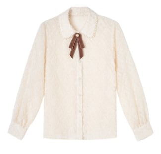 パール装飾にリボンのボウタイがついた可愛さを詰め込んだブラウス。