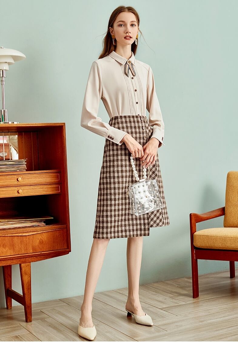 全2種 ブラウス 長袖 ラップスカート ひざ丈 ボウタイ リボン パール装飾 スカート ひざ下丈 チェック柄 ベイクドカラー Aライン ラップスカート 秋冬 お出かけ デート 女子会 通勤 オフィス フォーマル カジュアル きれいめ フェミニン エレガント 大人可愛い ガーリー