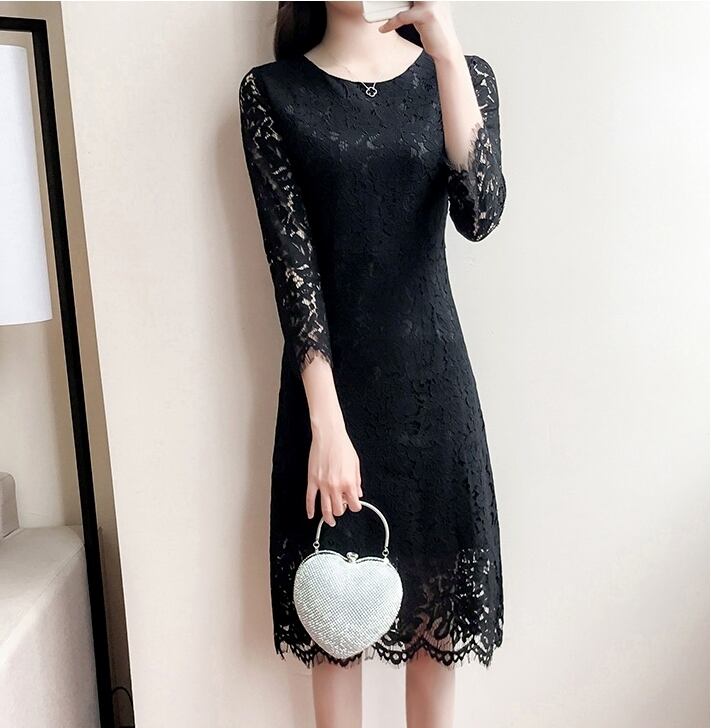 全2種 総レース ワンピース ひざ丈 七分袖 ラウンドネック クルーネック スカート Iライン 秋冬 デート お出かけ フォーマル お呼ばれ 結婚式 女子会 食事会 二次会 ワントーンコーデ 上品 きれいめ エレガント