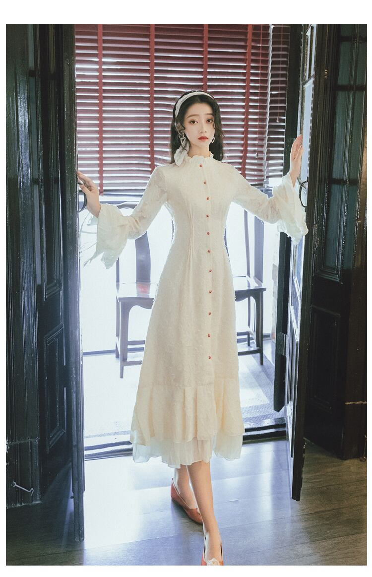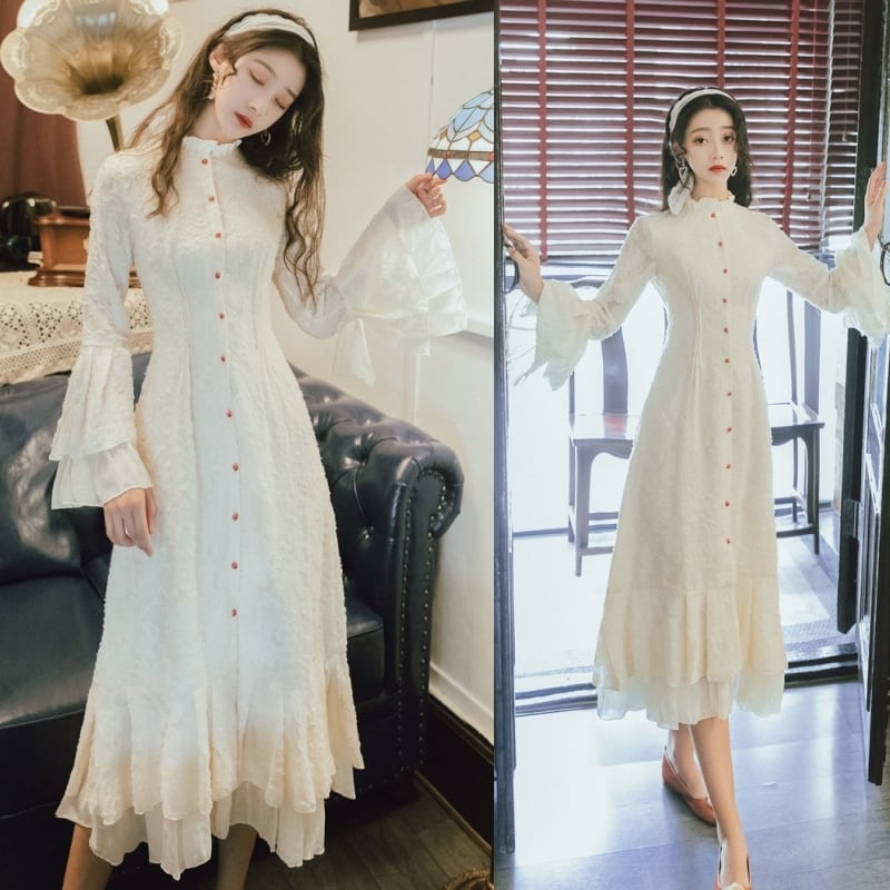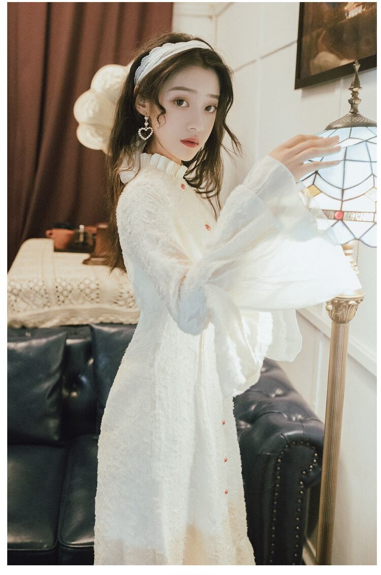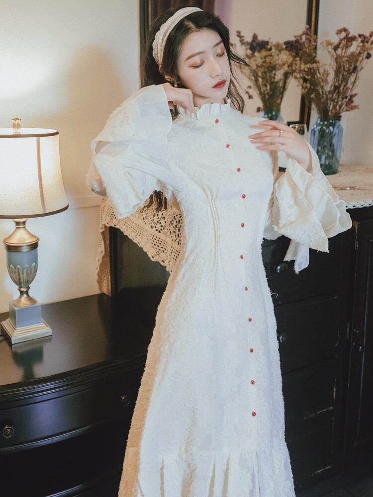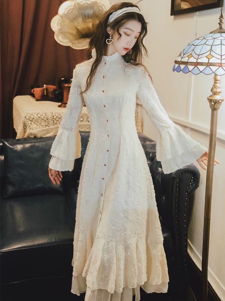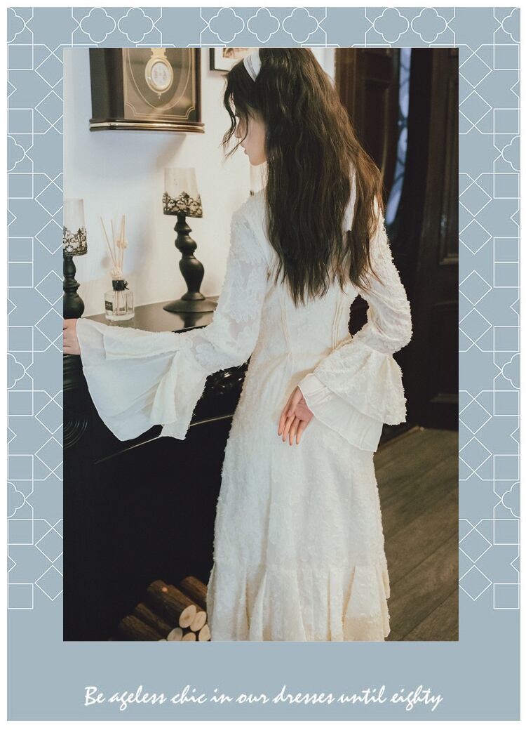 ドレス 刺繍 レース フレア袖 長袖 ミモレ丈 ワンピース スカート Aライン パーティードレス ハイネック 秋冬 お出かけ 二次会 デート 謝恩会 発表会 フォーマル エレガント フェミニン 大人可愛い きれいめ ドレスワンピ