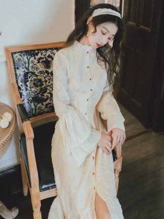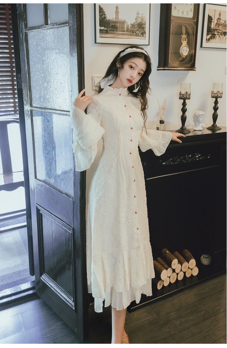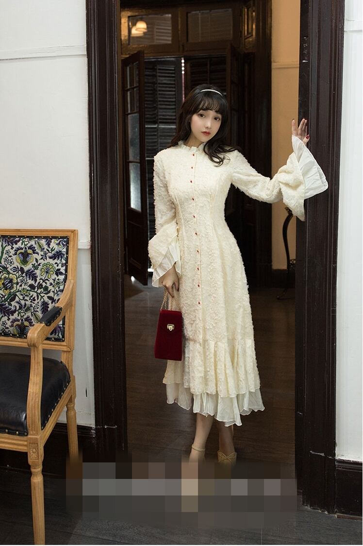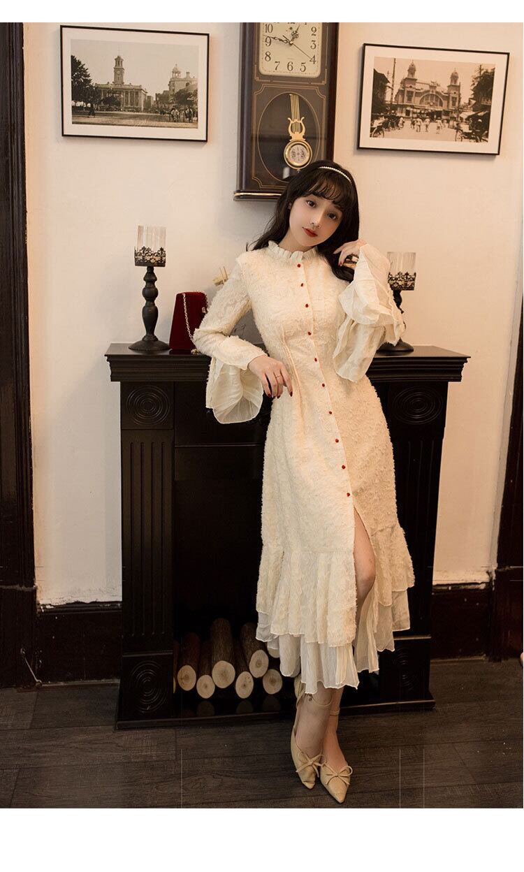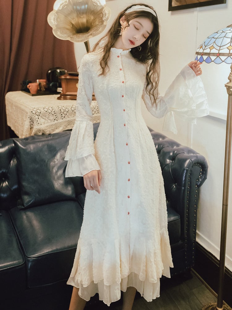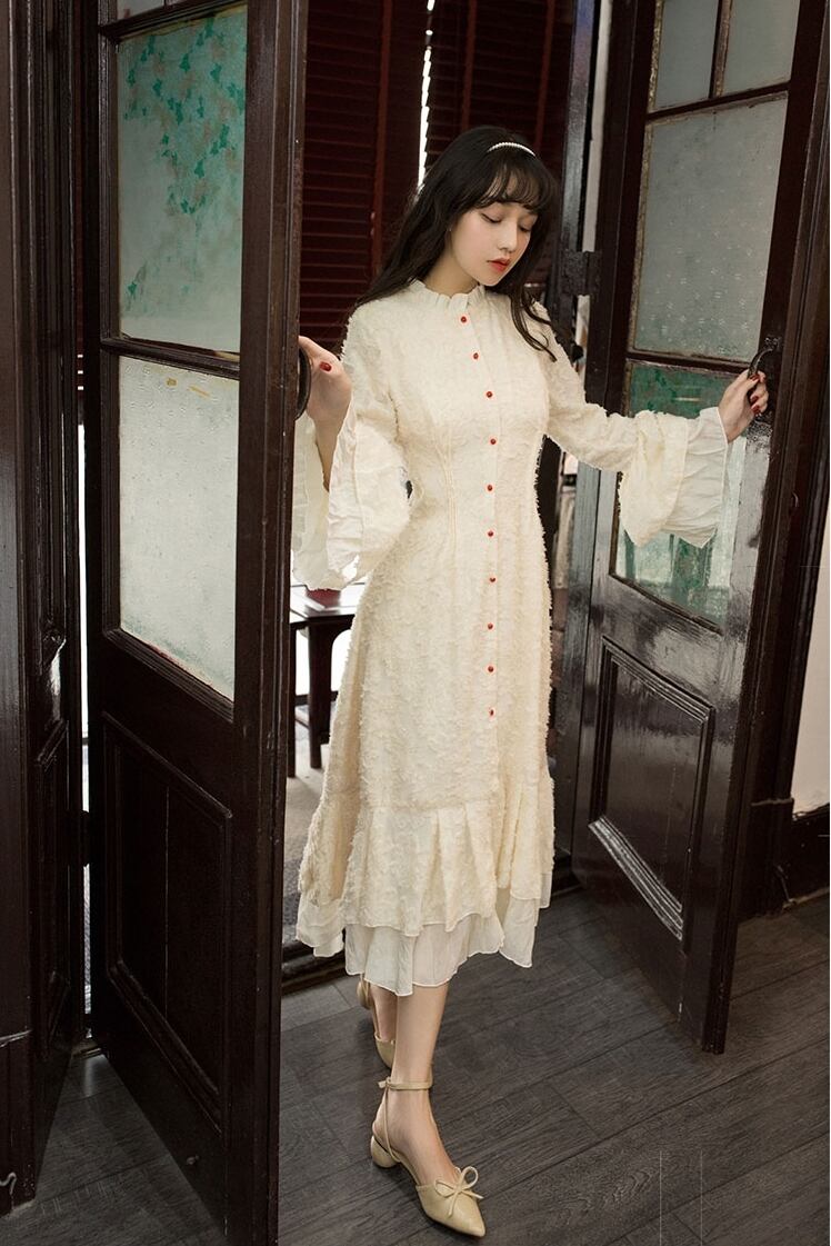 ドレス 刺繍 レース フレア袖 長袖 ミモレ丈 ワンピース スカート Aライン パーティードレス ハイネック 秋冬 お出かけ 二次会 デート 謝恩会 発表会 フォーマル エレガント フェミニン 大人可愛い きれいめ ドレスワンピ