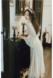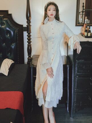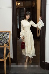 レース刺繍をたっぷりあしらった贅沢なミモレ丈ドレス。
