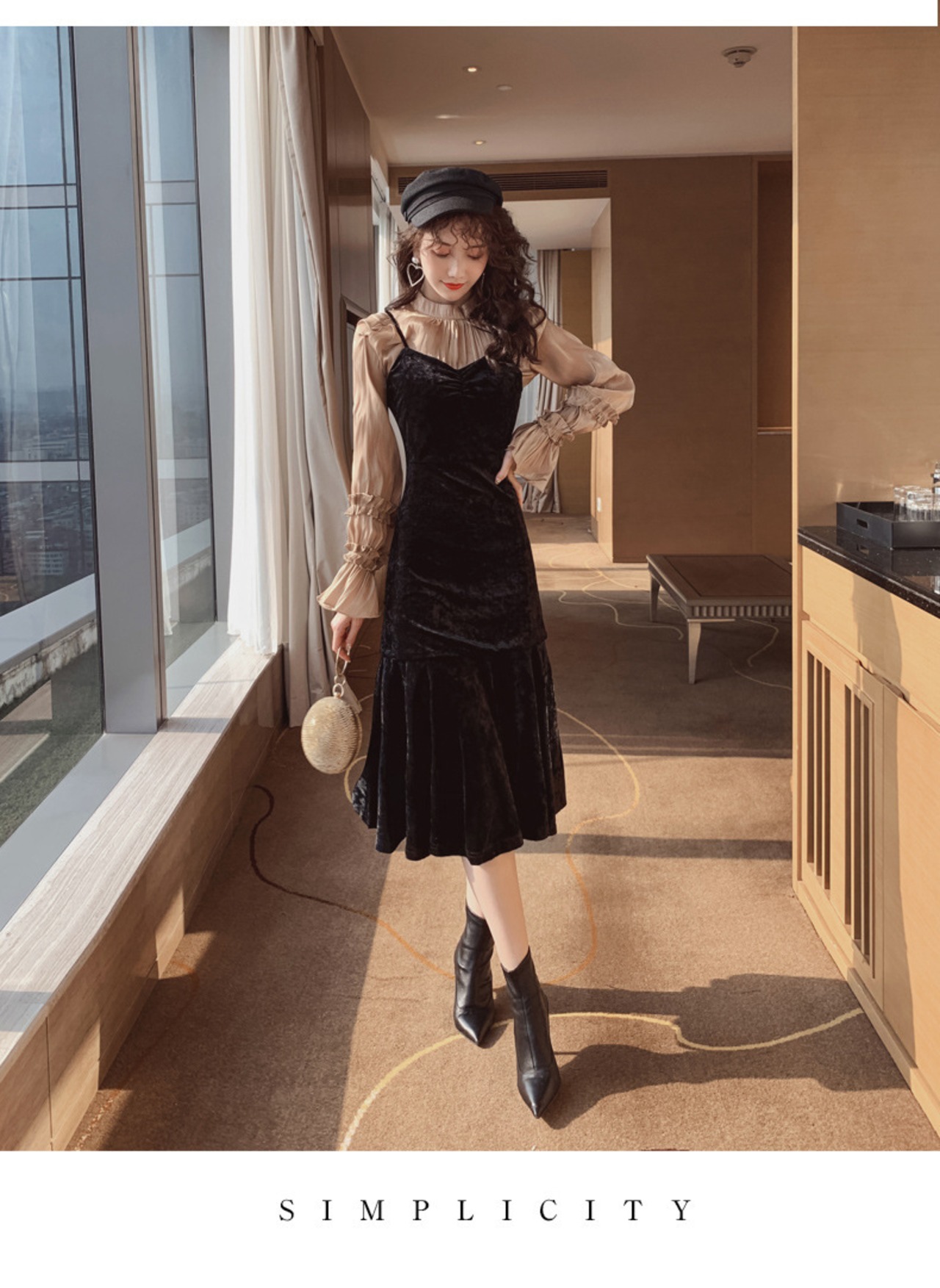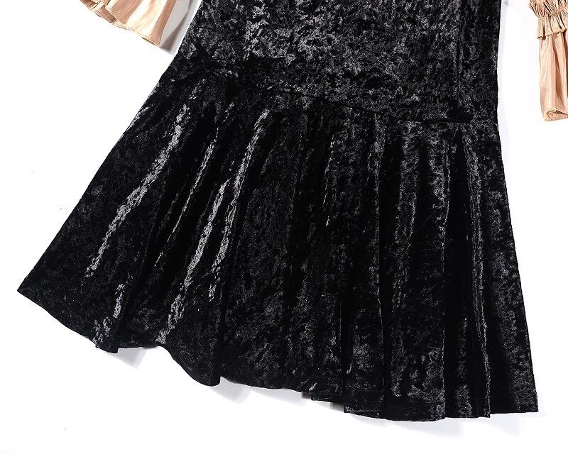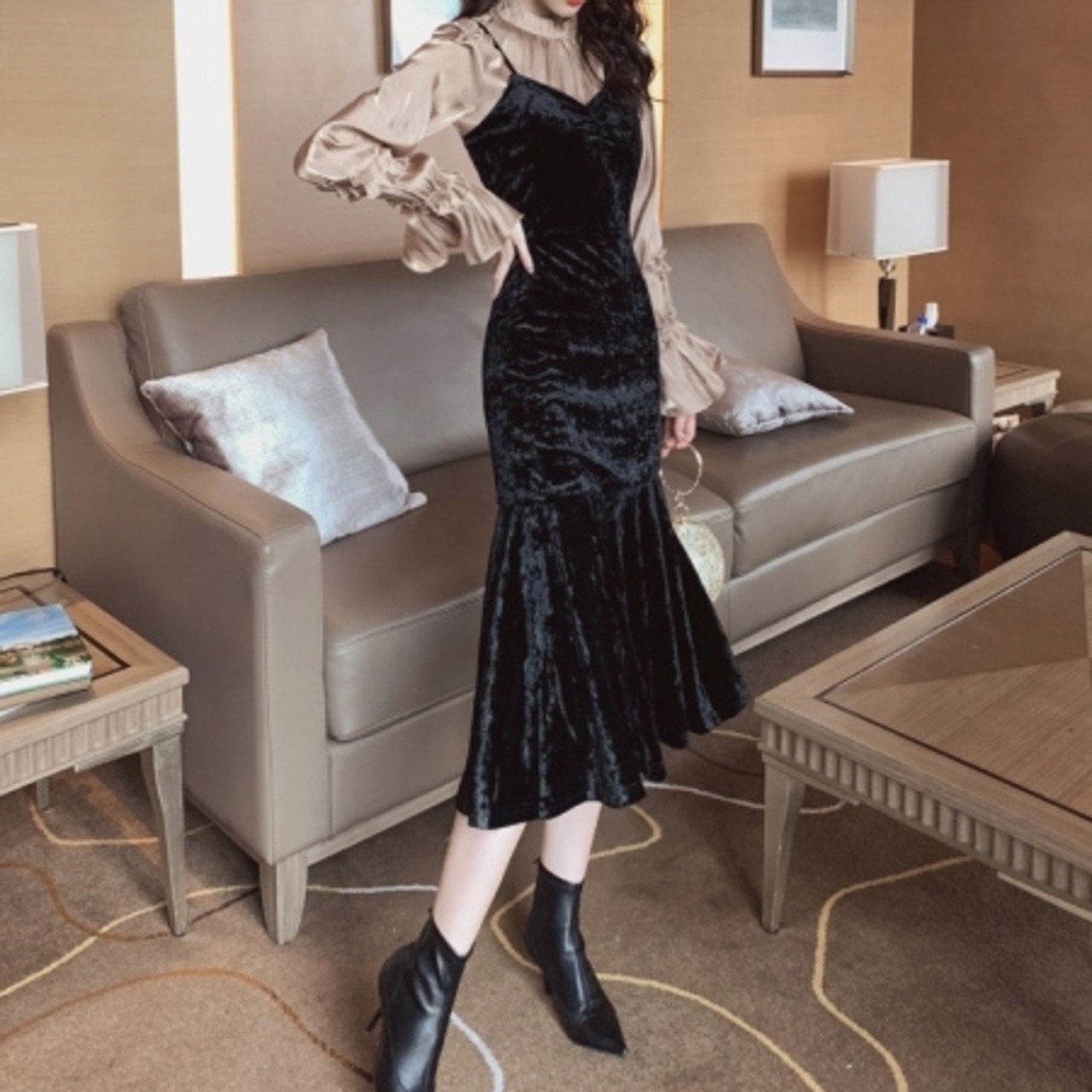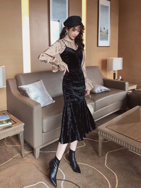 ベルベットの光沢が美しいひざ下丈ワンピースです。