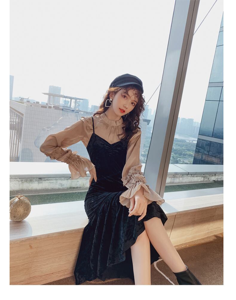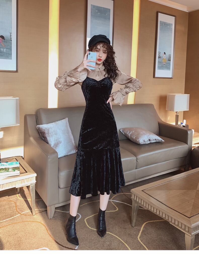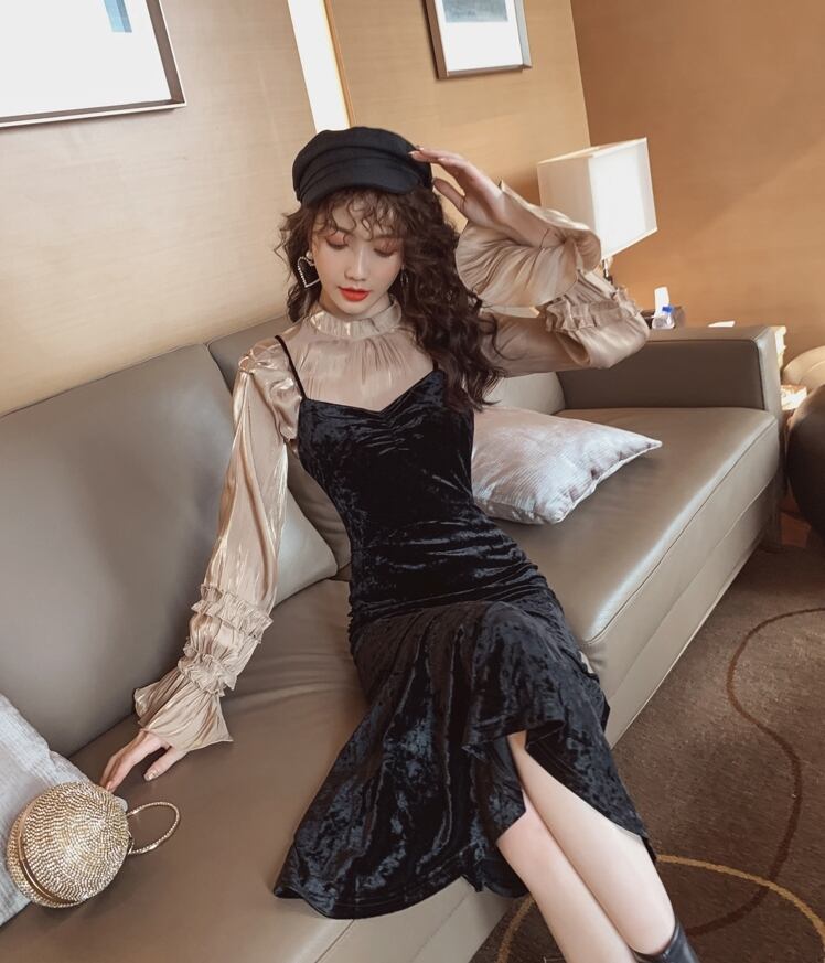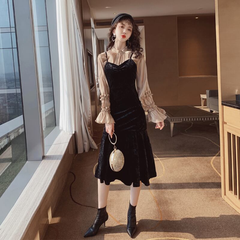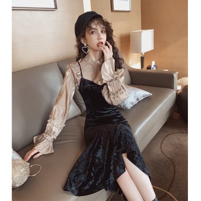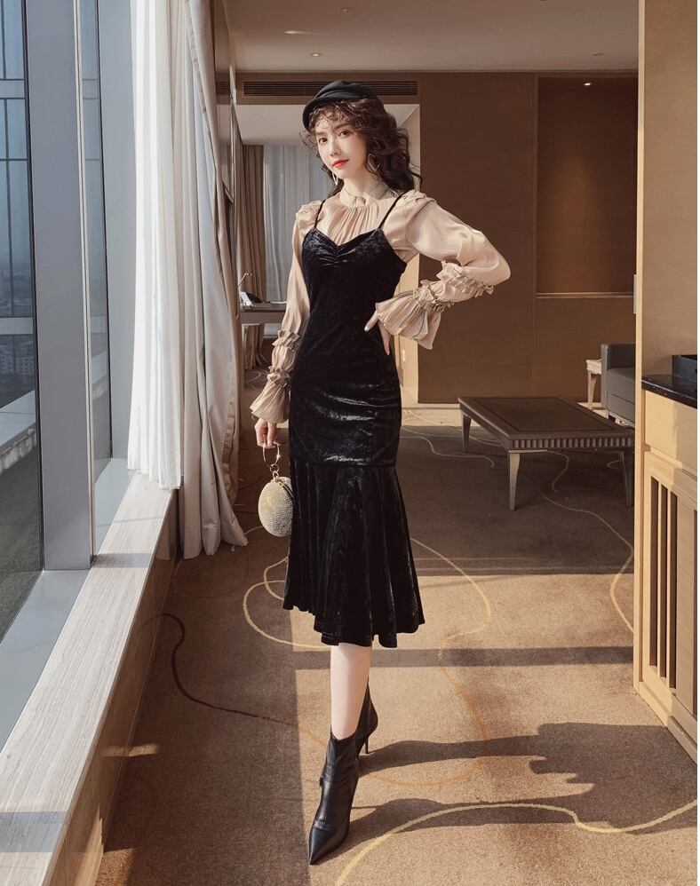 ツーピース ワンピース ベルベット ひざ下丈 ドレープ キャミワンピ サロペット ベロア マーメイド タイトめ スカート Vネック ブラック 秋冬 お出かけ デート 女子会 大人可愛い カジュアル フェミニン ガーリー エレガント きれいめ セクシー こなれ感