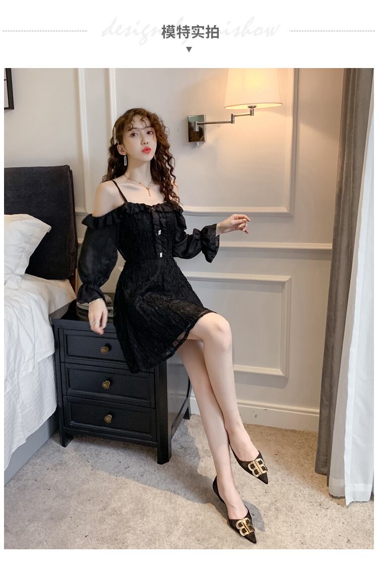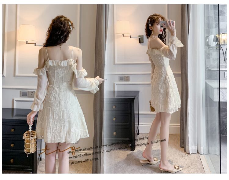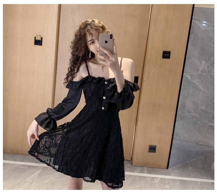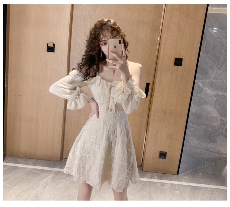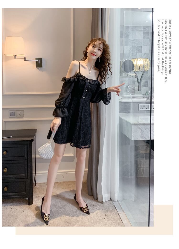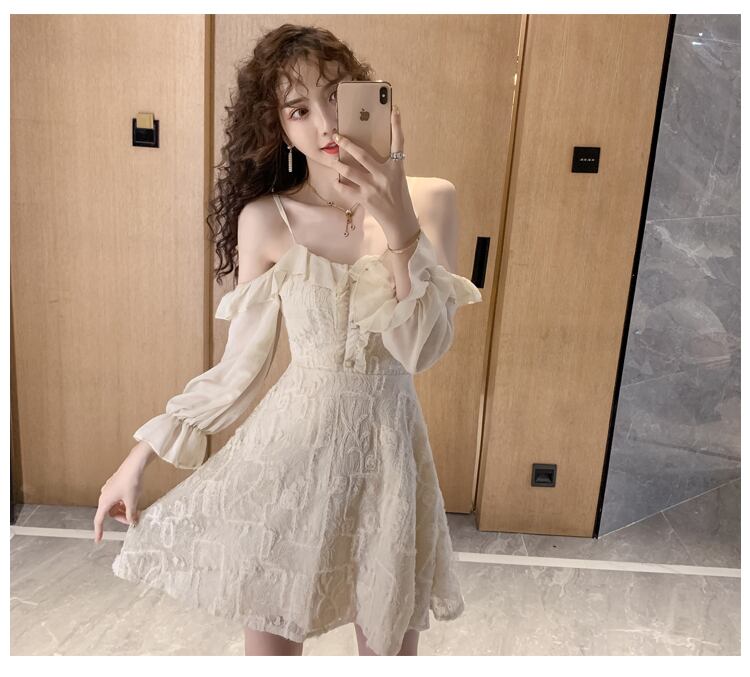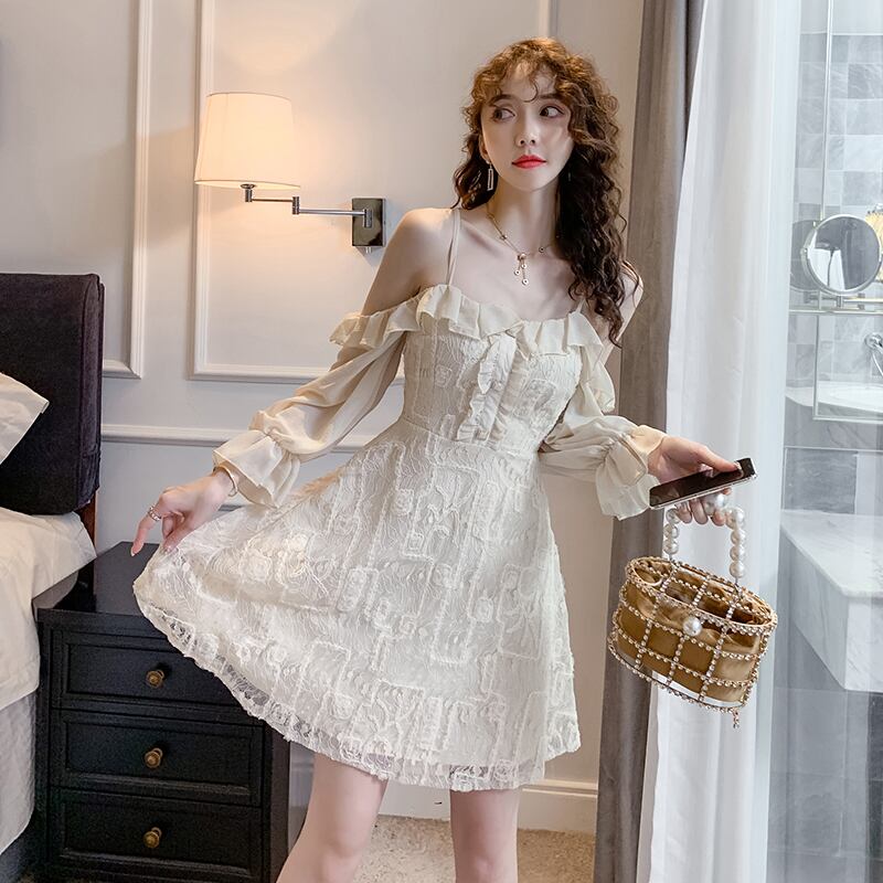 全2色 ワンピース ミニ丈 オフショルダー フリル キャミソール ひざ上 レトロ レース シースルー 透け感 無地 ハイウエスト お出かけ デート 女子会 カジュアル 大人可愛い フェミニン ガーリー 長袖 春 夏 秋