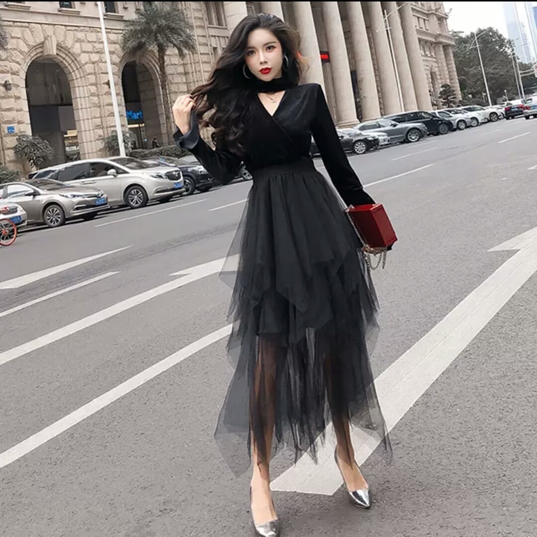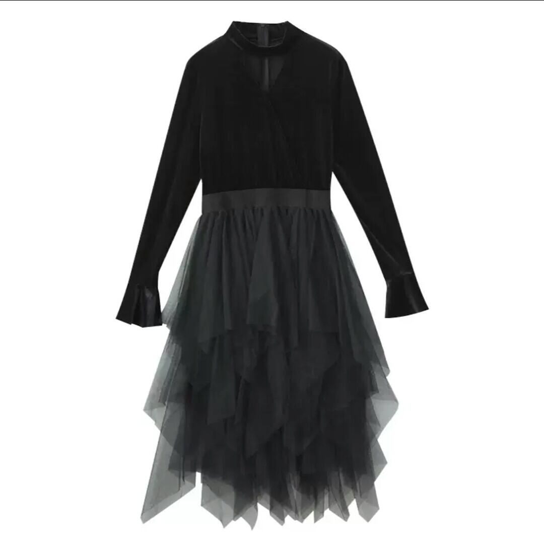 異素材ミックス ワンピース オーガンジー ミモレ丈 長め 大人 エレガント キレイめ お出かけ お買い物 デート 女子会 秋冬 春 パーティー イベント