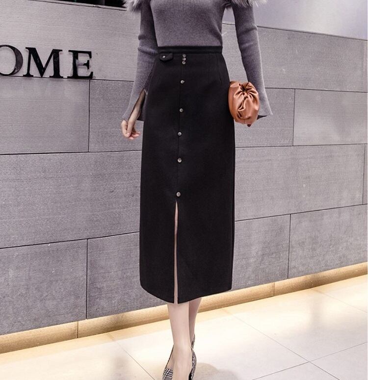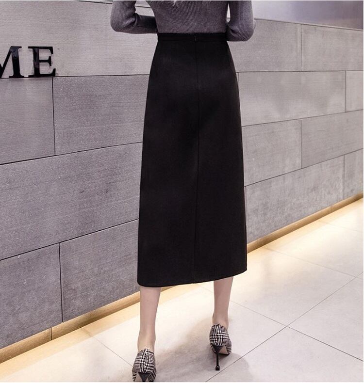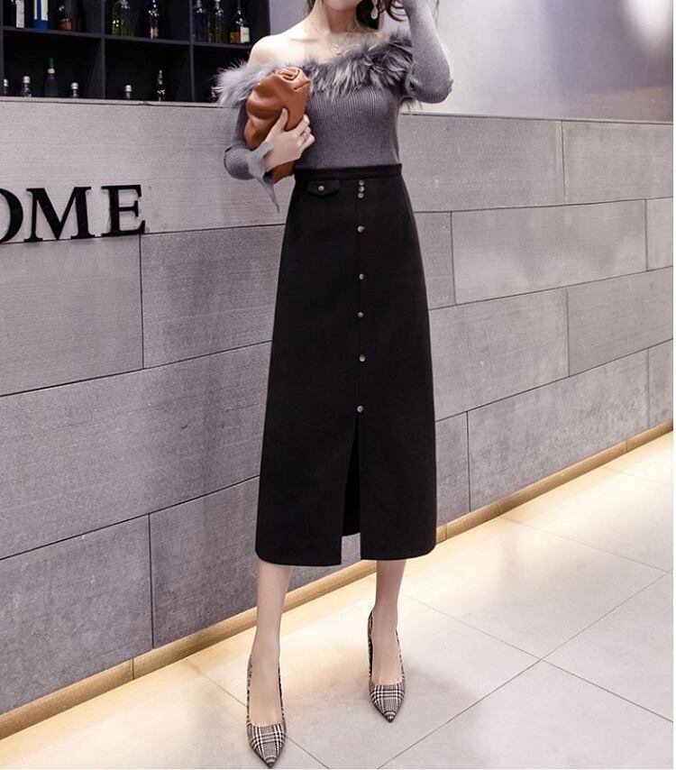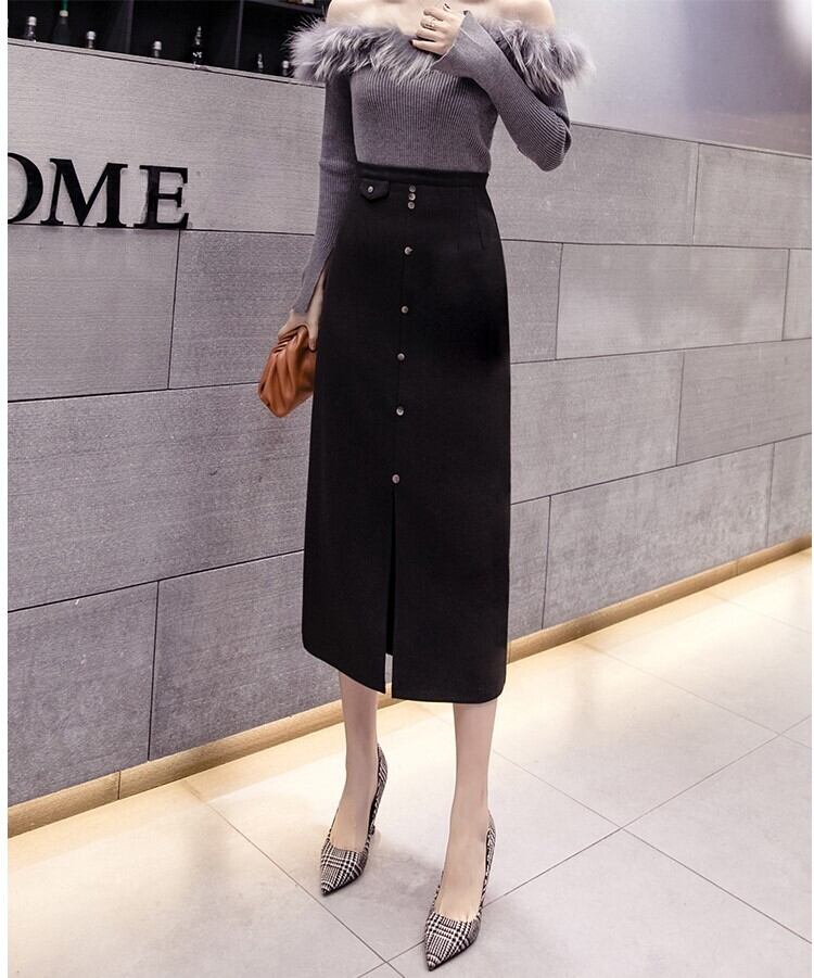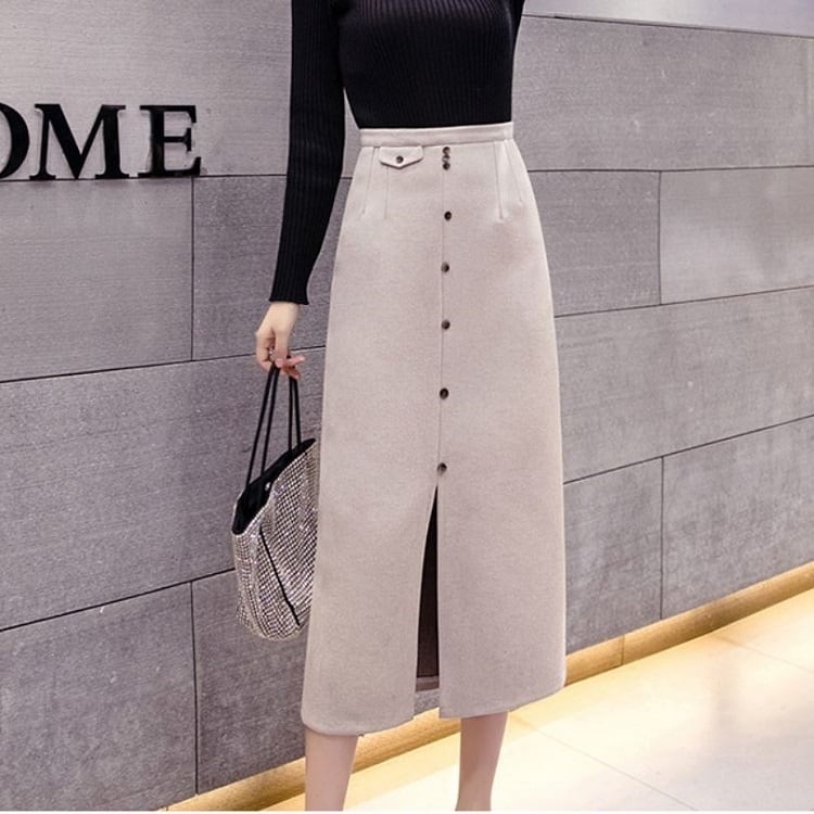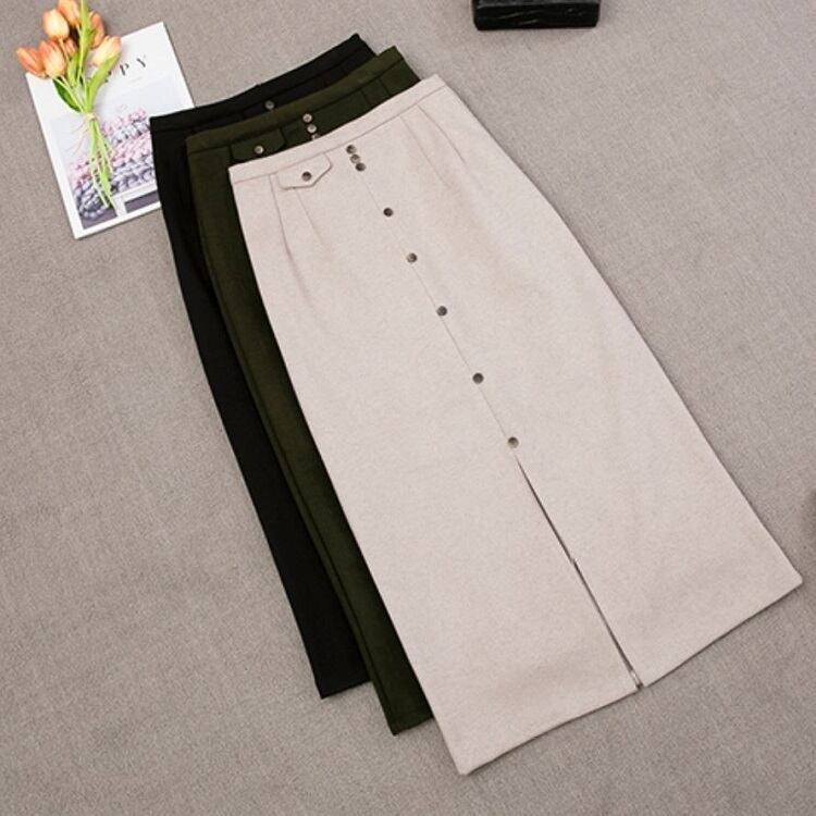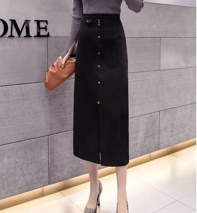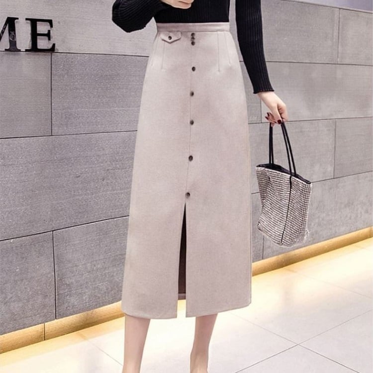 全2色 スリットスカート スカート ハイウエスト ロング丈 フロントボタン 無地 レトロ セクシー シンプル きれいめ 上品 お出かけ 通勤 オフィス 秋冬 アプリコット ブラック