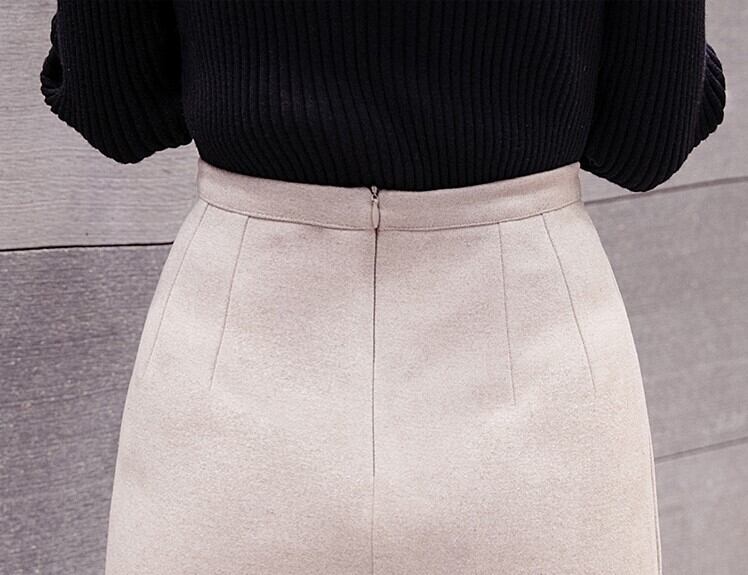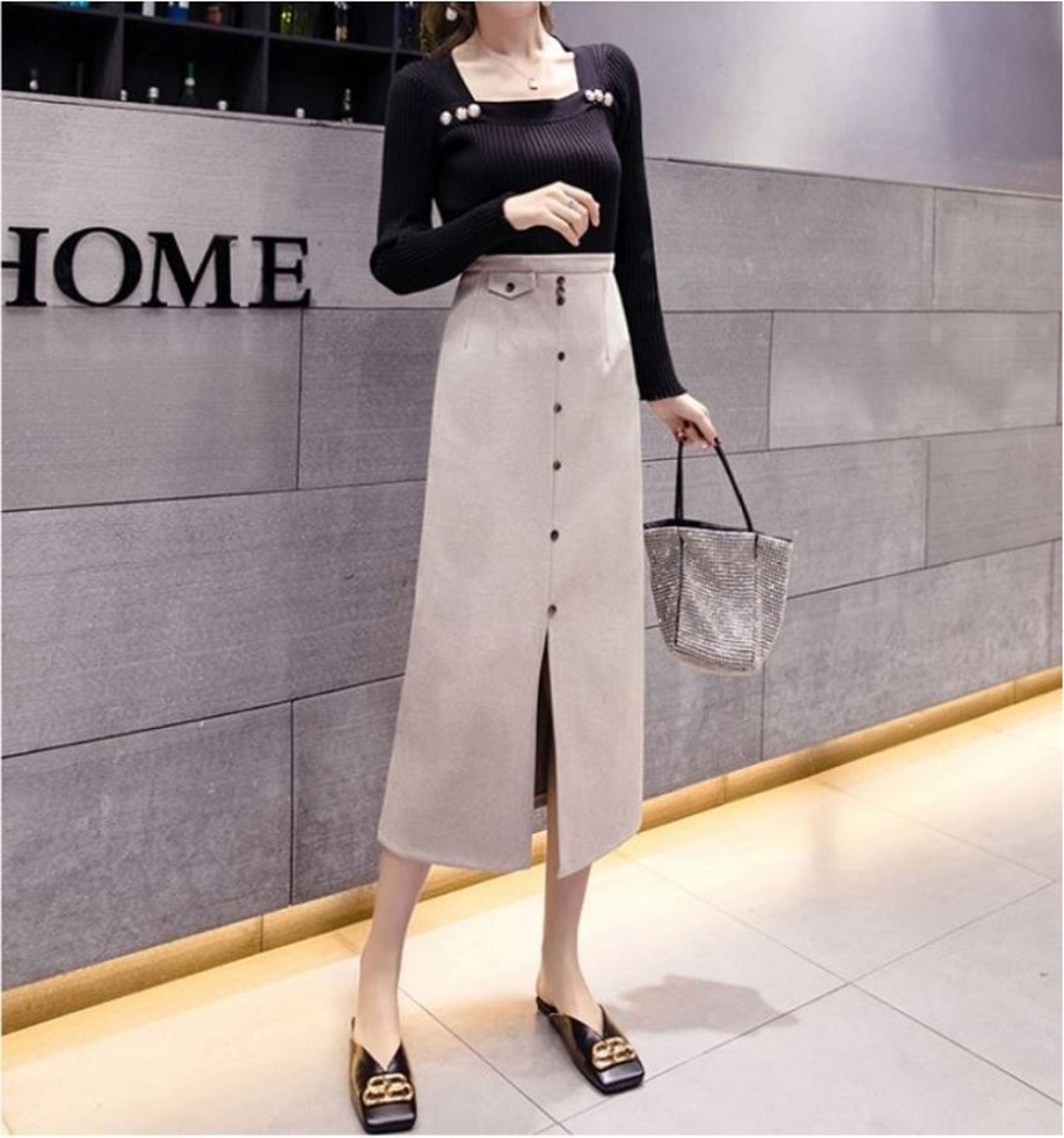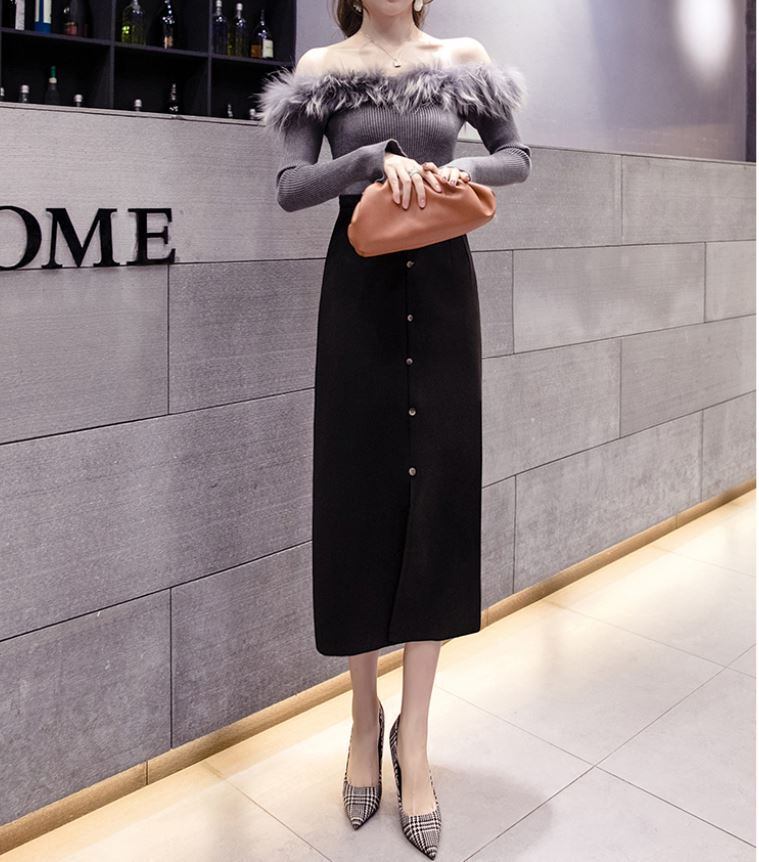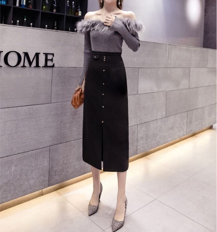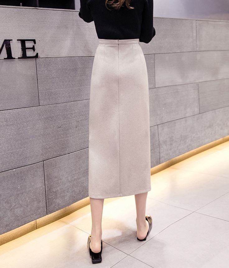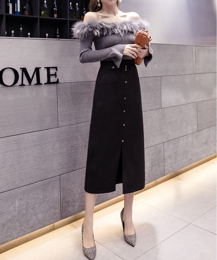 全2色 スリットスカート スカート ハイウエスト ロング丈 フロントボタン 無地 レトロ セクシー シンプル きれいめ 上品 お出かけ 通勤 オフィス 秋冬 アプリコット ブラック