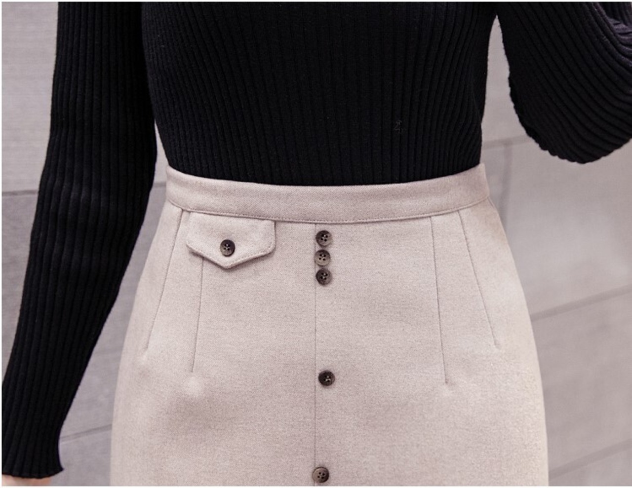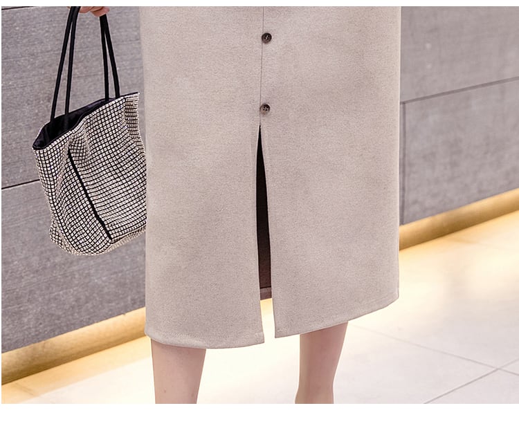 深めに入ったスリットとフロントボタンが上品な印象。
