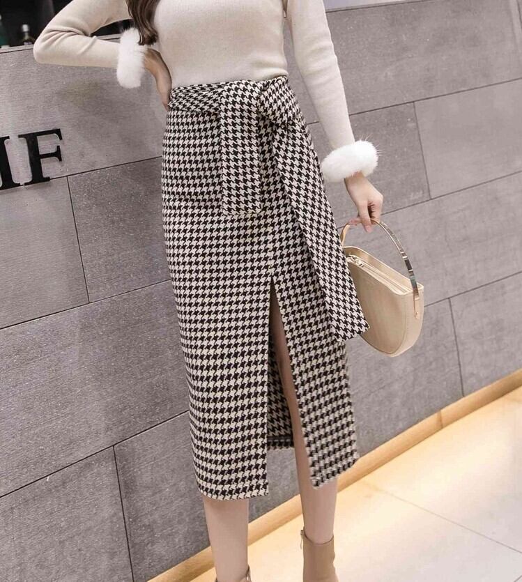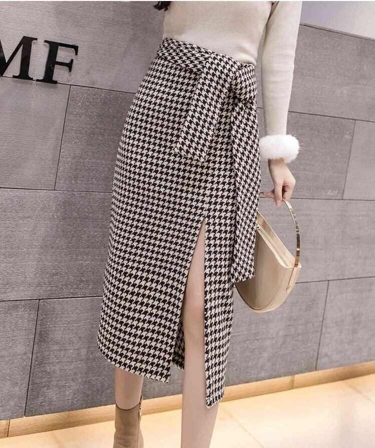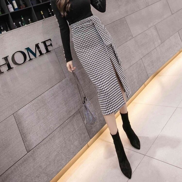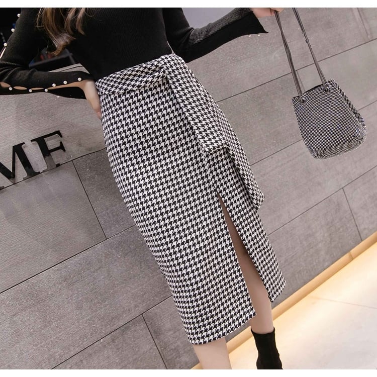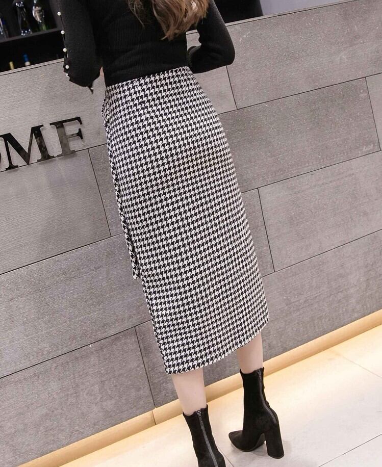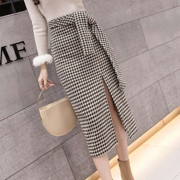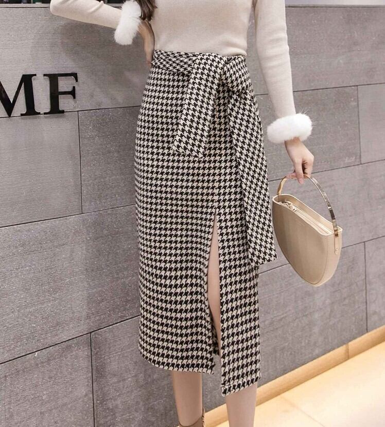 全2色 スリットスカート スカート ハイウエスト ミディ丈 ウエストリボン 千鳥格子 レトロ セクシー シンプル きれいめ 上品 お出かけ 通勤 オフィス 秋冬 ブラックブラウン