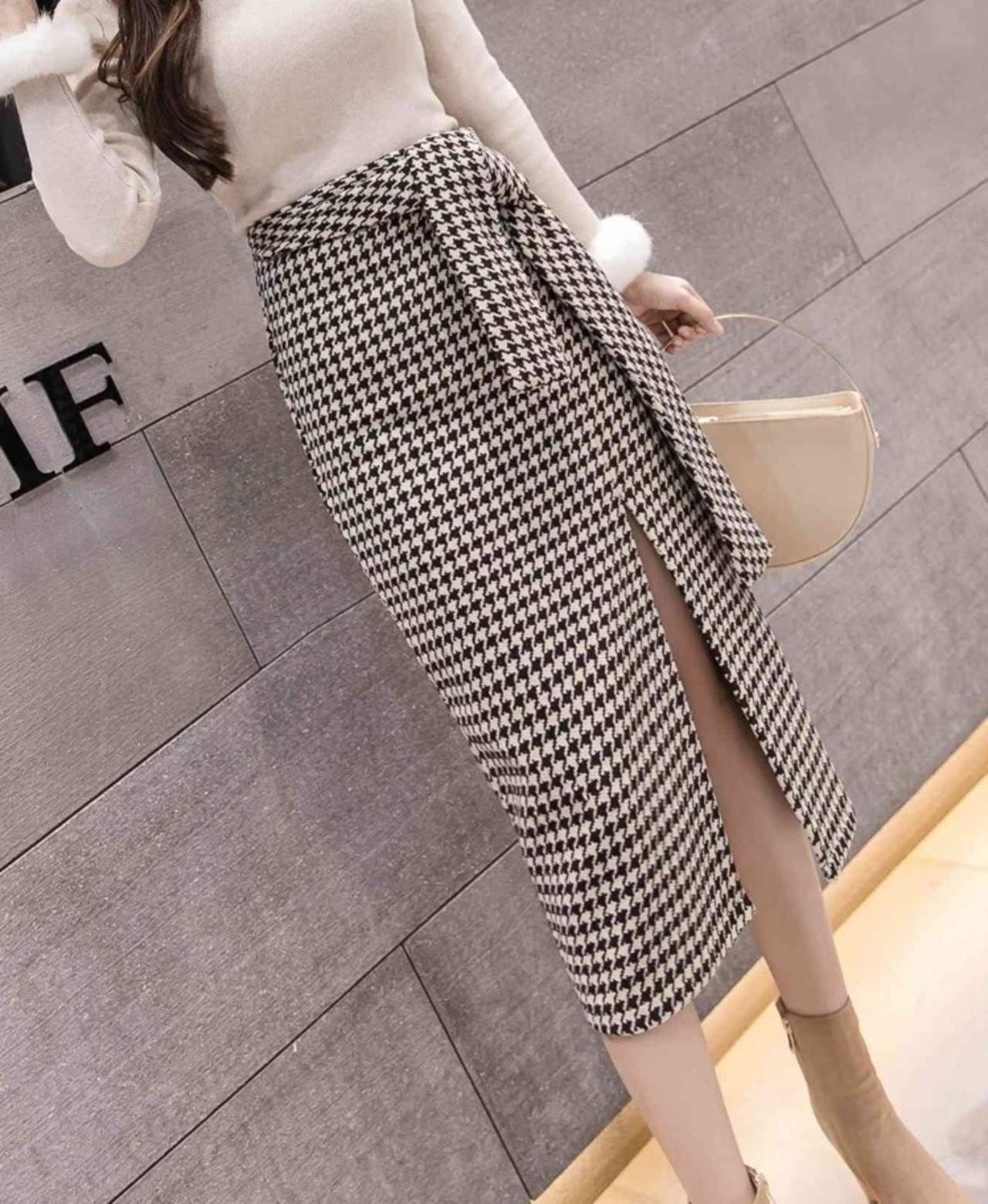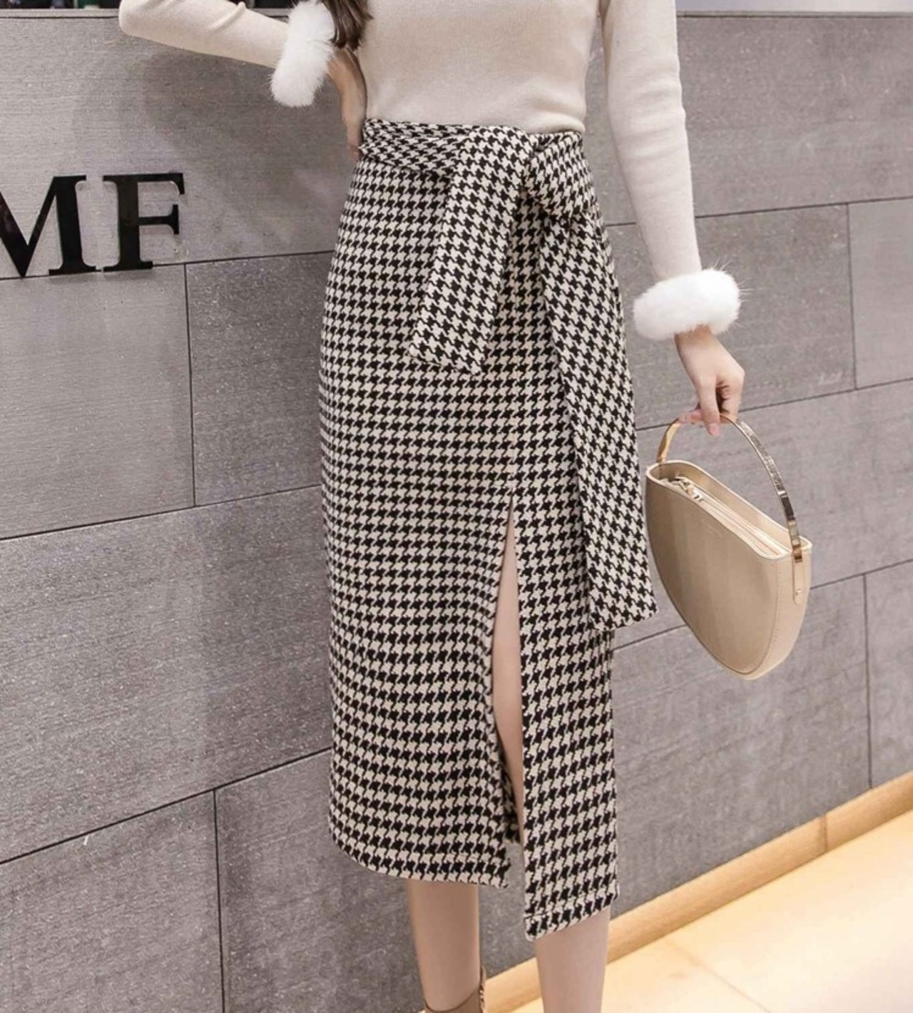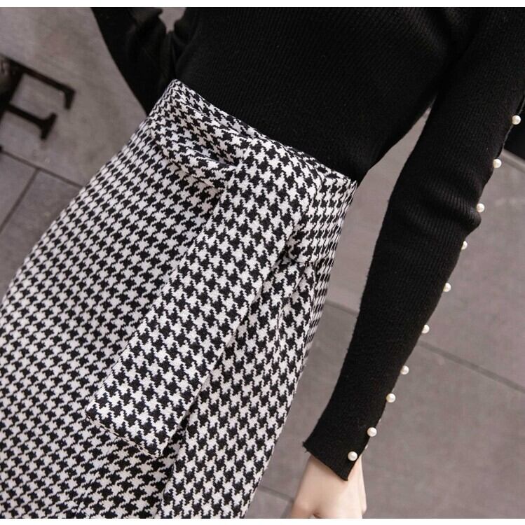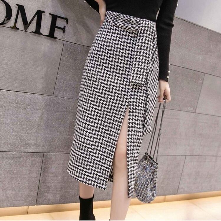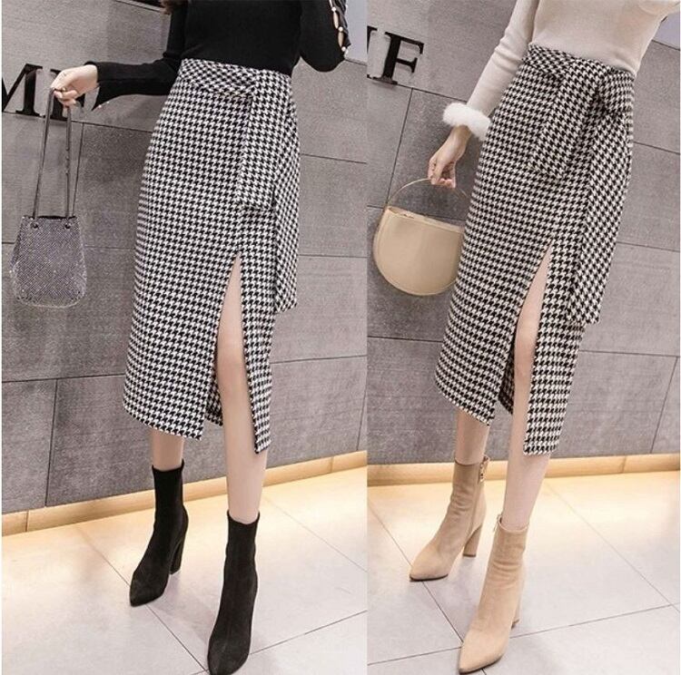 全2色 スリットスカート スカート ハイウエスト ミディ丈 ウエストリボン 千鳥格子 レトロ セクシー シンプル きれいめ 上品 お出かけ 通勤 オフィス 秋冬 ブラックブラウン