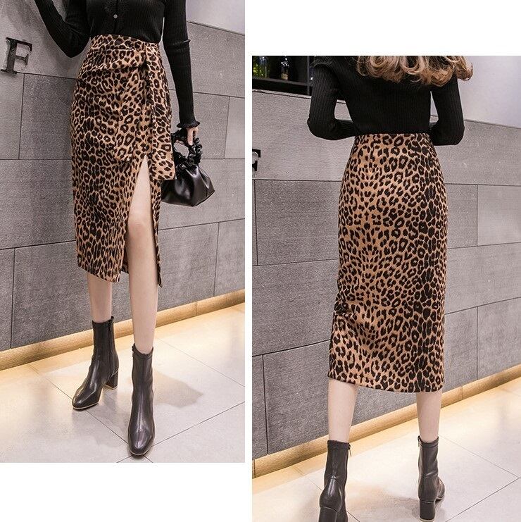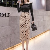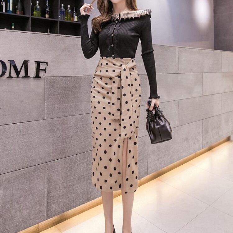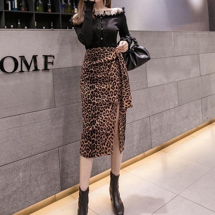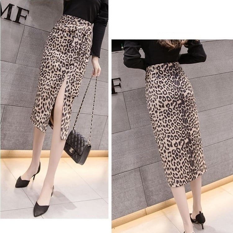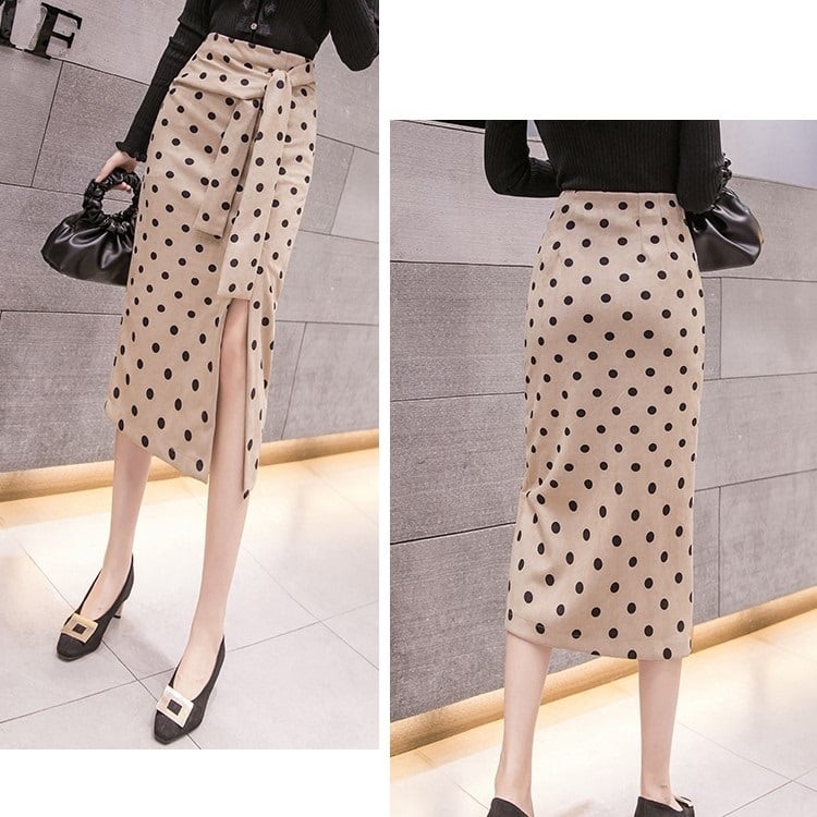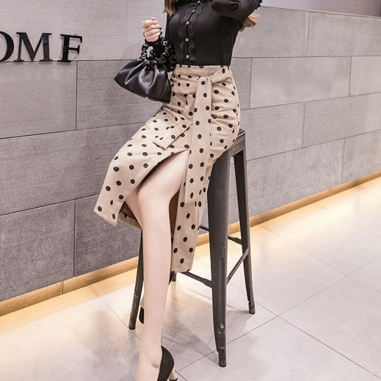 全3色 スリットスカート スカート ハイウエスト ミディ丈 ウエストリボン レオパード ヒョウ柄 ドット柄 レトロ セクシー シンプル きれいめ 上品 お出かけ デート 秋冬 ベージュ ブラウン