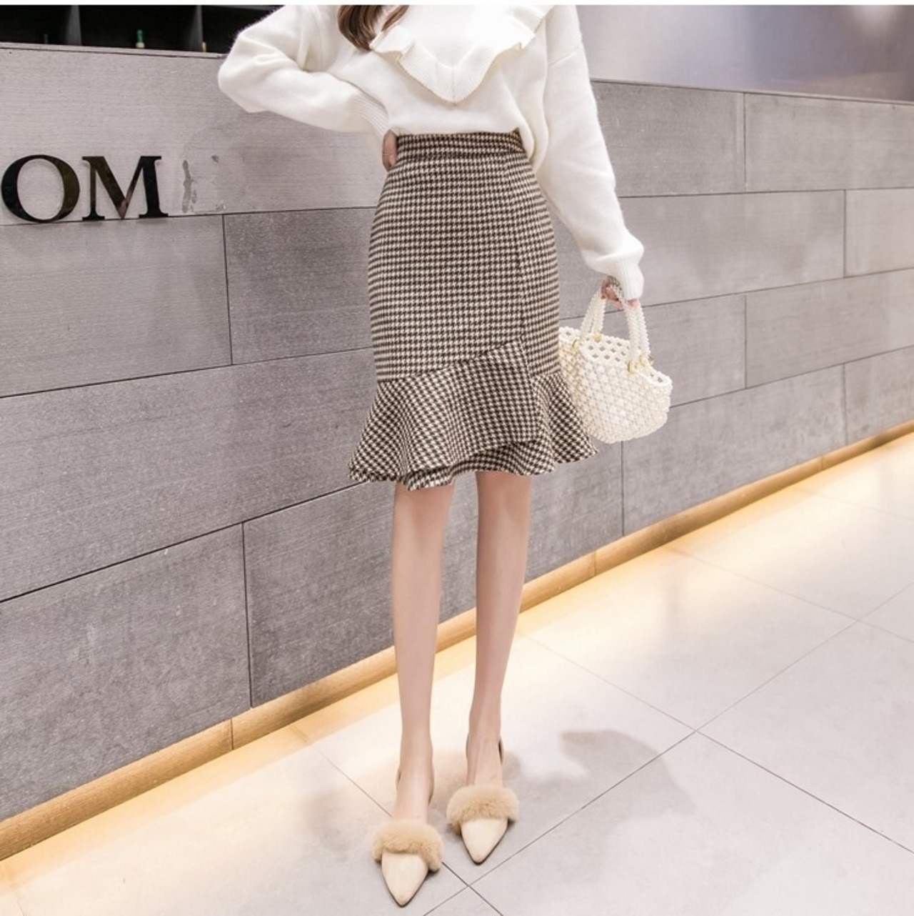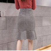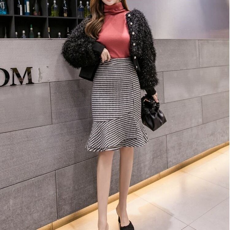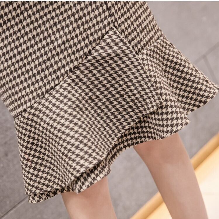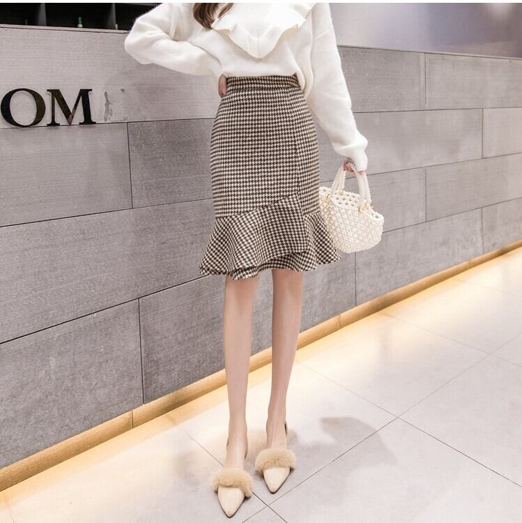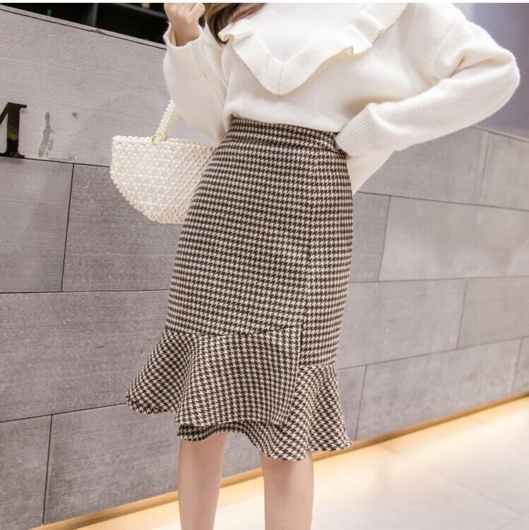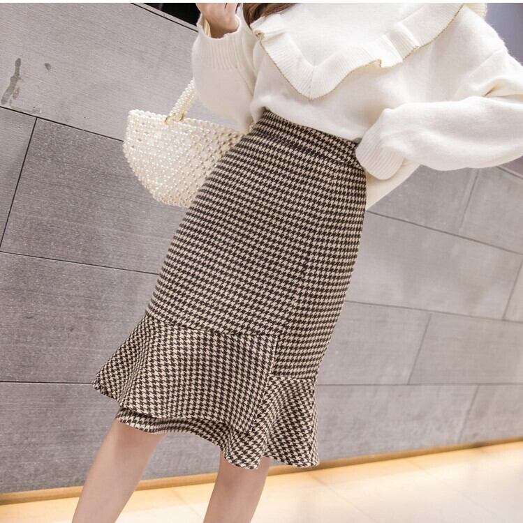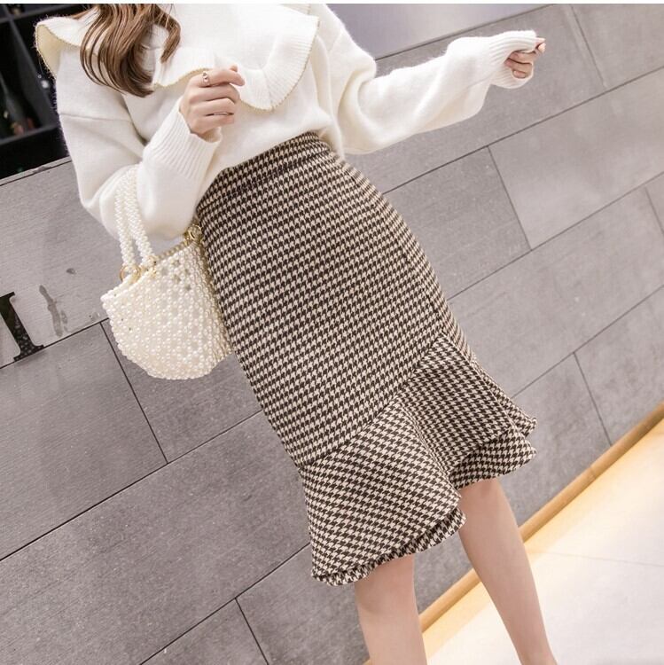 全2色 タイトスカート フィッシュテール 千鳥格子 ひざ丈 ハイウエスト レトロ シンプル きれいめ 上品 お出かけ デート 通勤 オフィス 秋冬 カーキ グレー