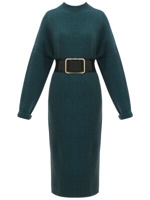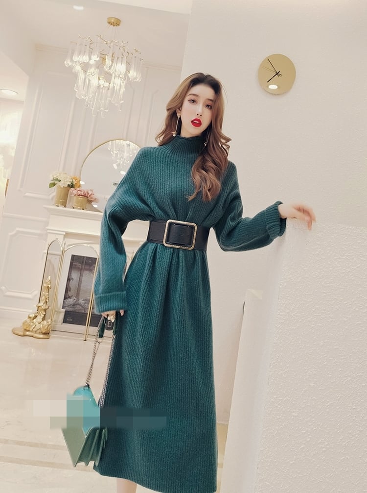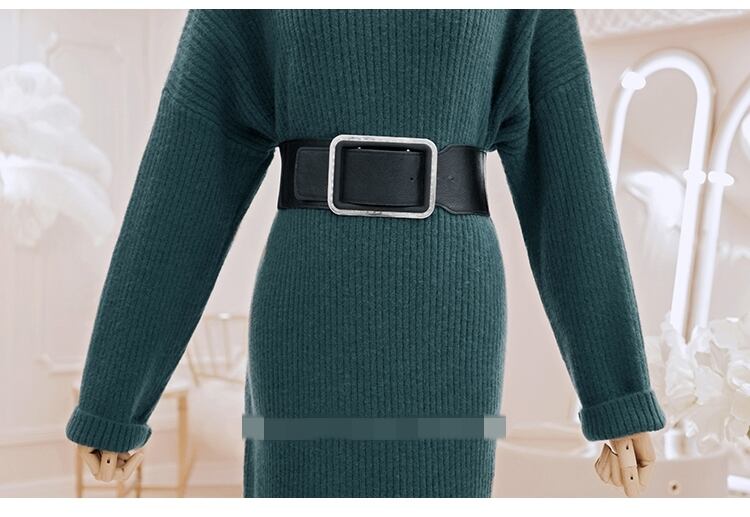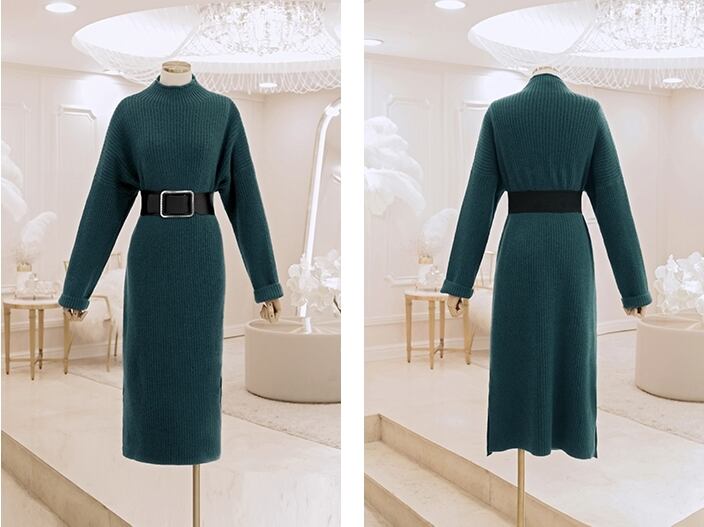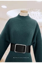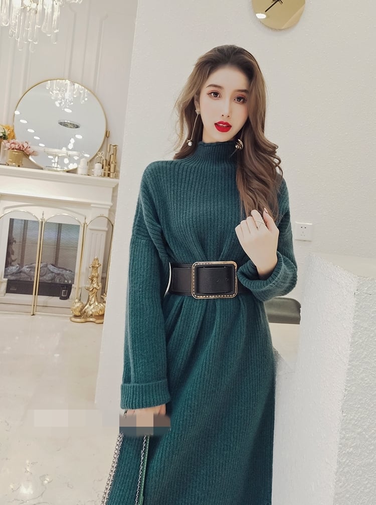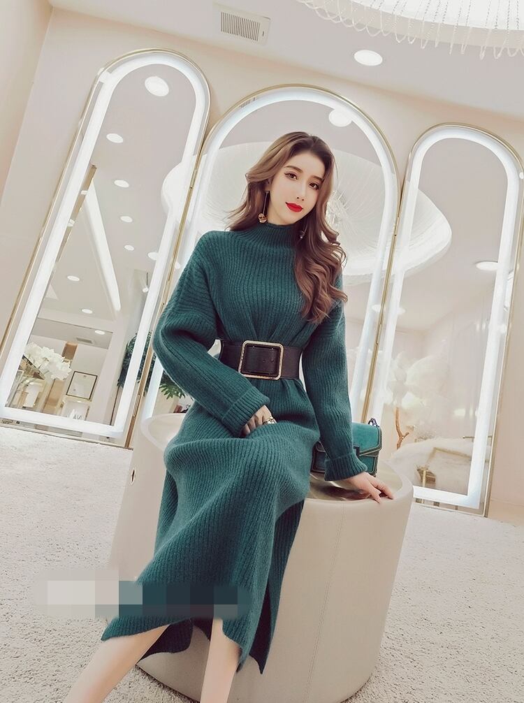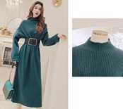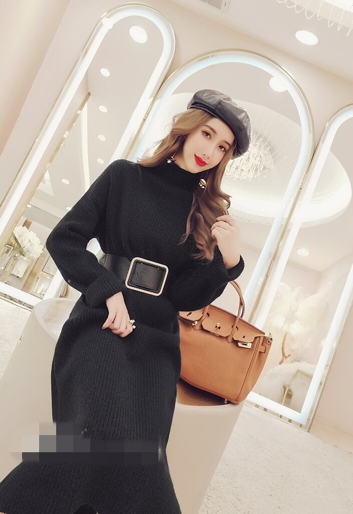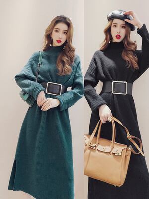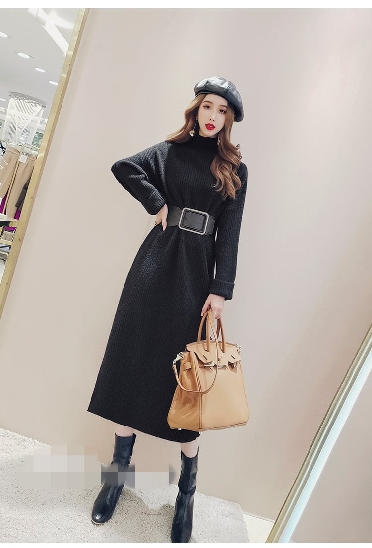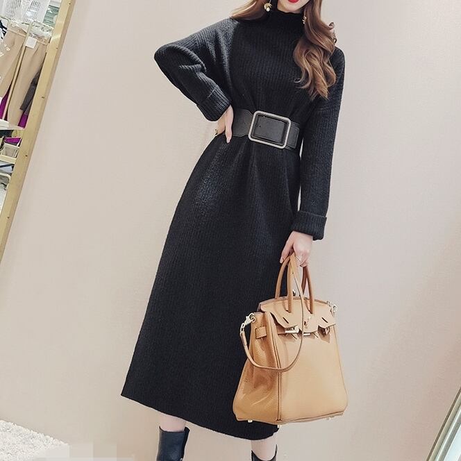 全2色 ニットワンピ 長袖 ハイネック リブニット ワンピース ベルト付き ミモレ丈 ひざ下丈 ゆったり 秋冬 カジュアル お出かけ デート 女子会 大人可愛い フェミニン ガーリー こなれ感 レトロ Iライン ざっくり 無地