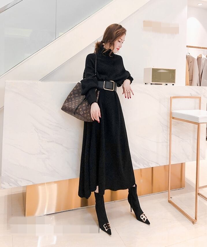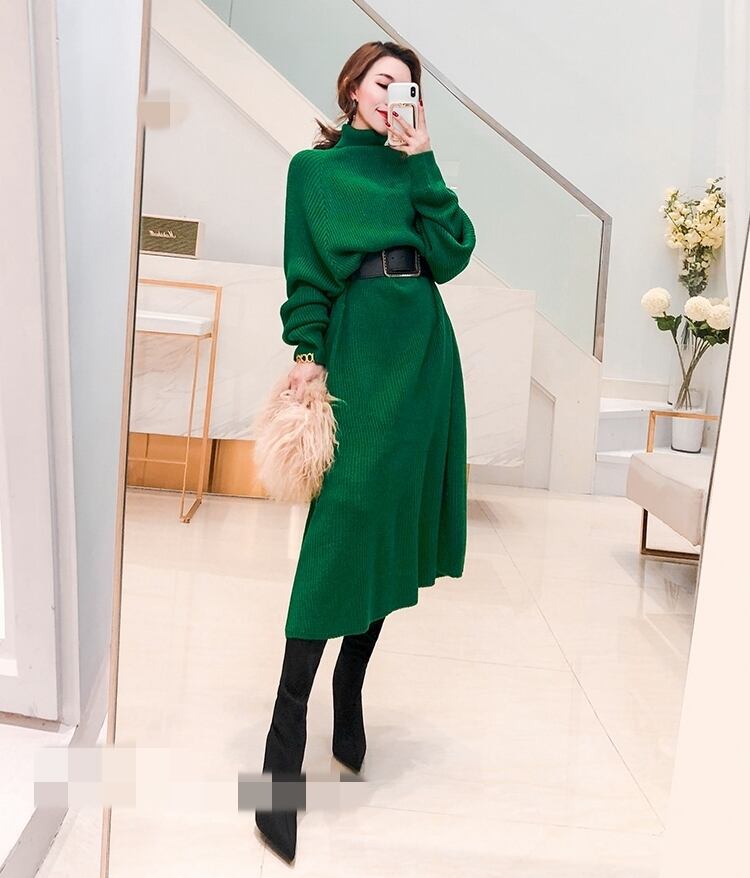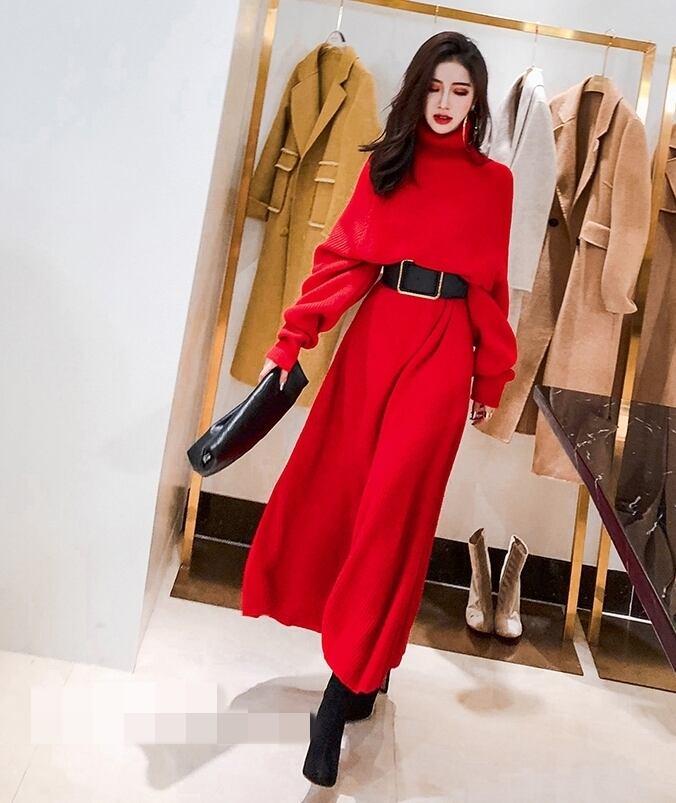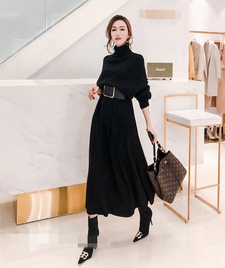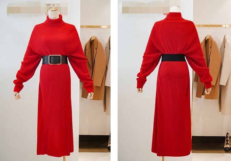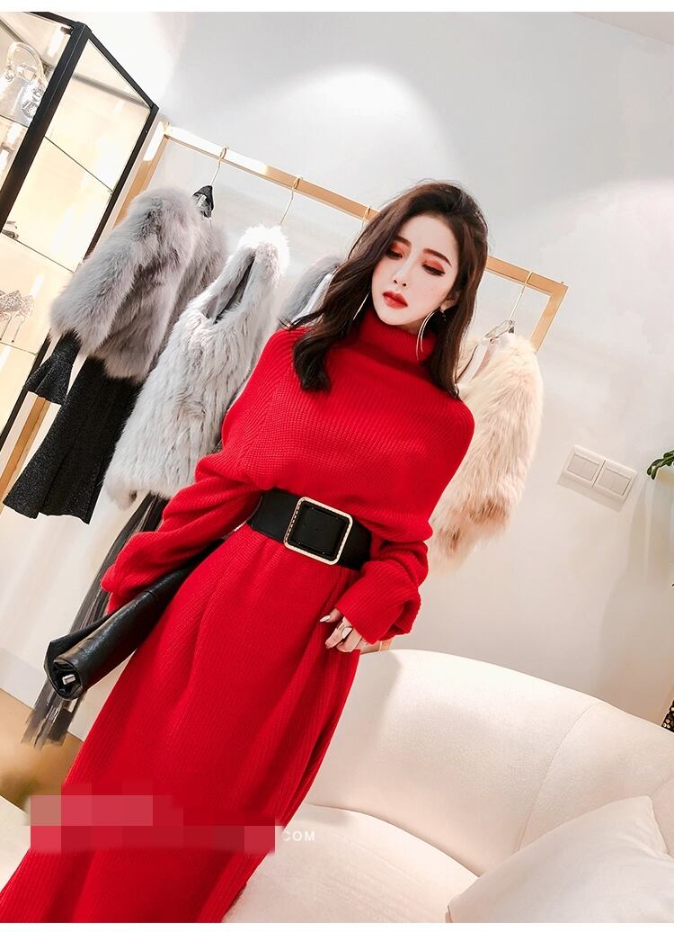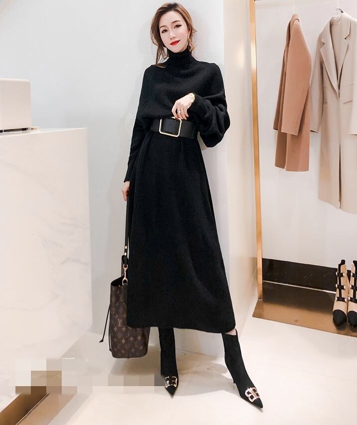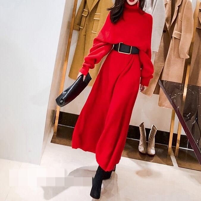 タートルネックで首元まで温かいロング丈ニットワンピ。