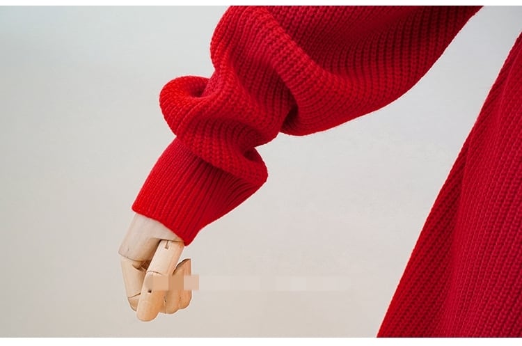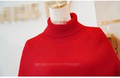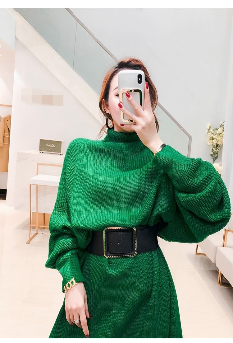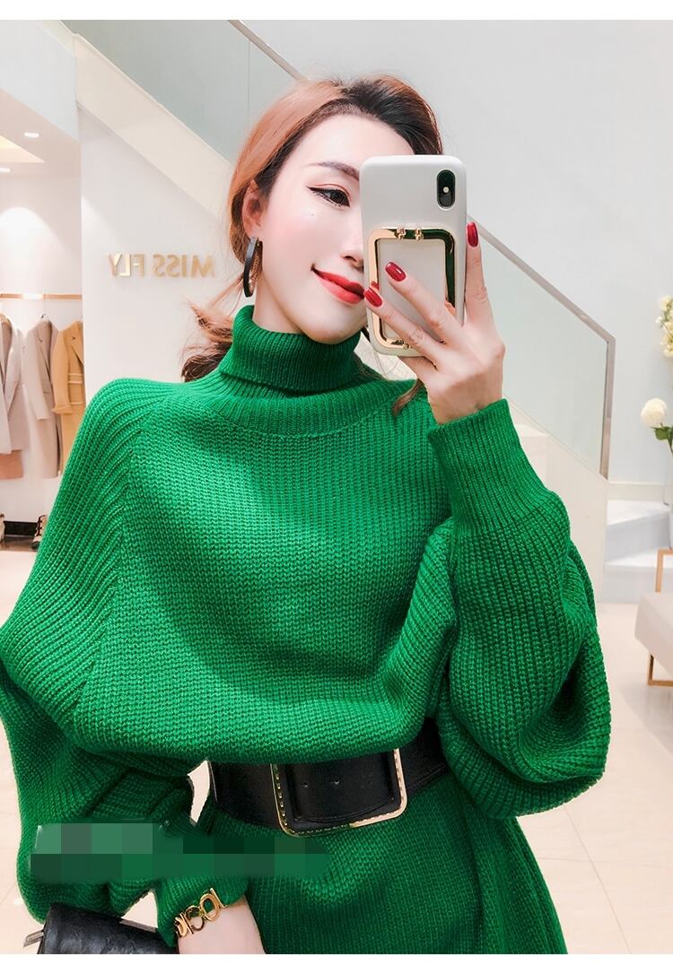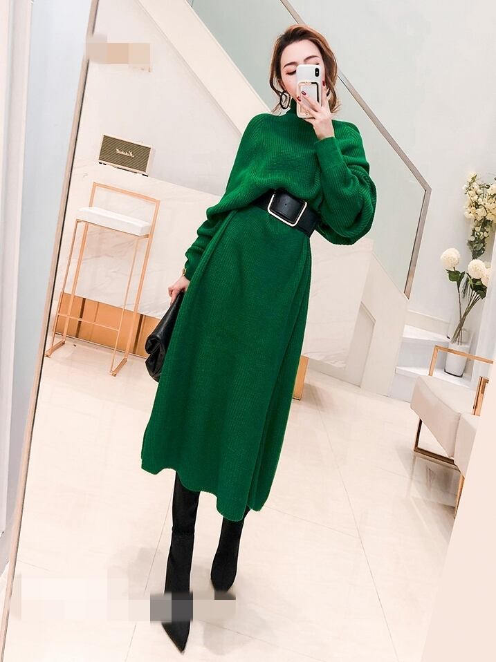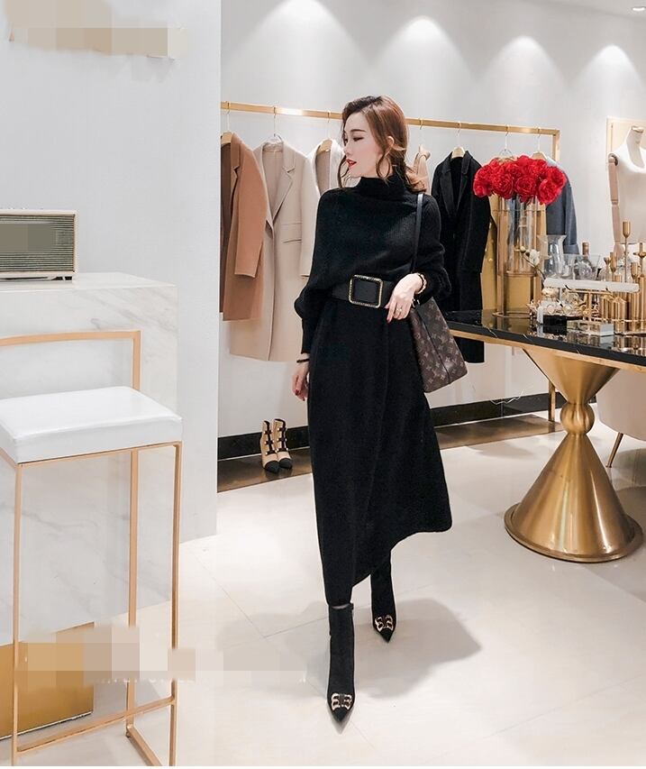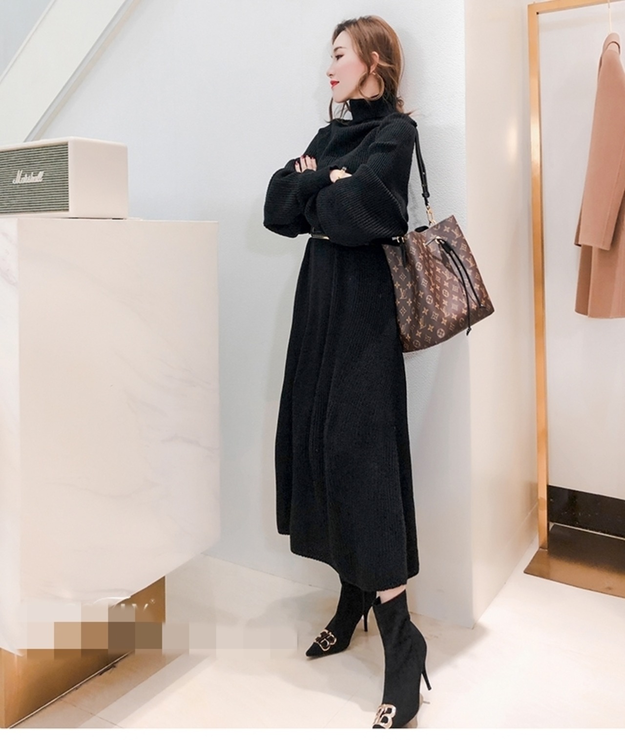 タートルネックで首元まで温かいロング丈ニットワンピ。