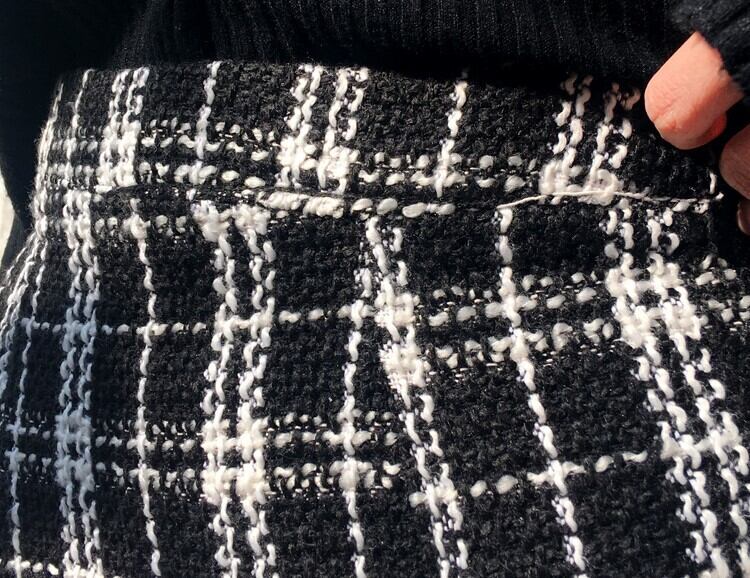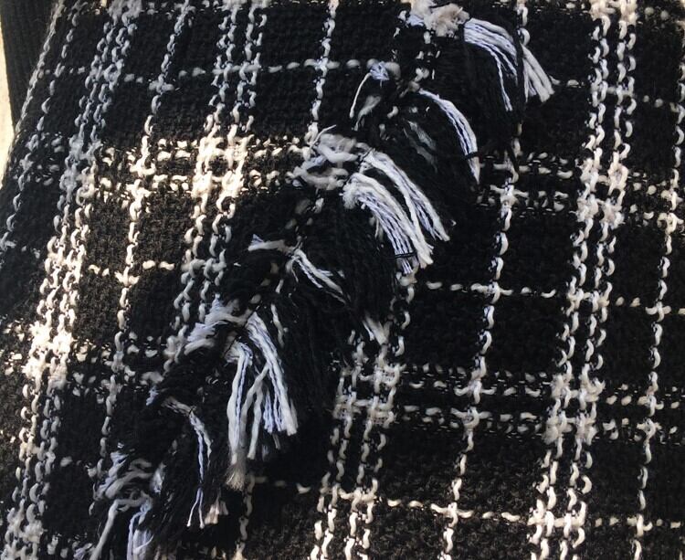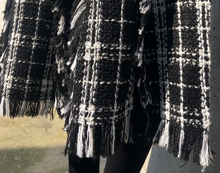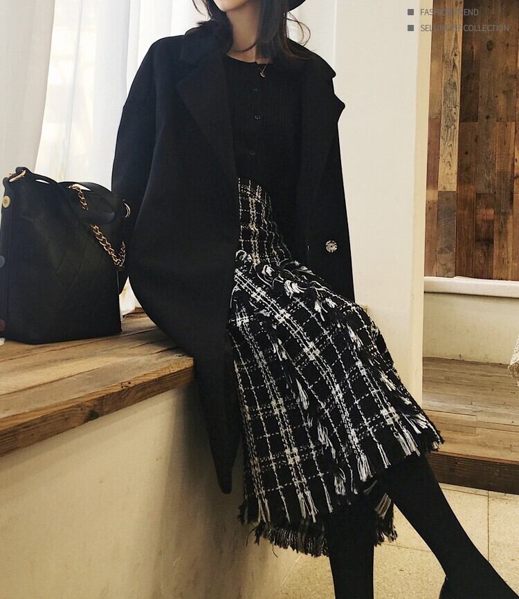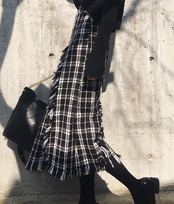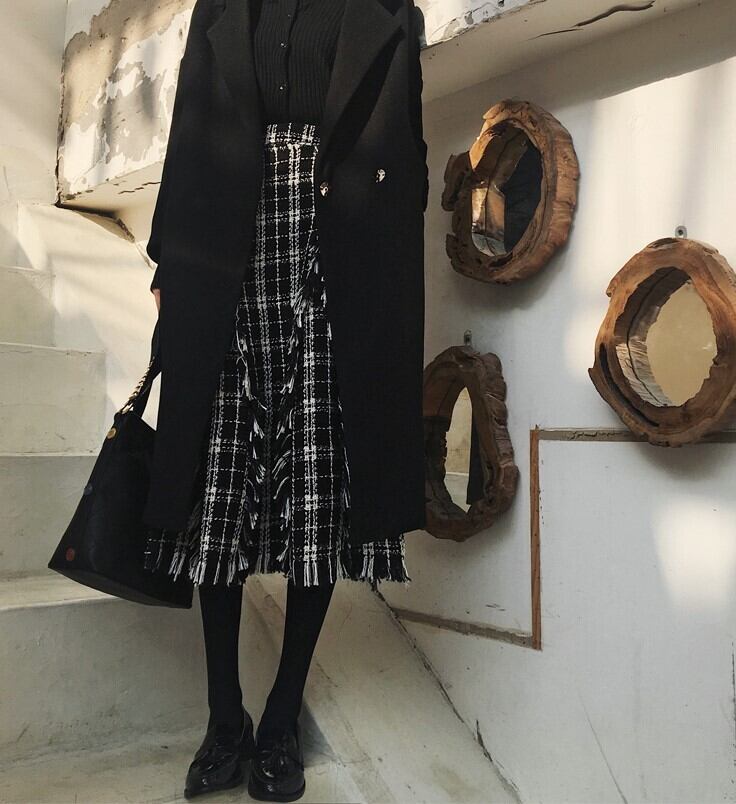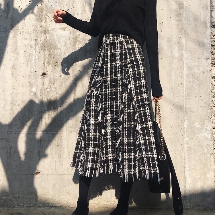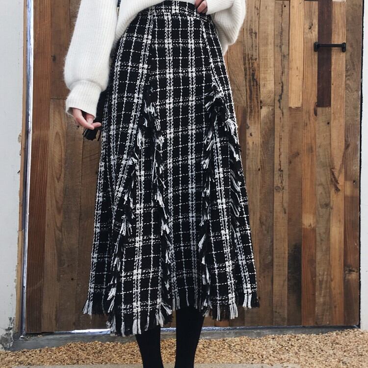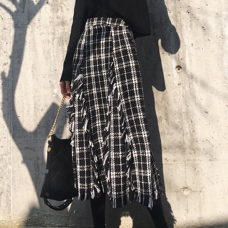 ツイードスカート フリンジ アシンメトリー チェック柄 ブラック ハイウエスト ロングスカート 大人カジュアル モード レトロ 韓国 オルチャン