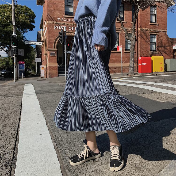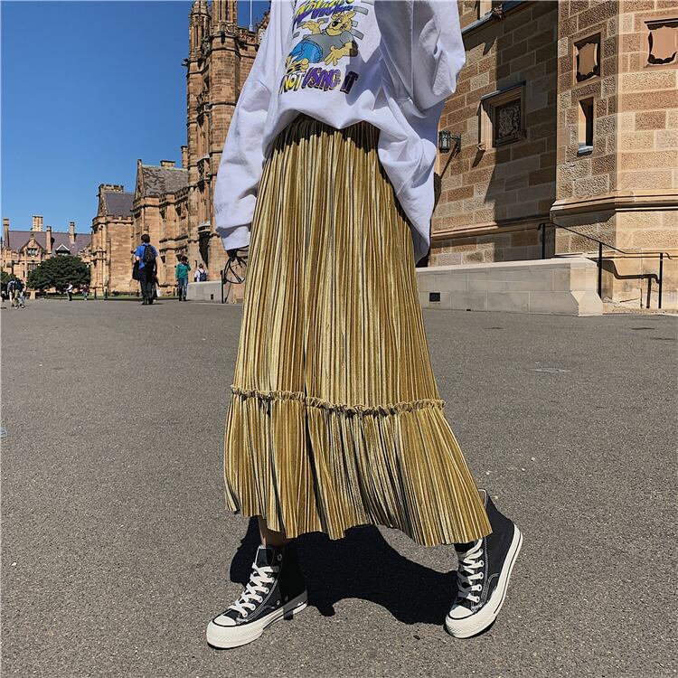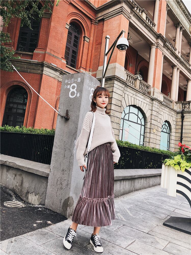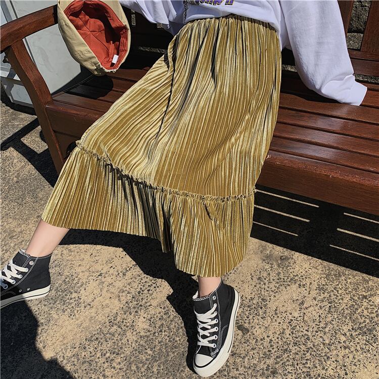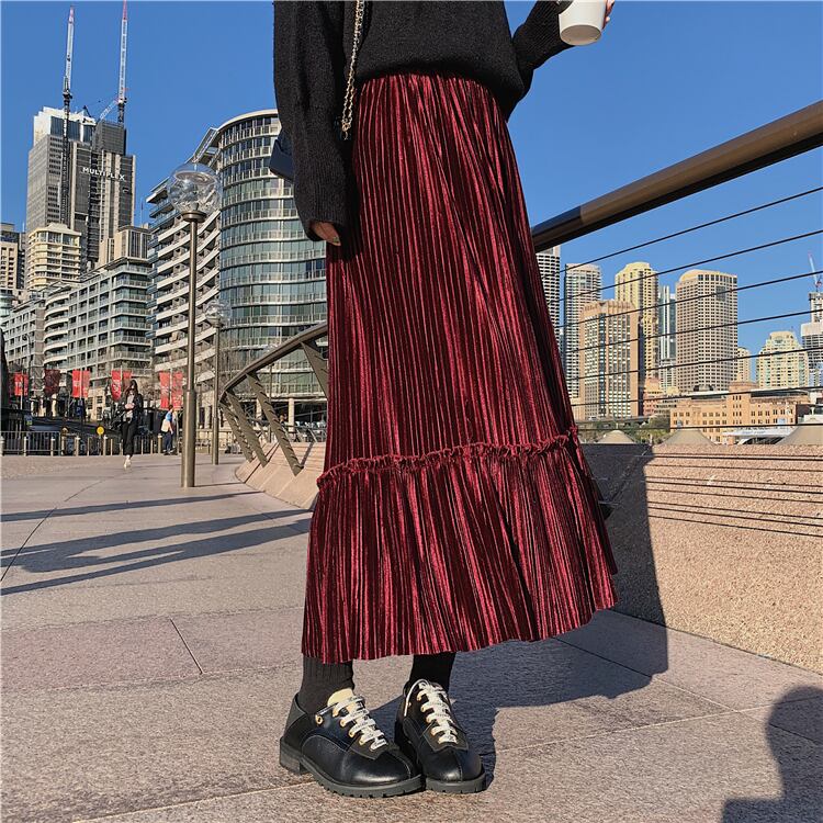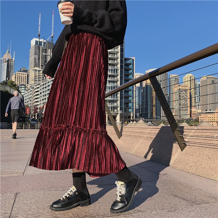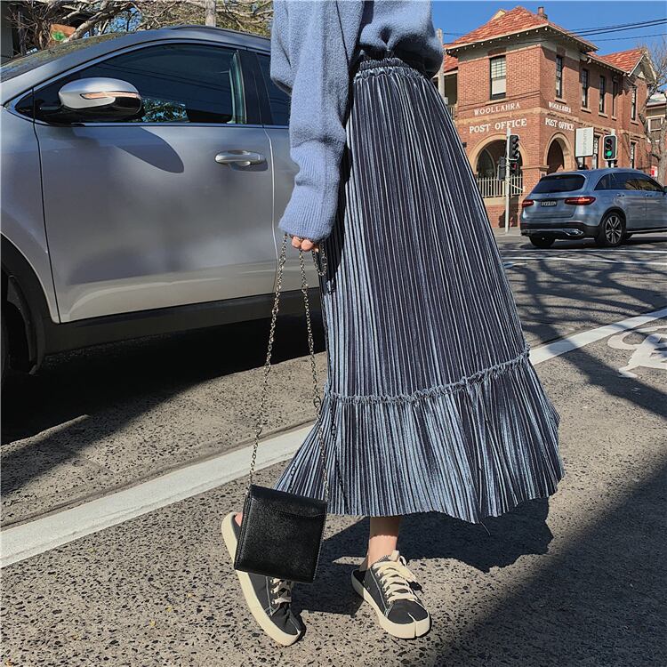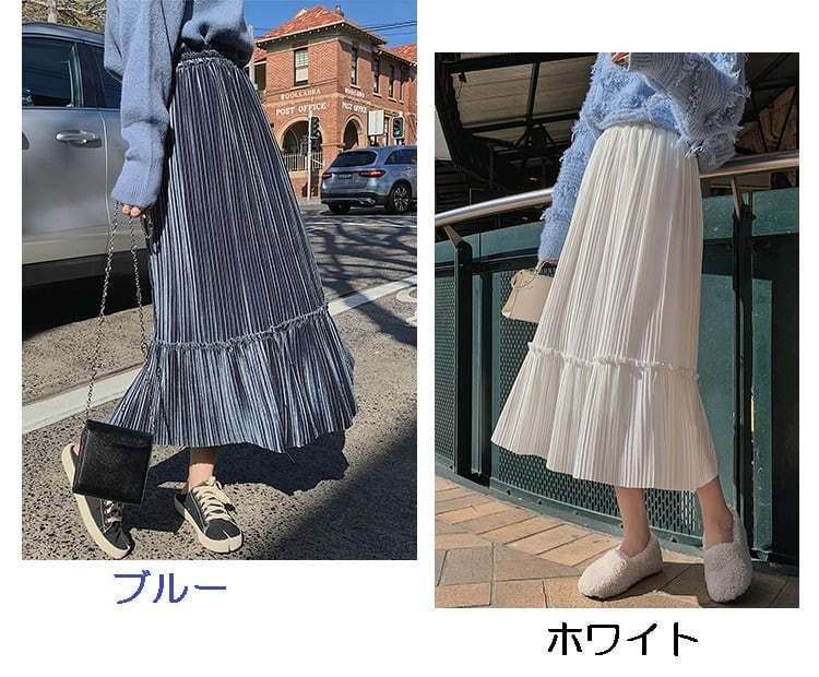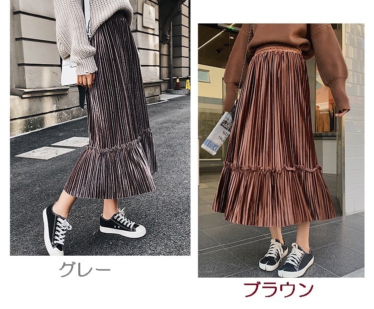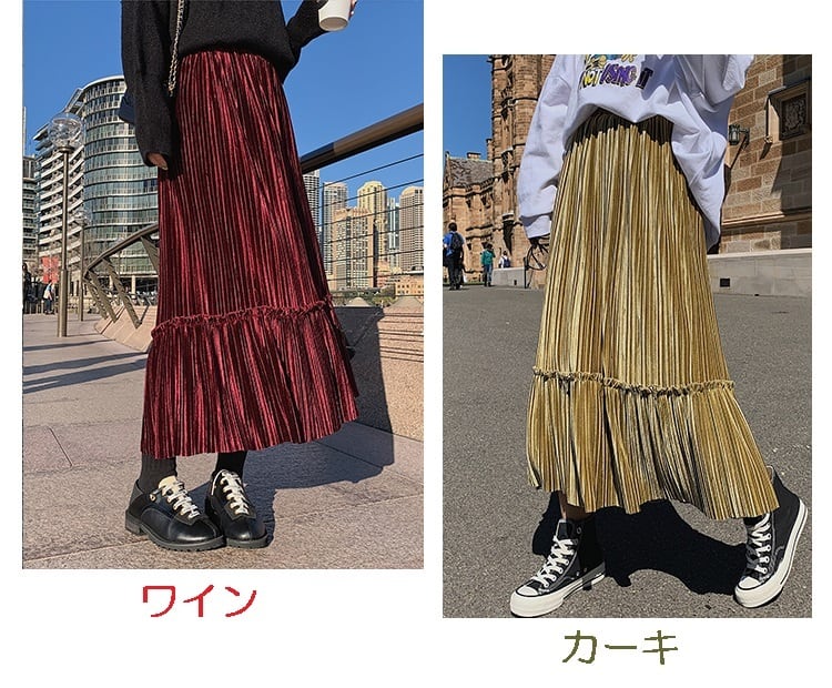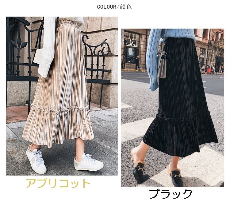 全6色 プリーツスカート ロングスカート ベロア ハイウエスト ウエストゴム 大人カジュアル 上品 エレガント 休日コーデ 秋 冬 韓国 オルチャン