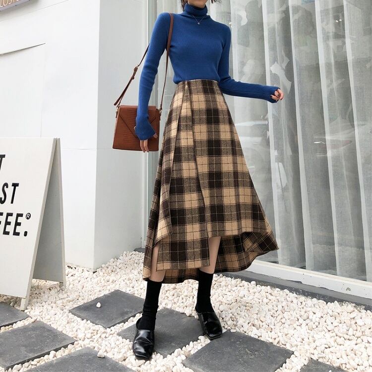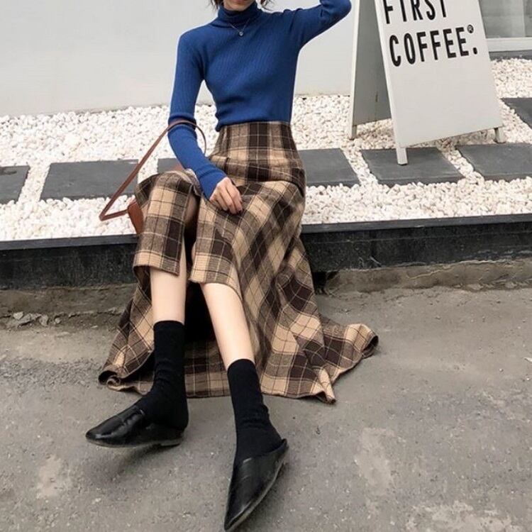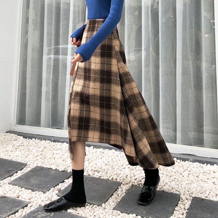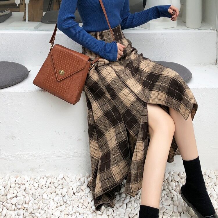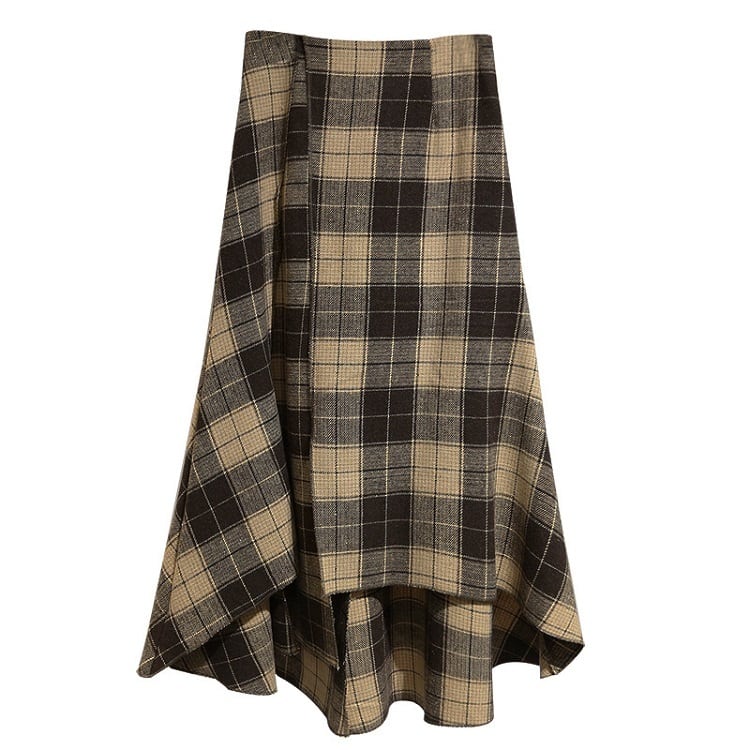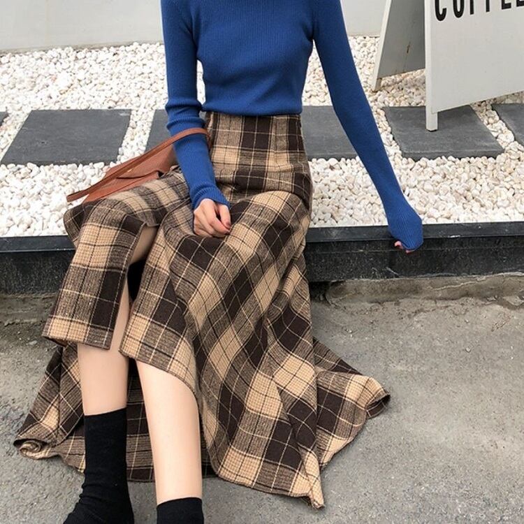 ロングスカート ウール フィッシュテール チェック スリット ハイウエスト レトロ ゆったり セクシー シンプル カジュアル お出かけ デート 通学 秋冬 カーキ