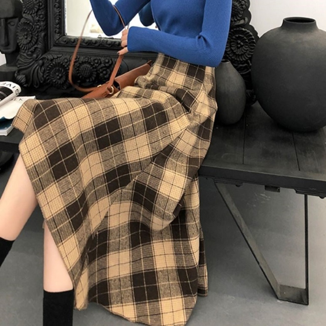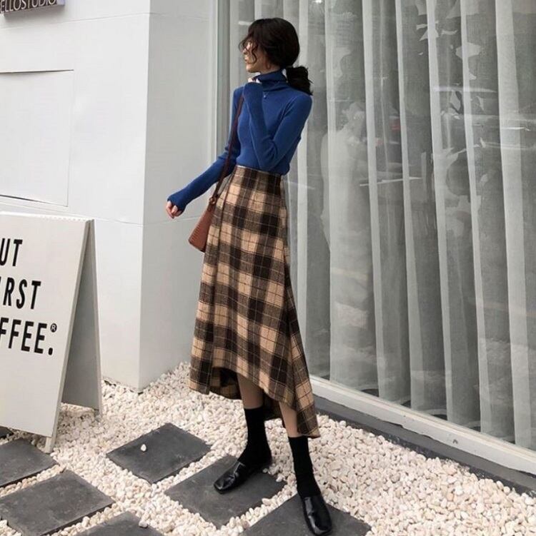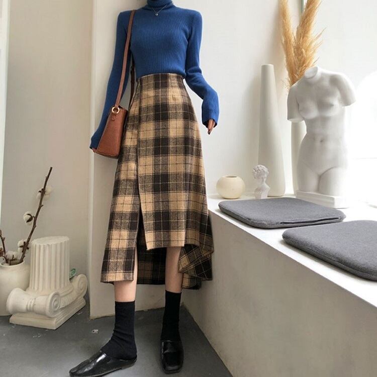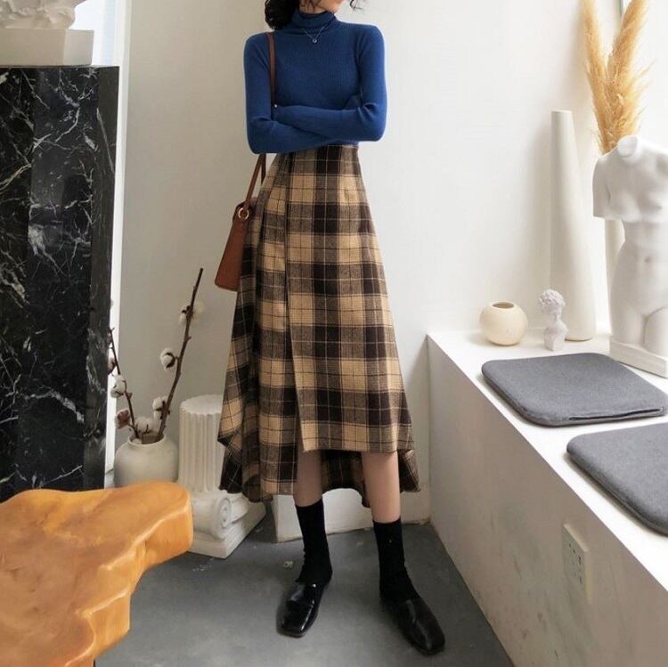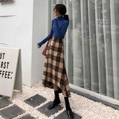 ロングスカート ウール フィッシュテール チェック スリット ハイウエスト レトロ ゆったり セクシー シンプル カジュアル お出かけ デート 通学 秋冬 カーキ