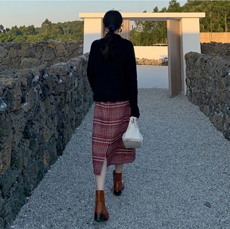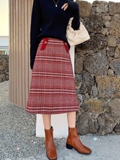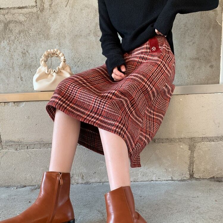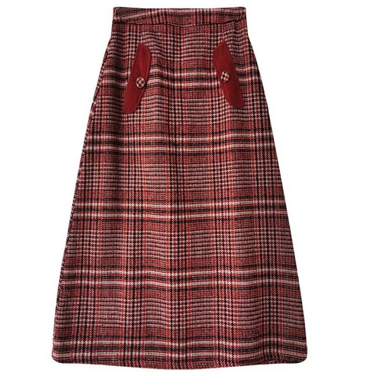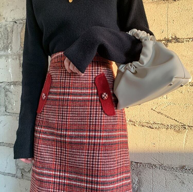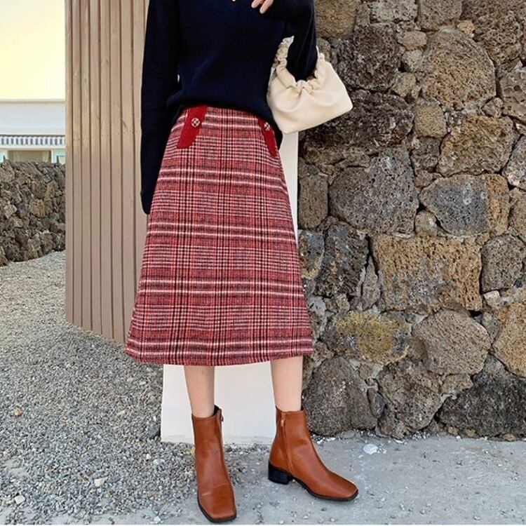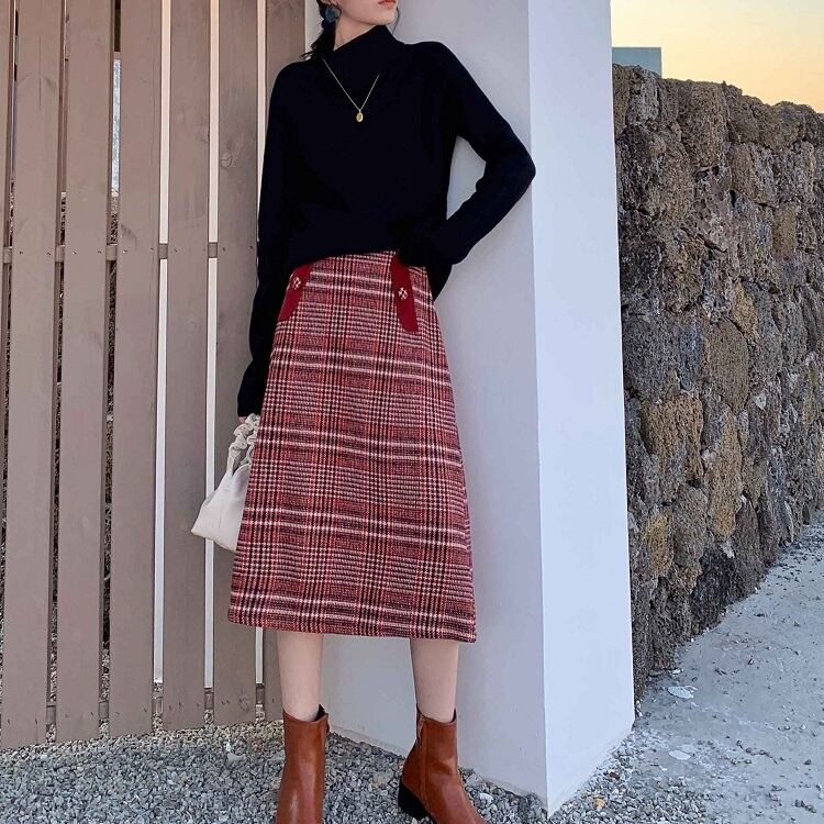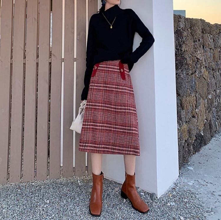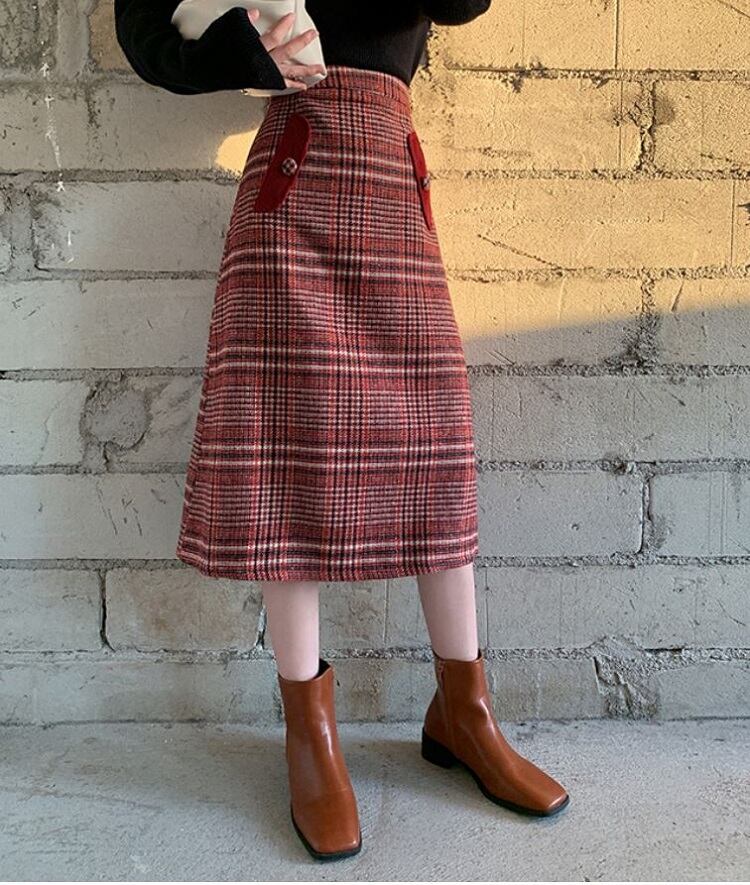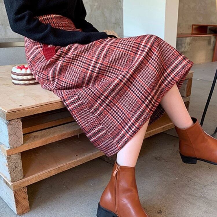 チェックスカート ミモレ丈 チェック ウール ハイウエスト レトロ シンプル カジュアル お出かけ デート 通学 秋冬 レッド