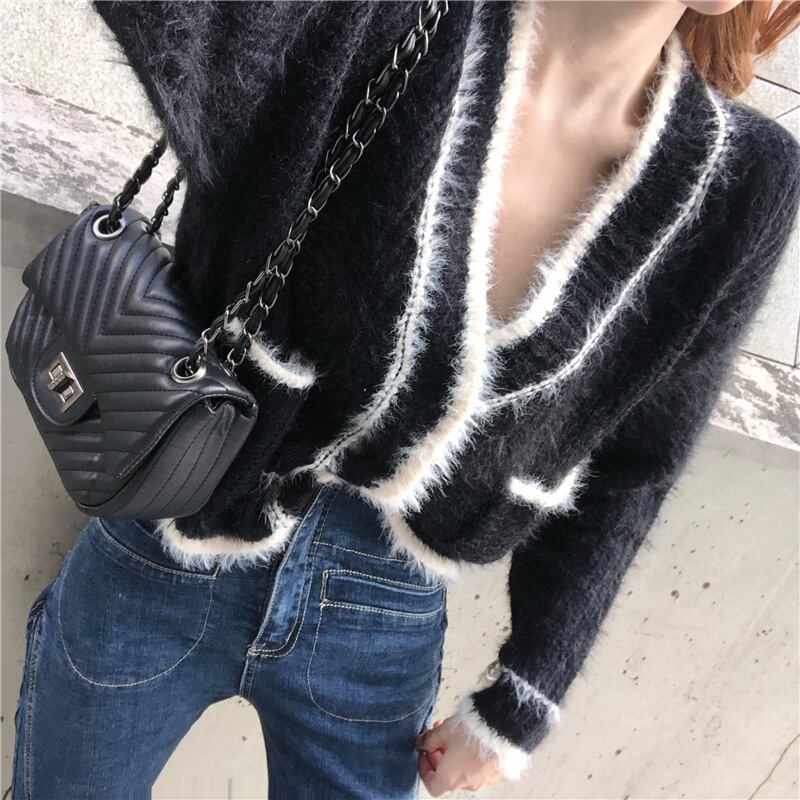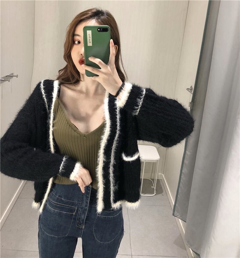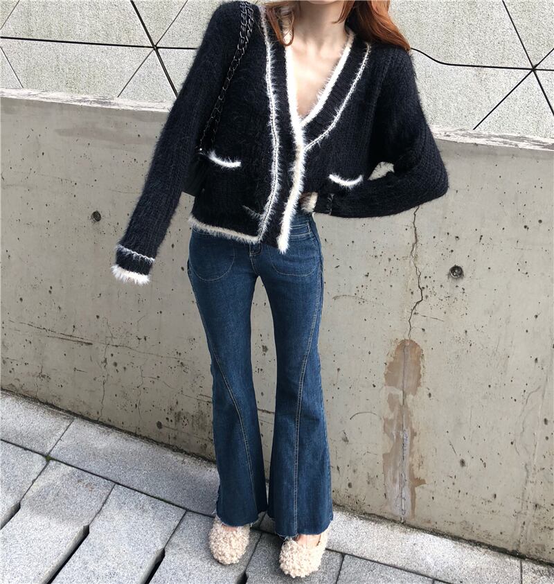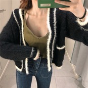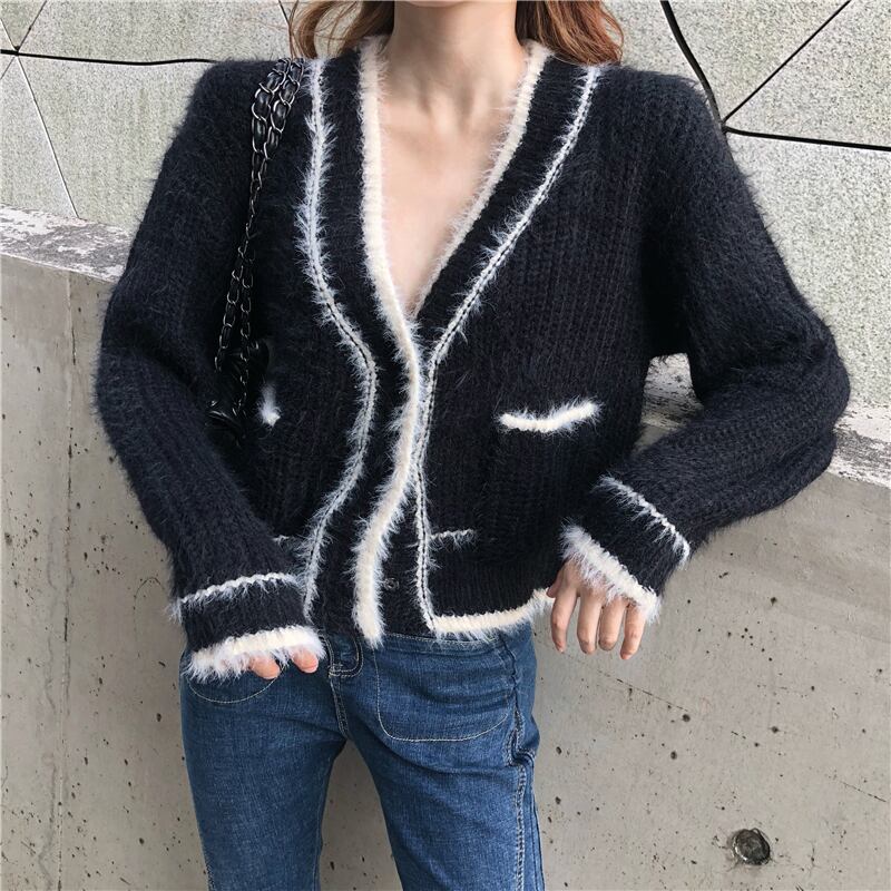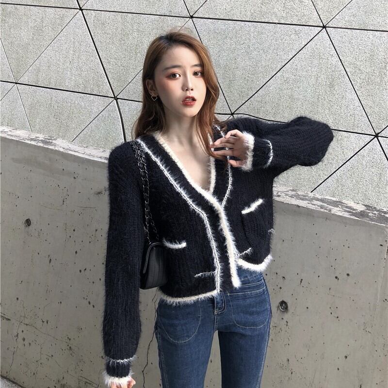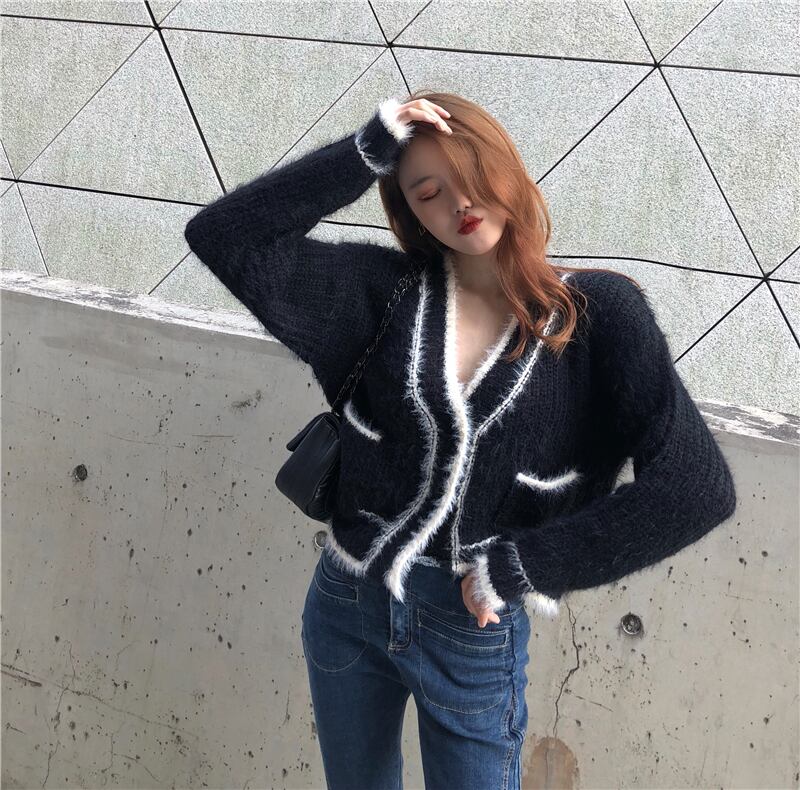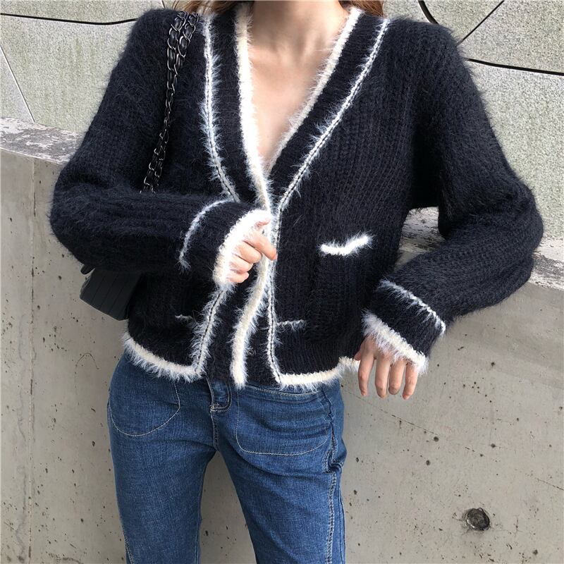 ショート丈カーディガン トップス Vネック モヘア ブラック 大人カジュアル かわいい 通学 学生 休日コーデ デート 韓国 オルチャン 秋 冬