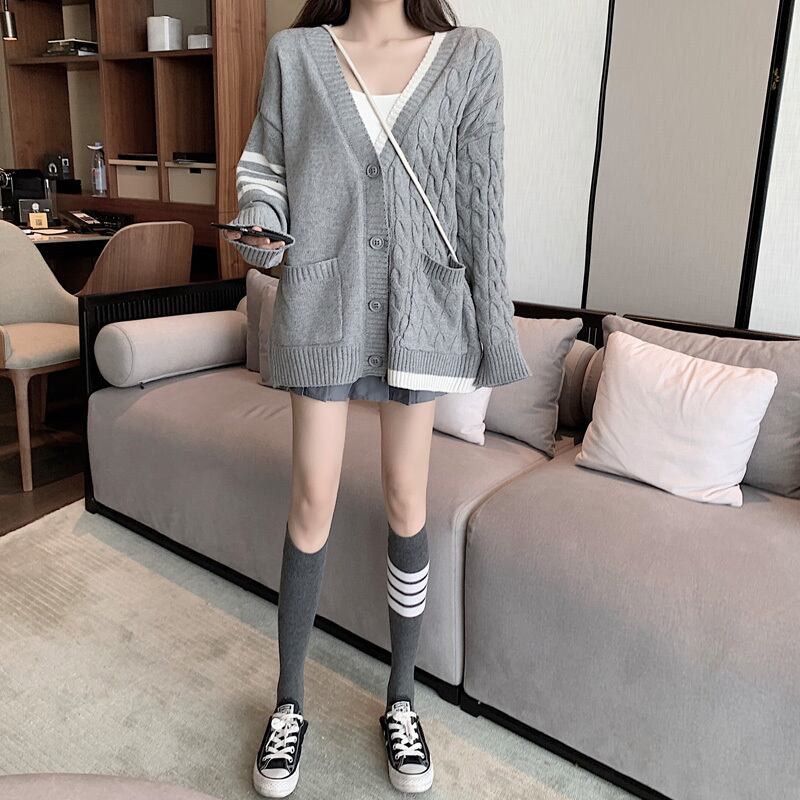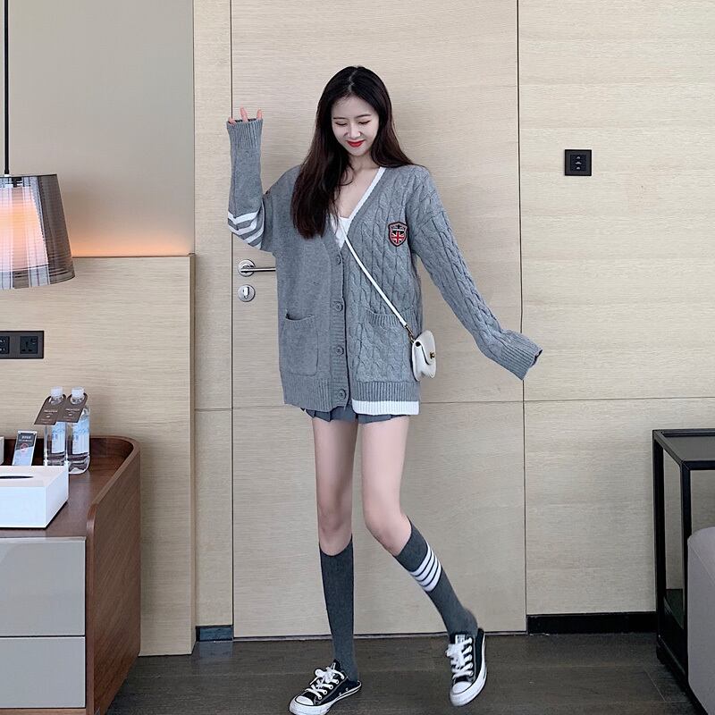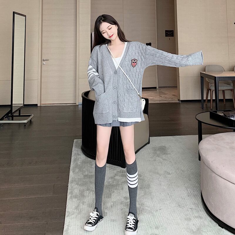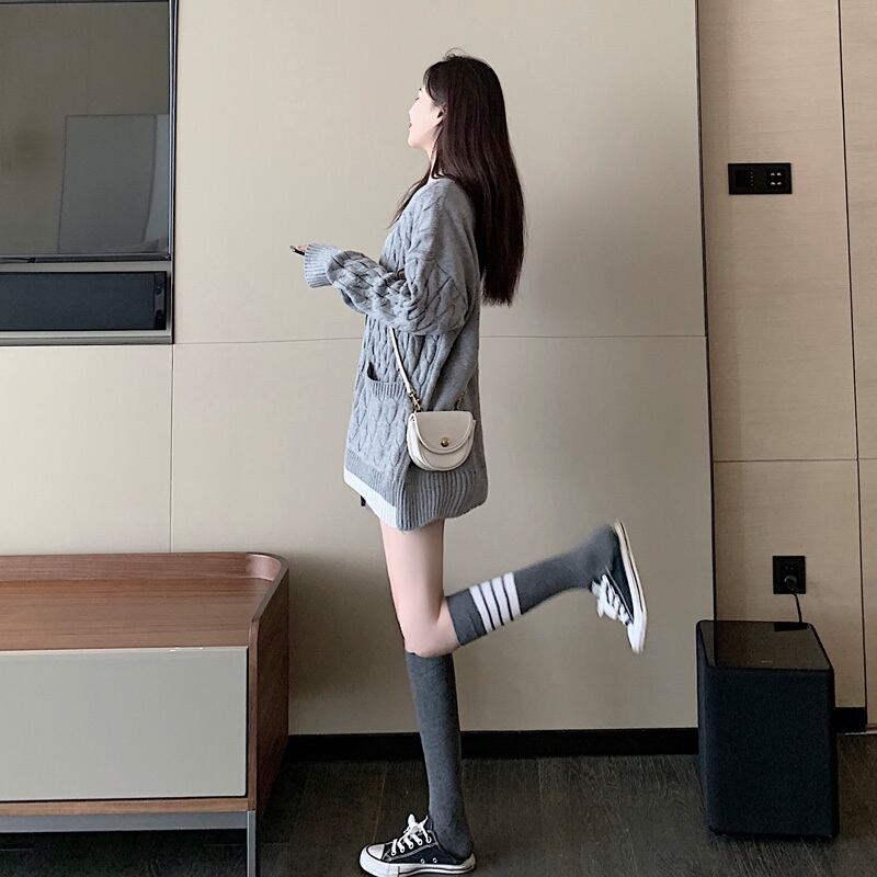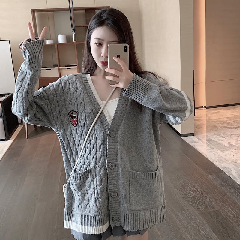 ゲージ編みカーディガン トップス 羽織 秋 冬 Vネック 長袖 ドロップショルダー 大人カジュアル ミディ丈 休日コーデ 学生 通学 韓国 オルチャン