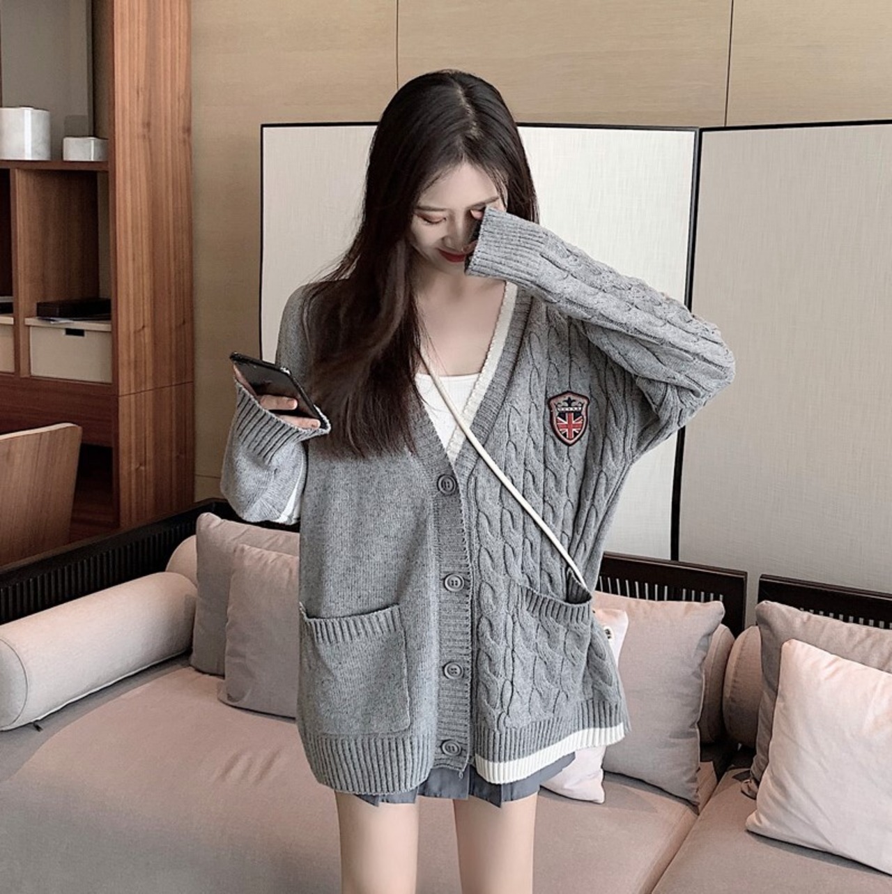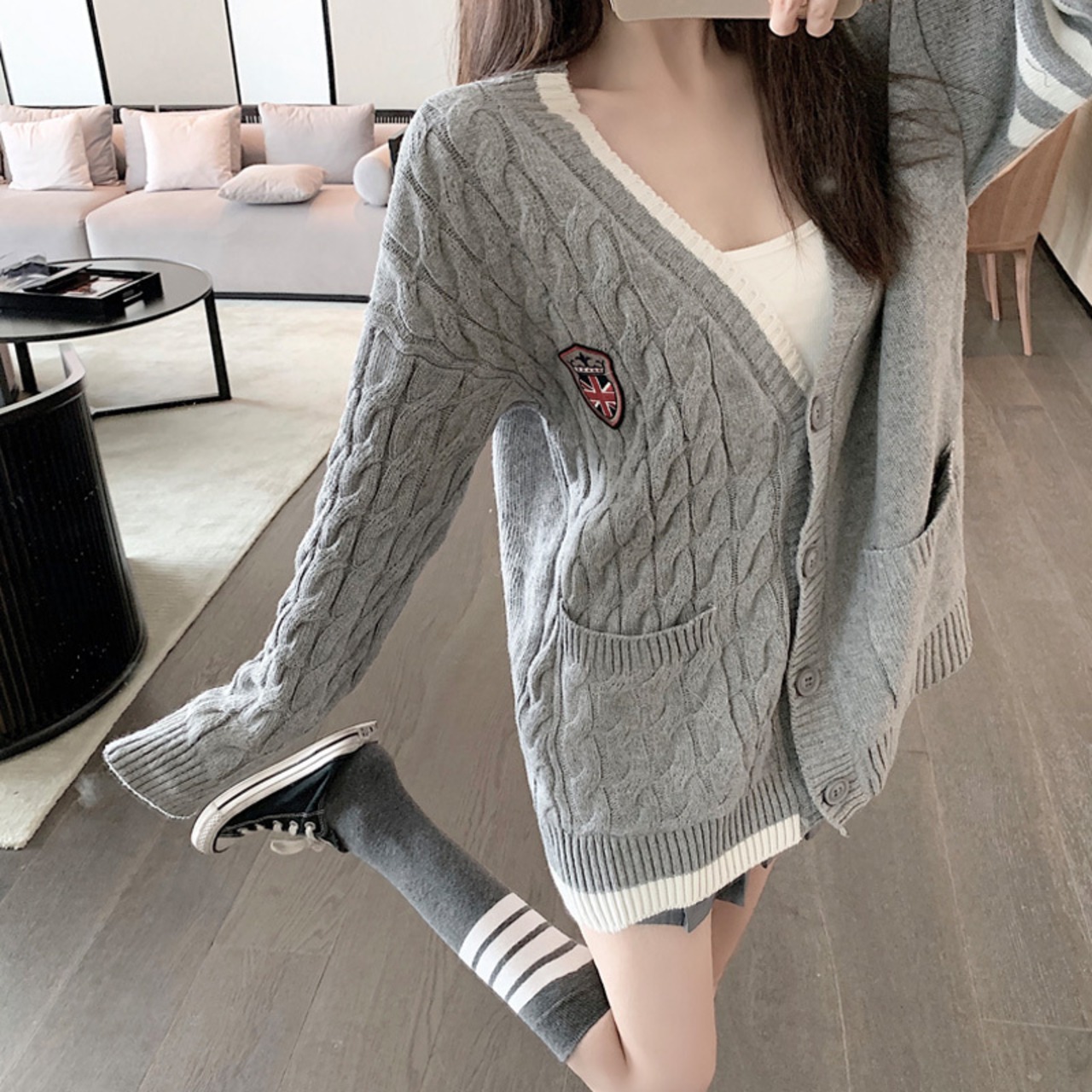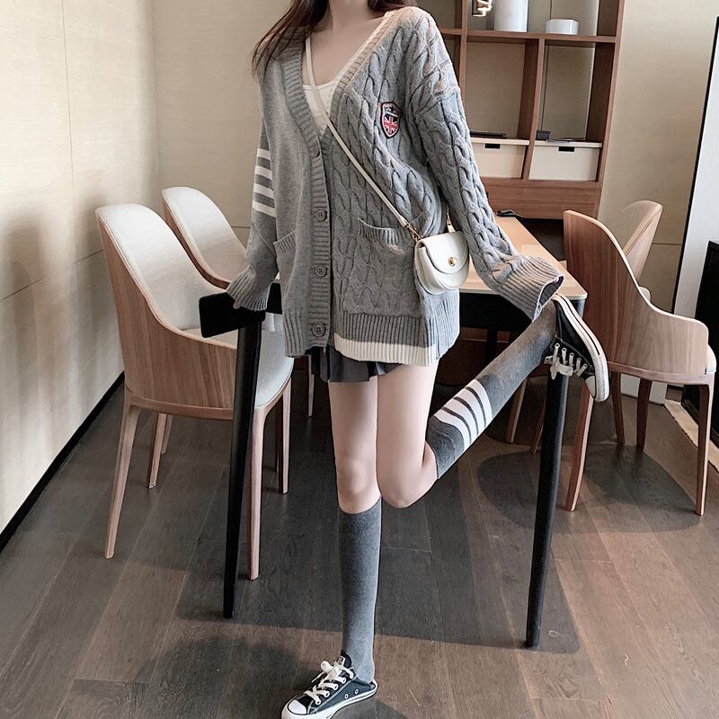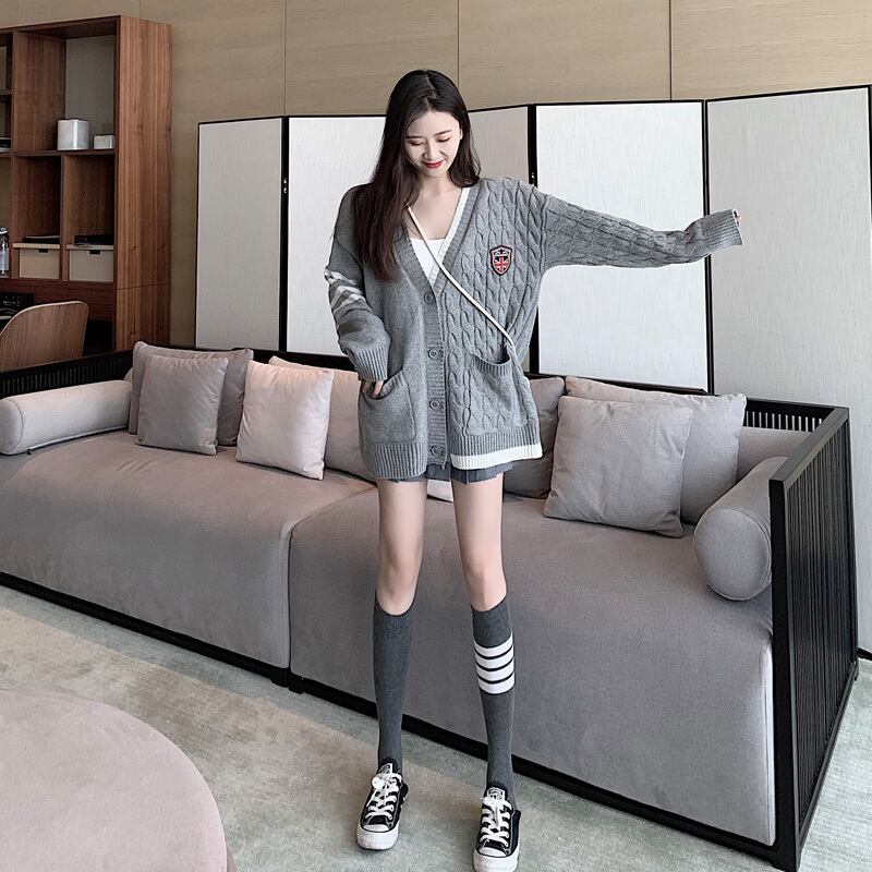 ゲージ編みカーディガン トップス 羽織 秋 冬 Vネック 長袖 ドロップショルダー 大人カジュアル ミディ丈 休日コーデ 学生 通学 韓国 オルチャン