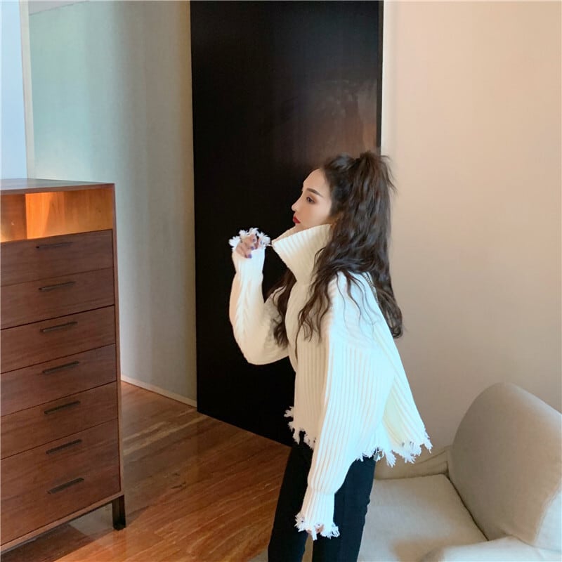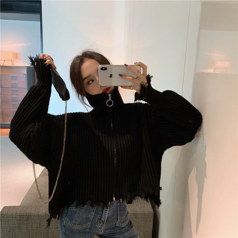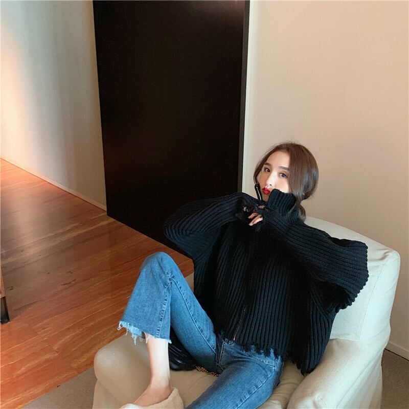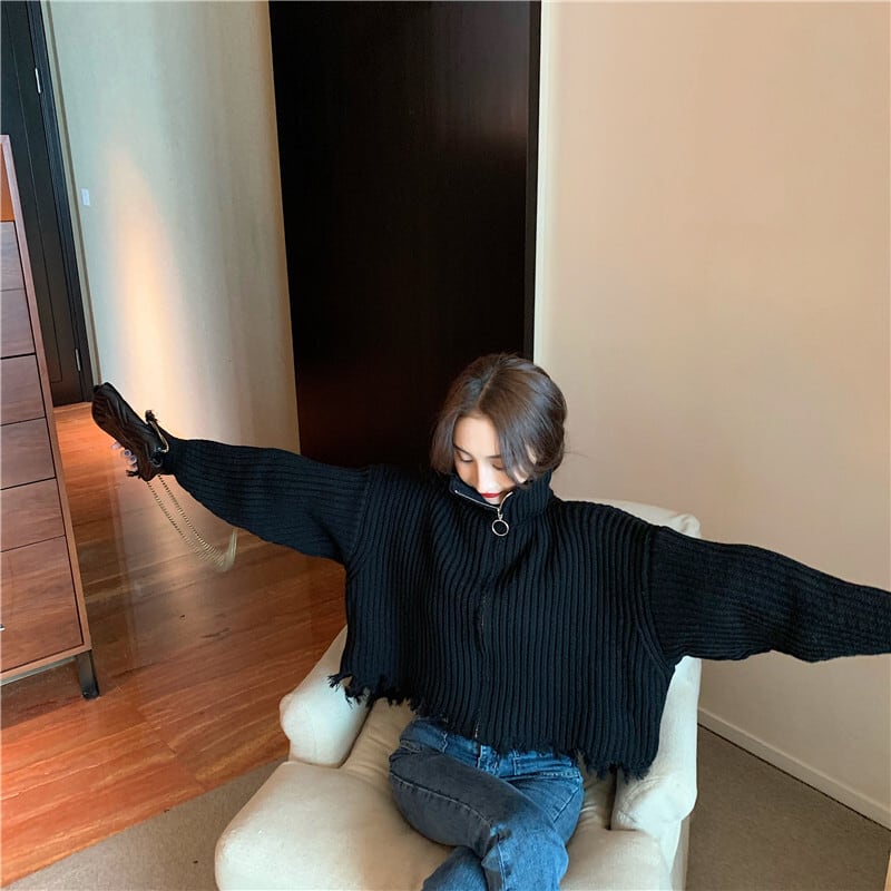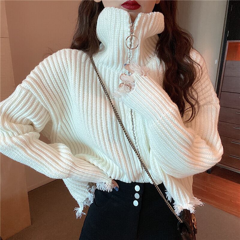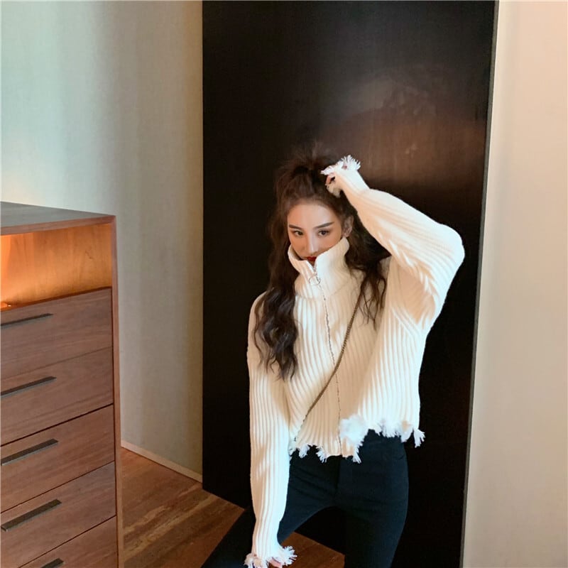 全2色 プルオーバー フロントジッパー 羽織 カーディガン ホワイト ブラック ハイネック 長袖 ドロップショルダー 秋 冬 韓国 オルチャン 大人カジュアル 切りっぱなし フリンジ