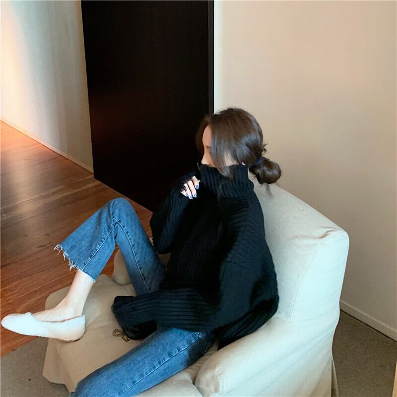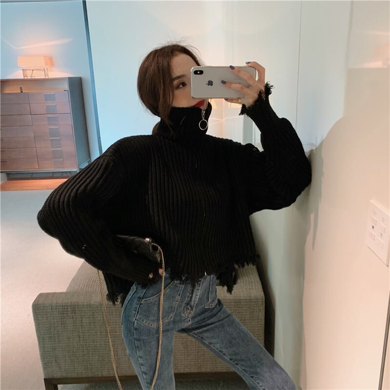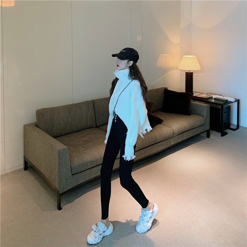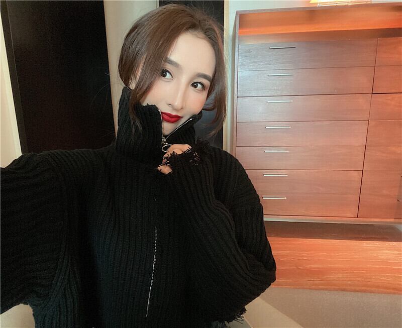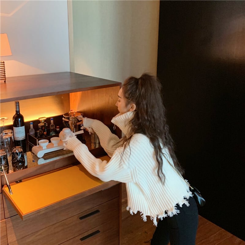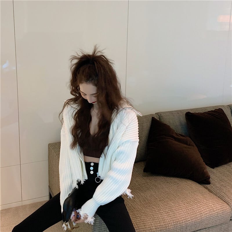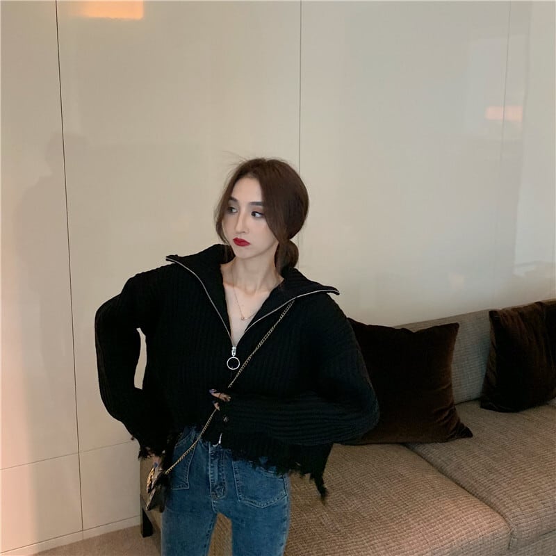 全2色 プルオーバー フロントジッパー 羽織 カーディガン ホワイト ブラック ハイネック 長袖 ドロップショルダー 秋 冬 韓国 オルチャン 大人カジュアル 切りっぱなし フリンジ