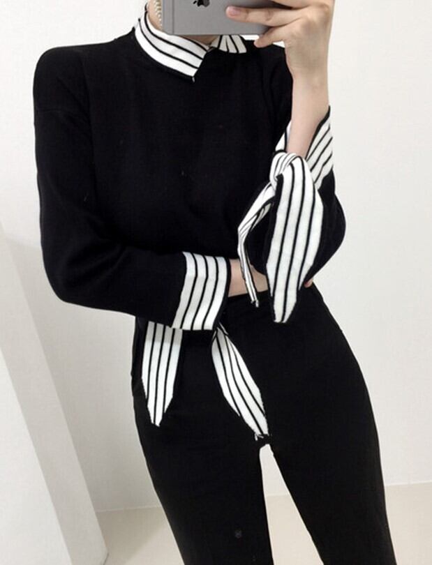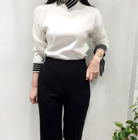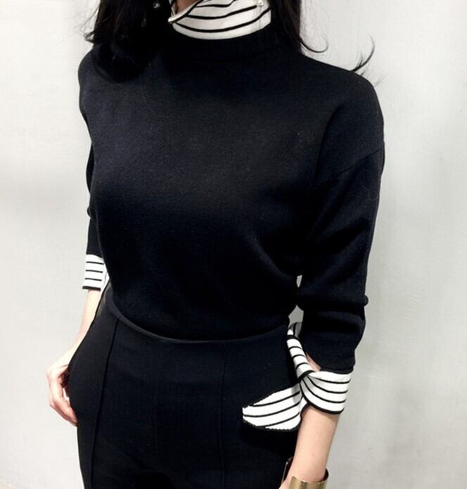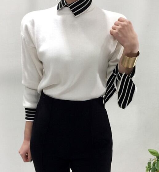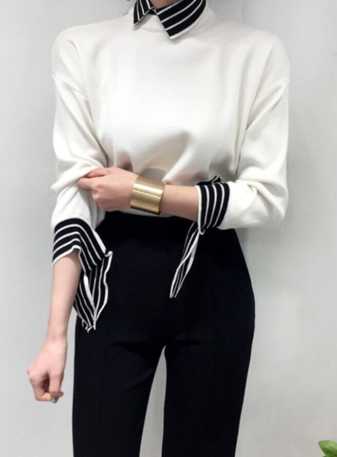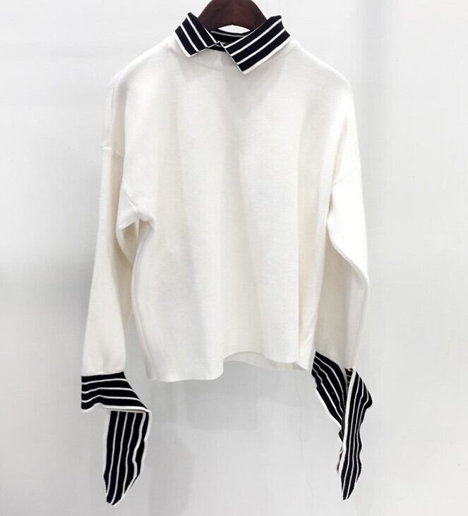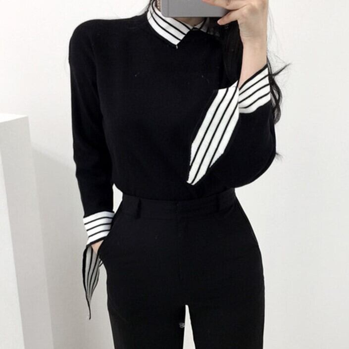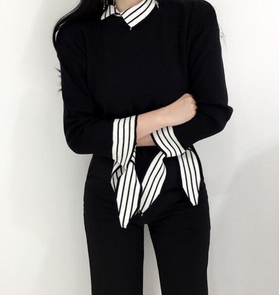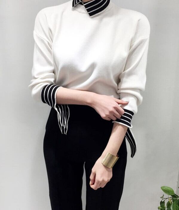全2色 ドッキングニット セットアップ風 重ね着 ブラウス ニット セーター ブラック ホワイト 上品 ベーシック 大人カジュアル 長袖 開襟 秋 冬 韓国 オルチャン