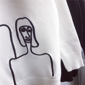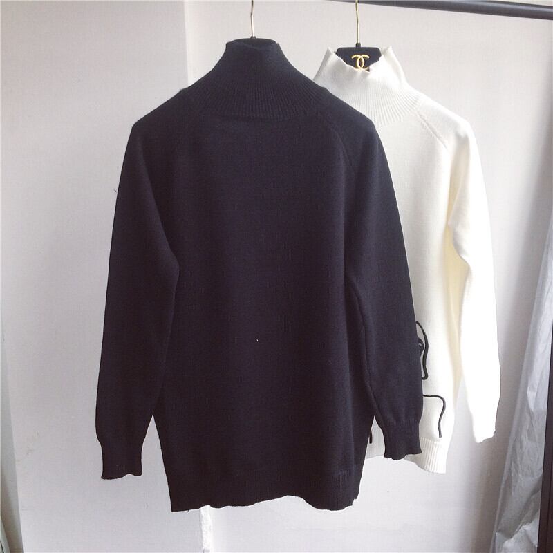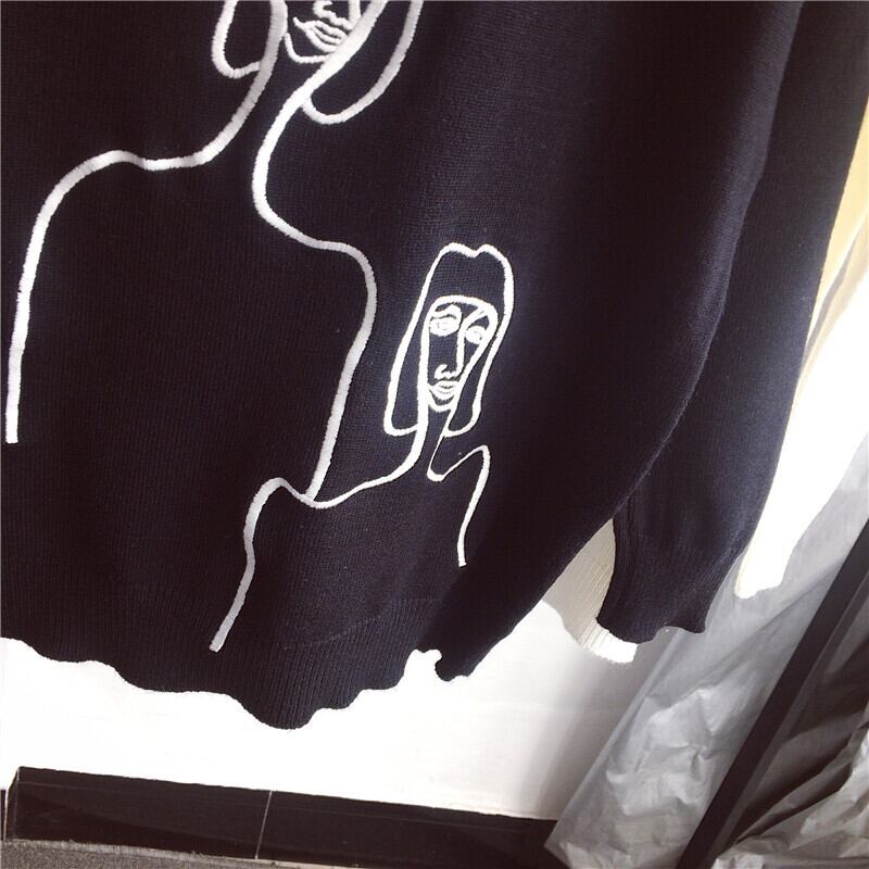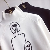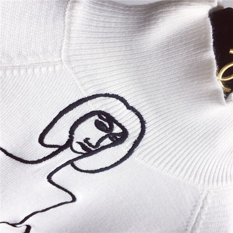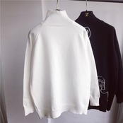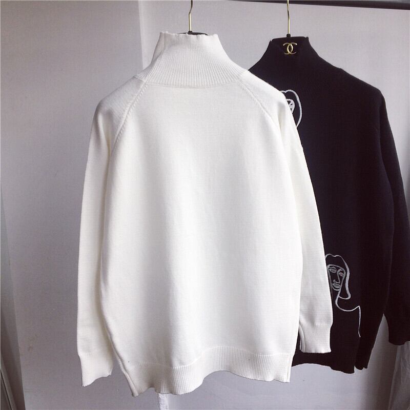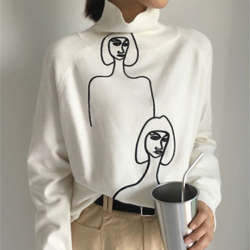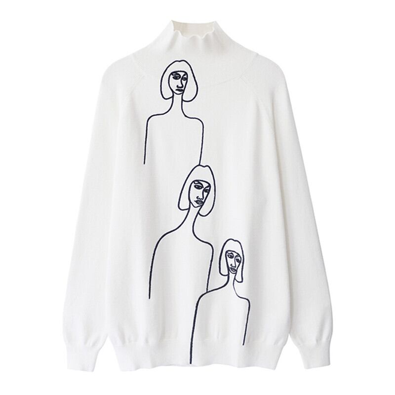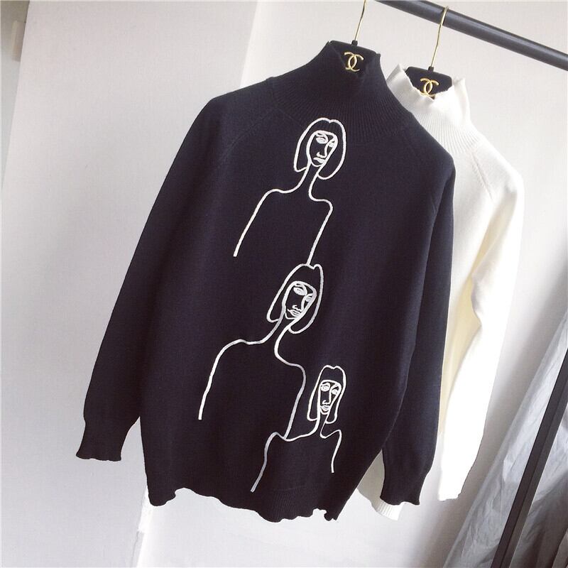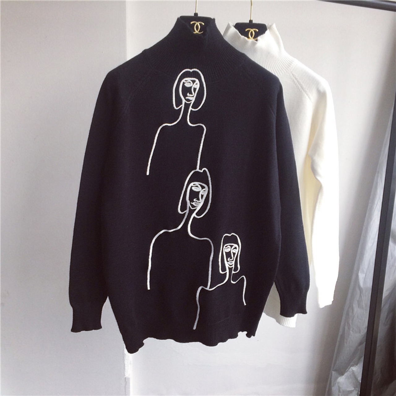 全2色 ハイネックセーター プルオーバー セーター ニット 長袖 漫画刺繍 ゆったり レトロ シンプル カジュアル お出かけ デート デイリー 普段着 秋冬 ホワイト ブラック
