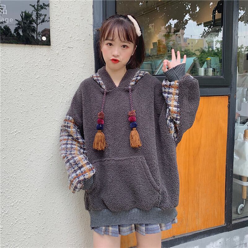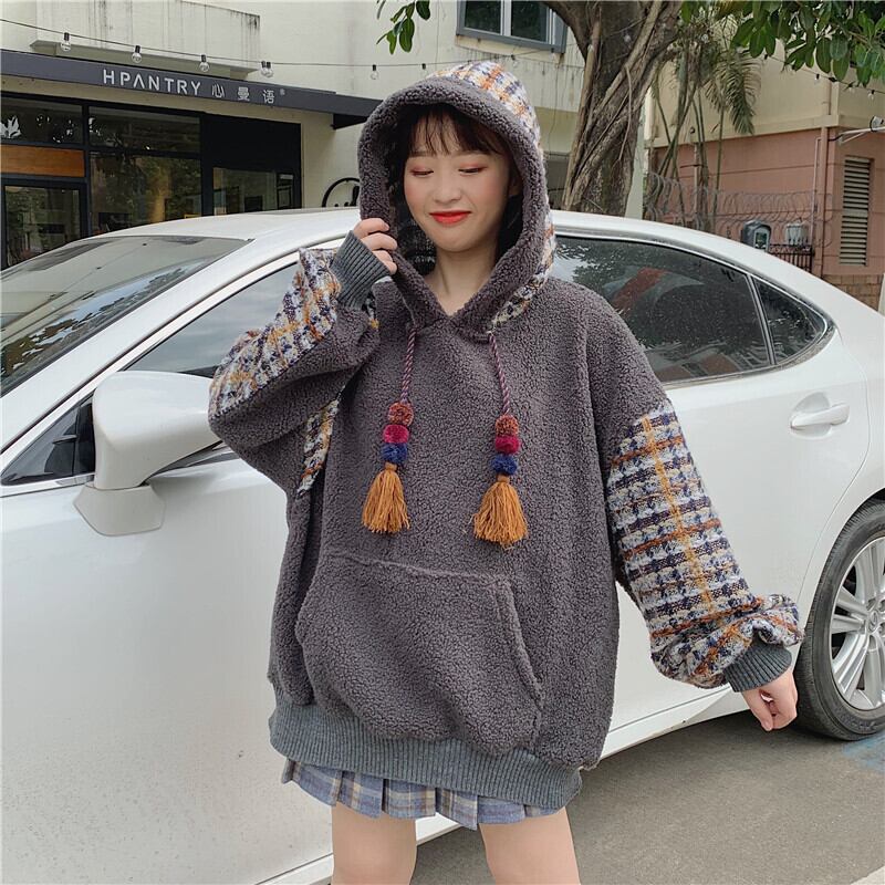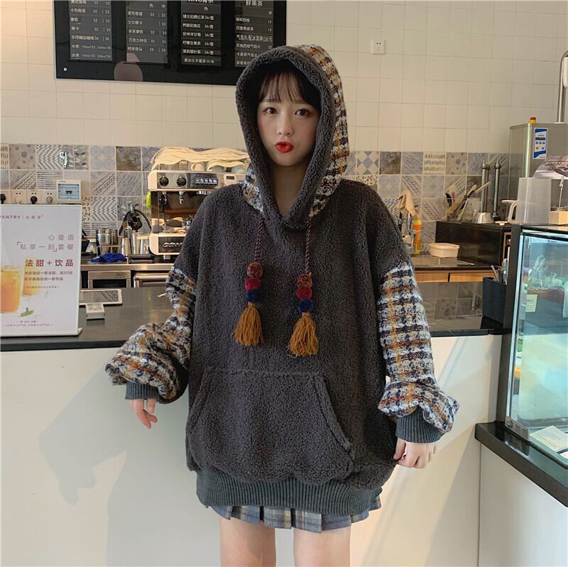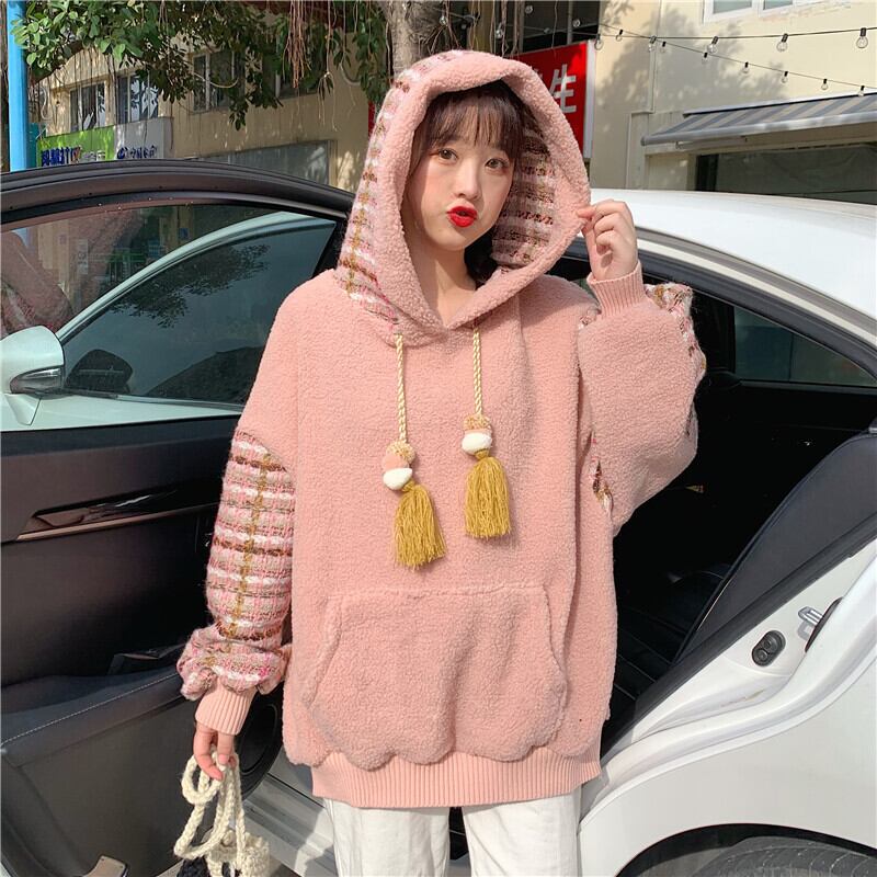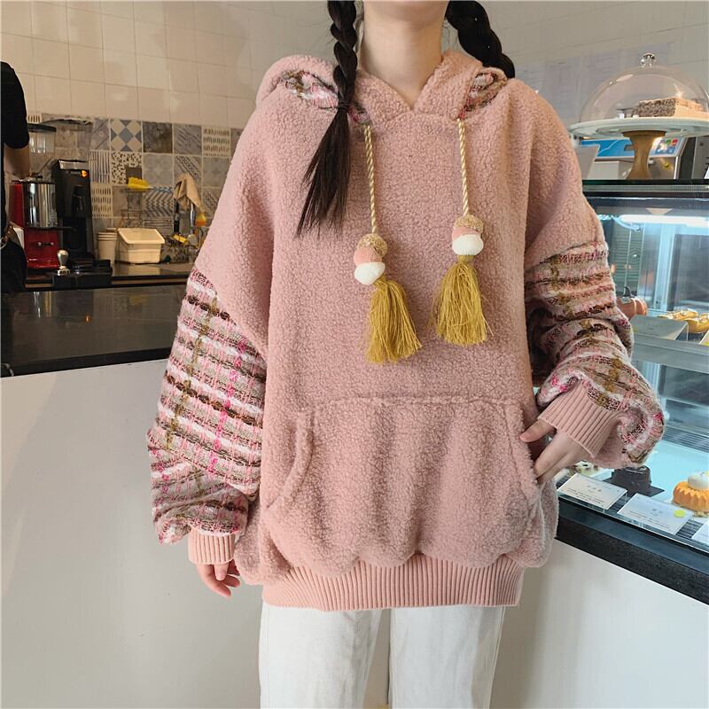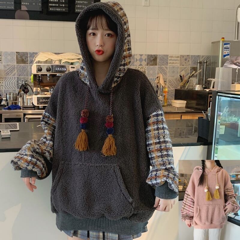 全2色 ボア チェック柄 パーカー ゆったり フーディー 暖かい 厚手 秋冬 お出かけ カジュアル ガーリー 可愛い タッセル ポンポン オーバーサイズ