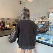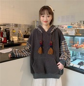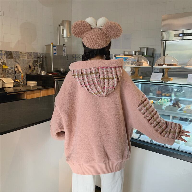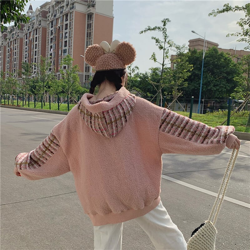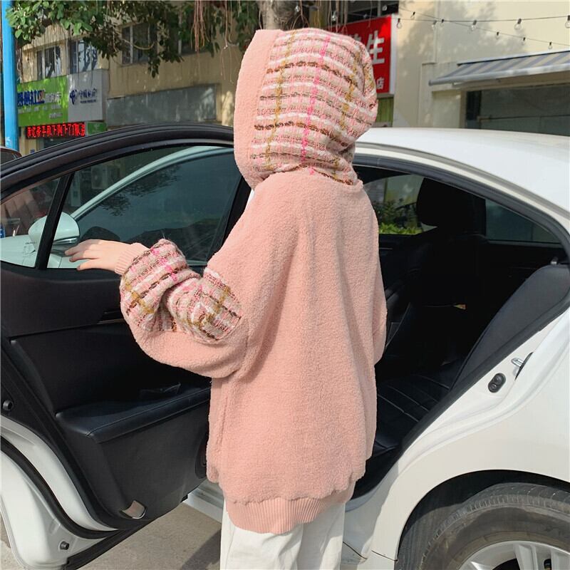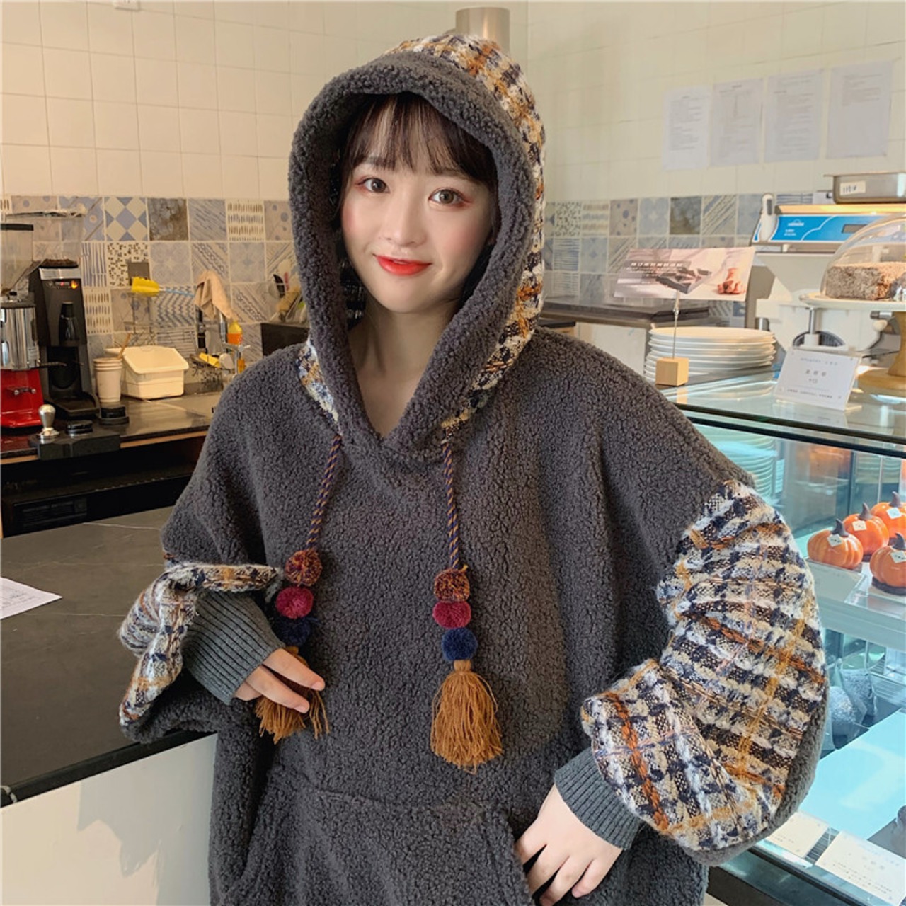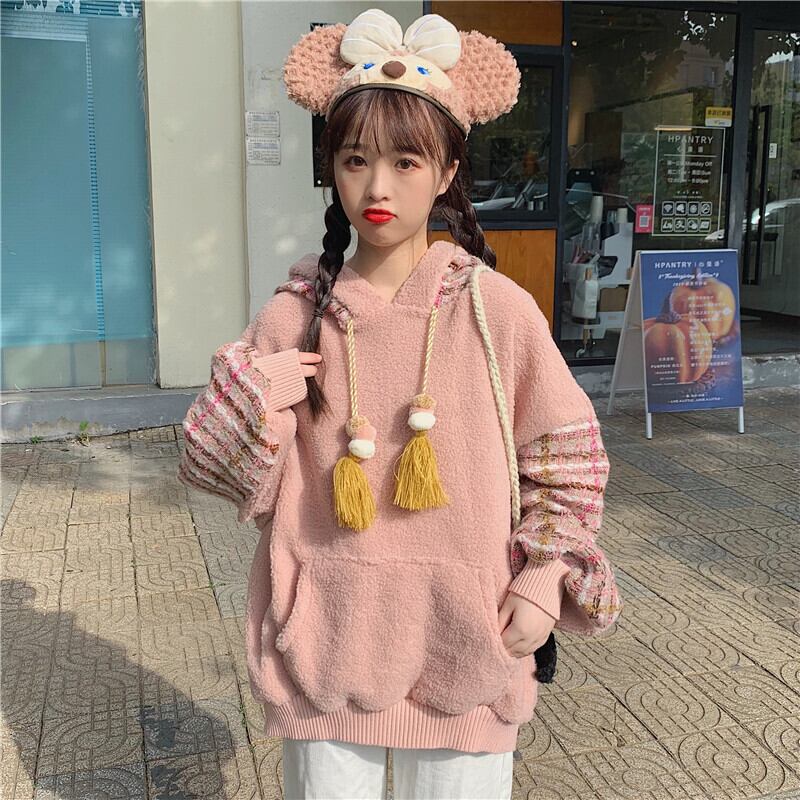 全2色 ボア チェック柄 パーカー ゆったり フーディー 暖かい 厚手 秋冬 お出かけ カジュアル ガーリー 可愛い タッセル ポンポン オーバーサイズ