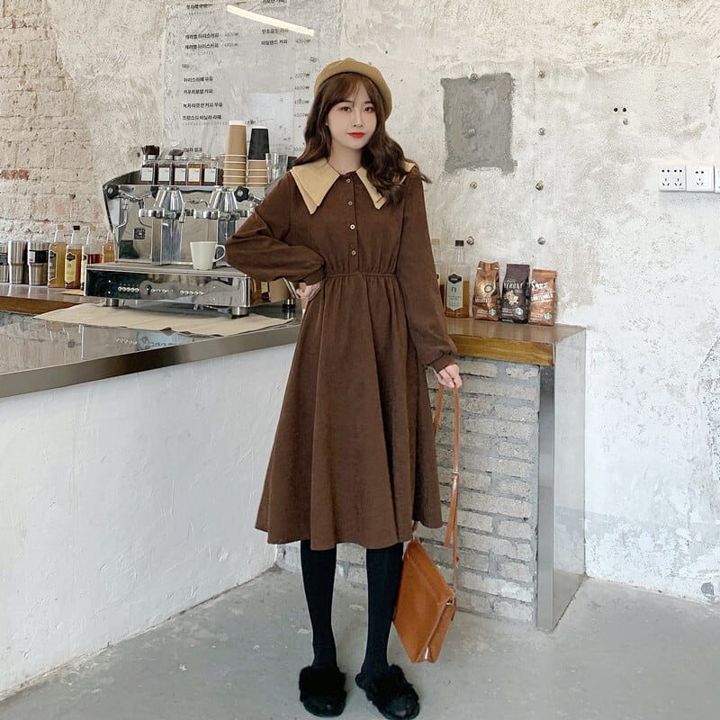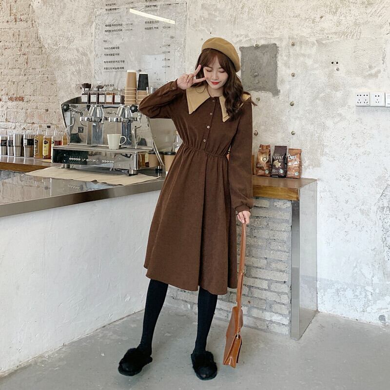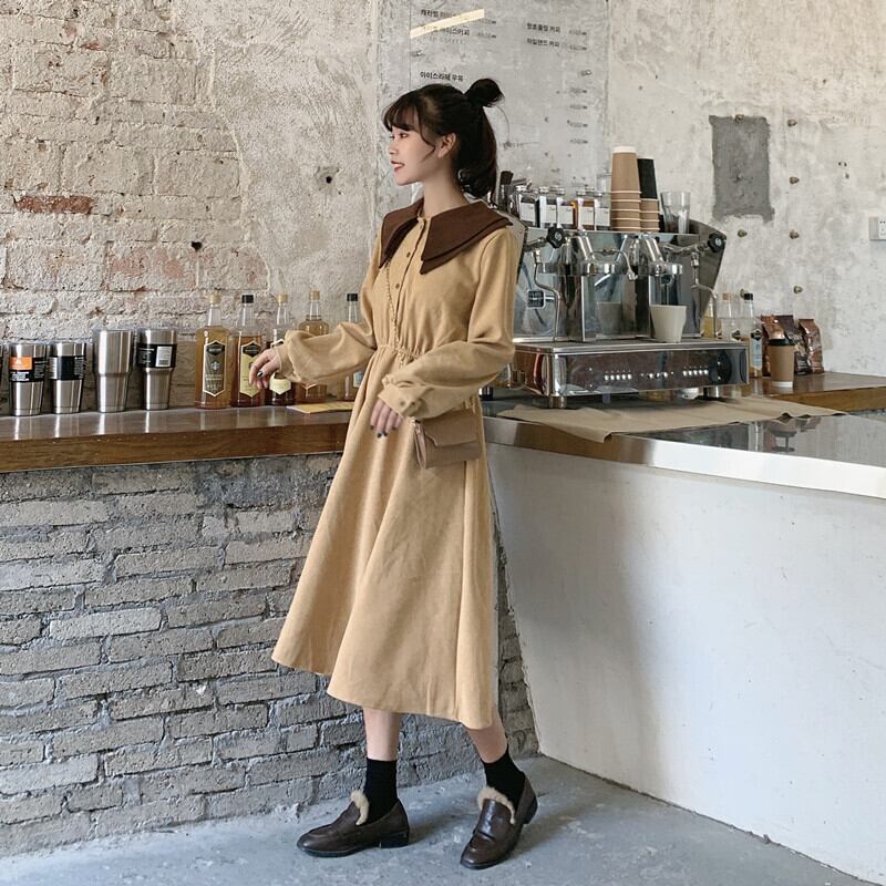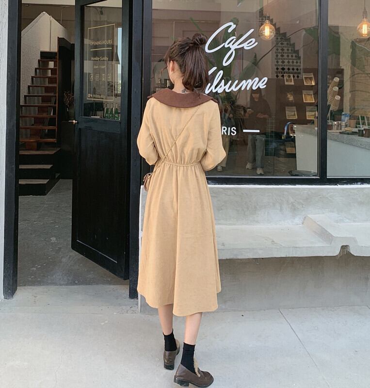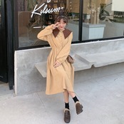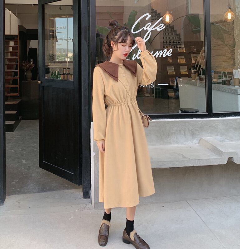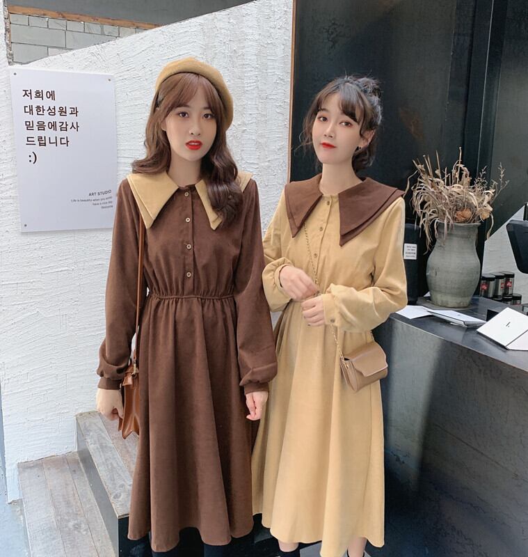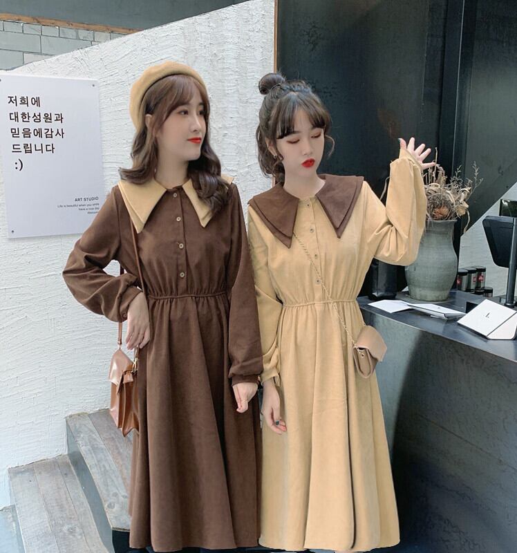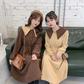 全2色 シャツワンピース ドレス ビックカラー 長袖 ブラウン ベージュ 秋 冬 大人かわいい 学生 通学 カジュアル デート 女子会 韓国 オルチャン レトロ フェミニン